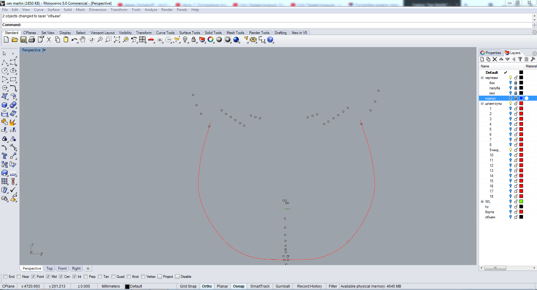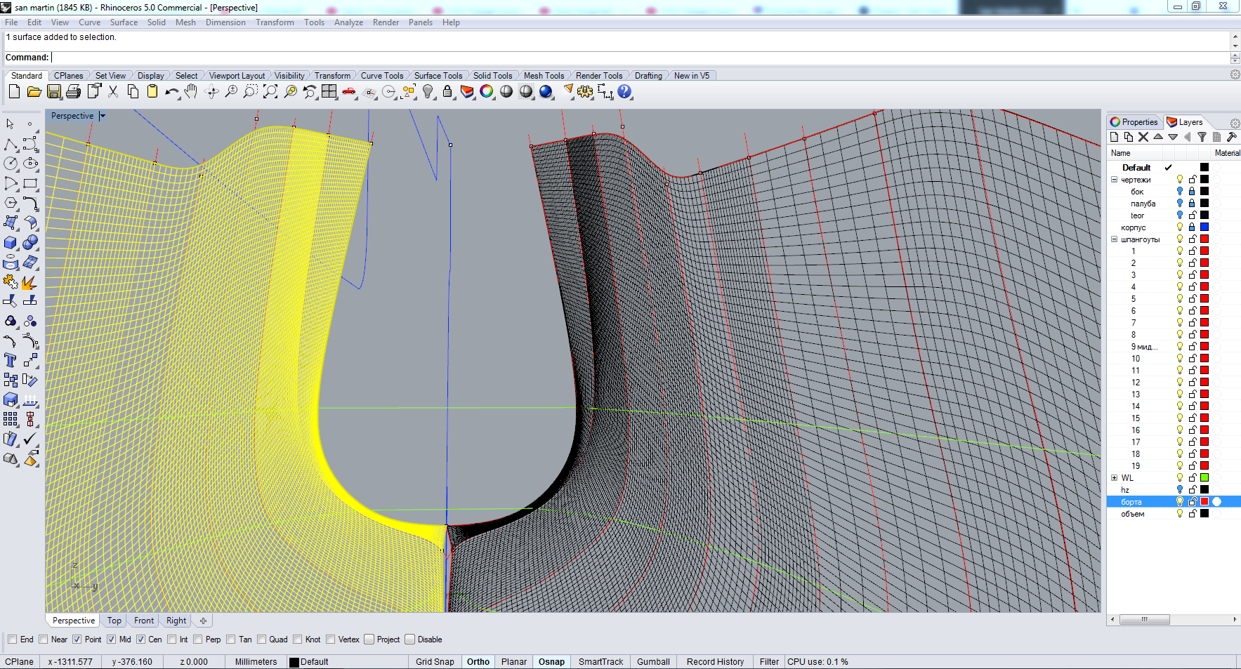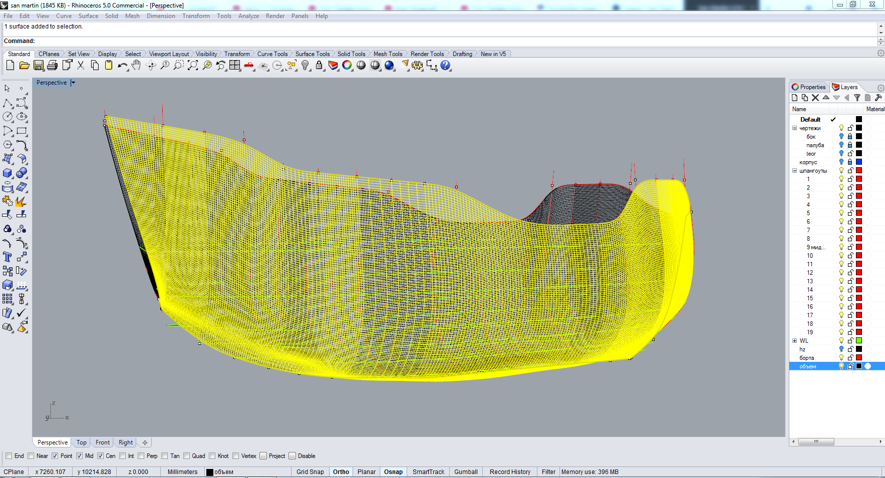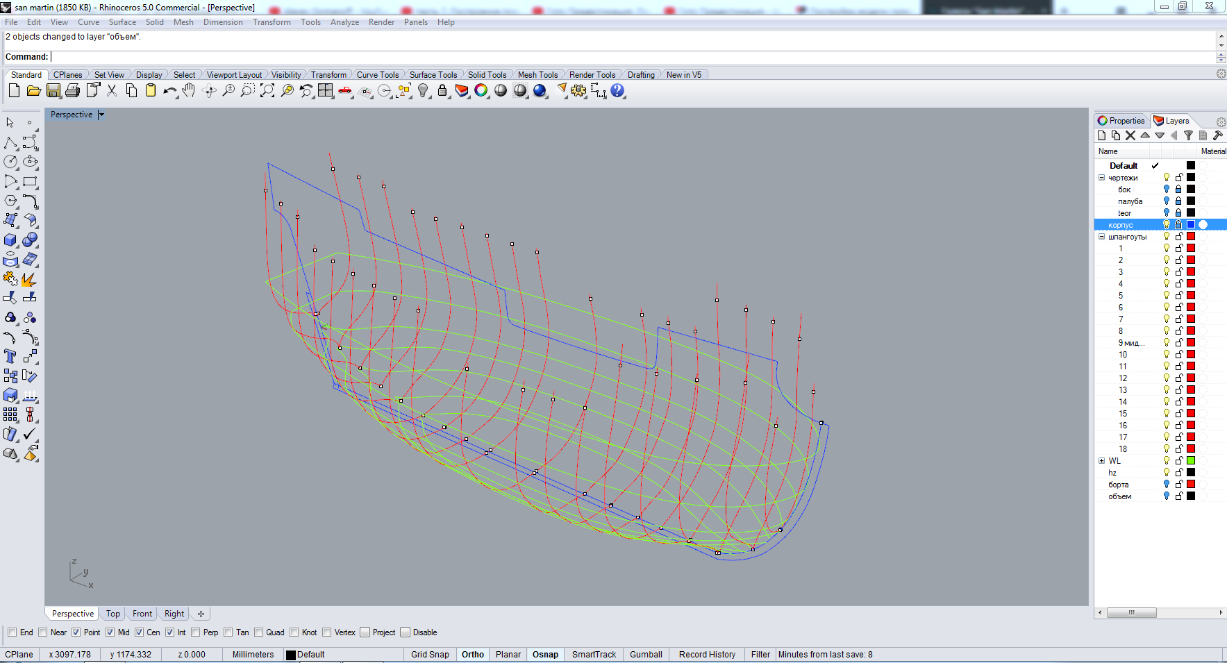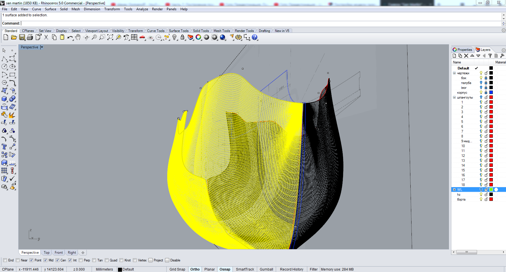 Продолжительные пляски с бубном вокруг этой программы позволили мне вчера получить первый результат - объемную модель корпуса. Картинки, может, и получились "слепые", но сделать принтскрин лучше мои навыки обращения с этой программой не позволяют. Для лучшего визуального восприятия один борт выделил желтым. Еще один нюанс: на модели планширь не будет таким волнообразным, просто я не сумел (да и не старался) его в программе отрисовать должным образом - для процесса в целом это не имеет ровным счетом никакого значения. Основной упор я сделал на точную состыковку линий шпангоутов и ватерлиний. На представленной модели они совпадают по всем точкам - где шпангоуты подтягивал к ватерлиниям, где наоборот. Всем линии выровнены для их плавности.