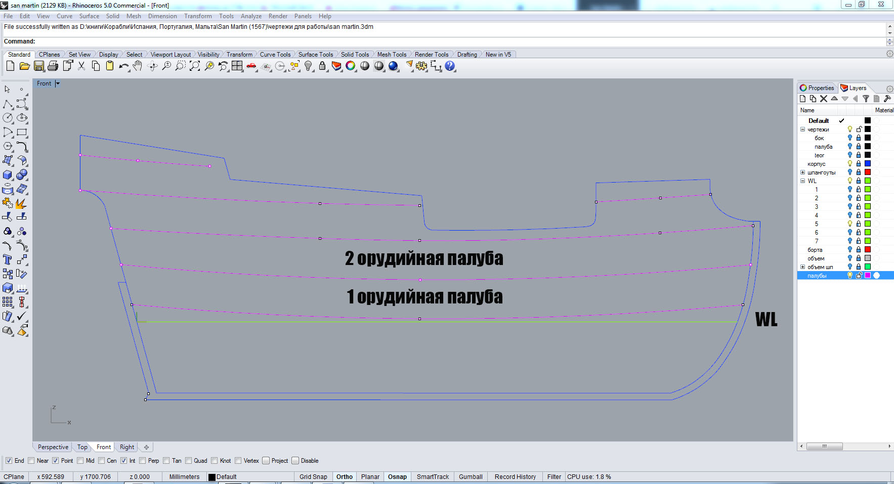 Все эти правки превратили имеющиеся чертежи в набор абсурда (после моего вмешательства в них ничего не сходилось из того, чему полагалось это делать). Решение этой проблемы я нашел в интернете - 2 чудесных выдеогайда по превращению электронных чертежей в 3д модель! Огромное спасибо их авторам! Даже такой чайник в этом вопросе как я сумел за полторы недели построить модель корабля по откорректированным в Фотошопе чертежам!!! Вот только я еще не знаю, получится ли у меня выгрузить из программы и распечатать конечный итог, до этого этапа я еще не дошел.