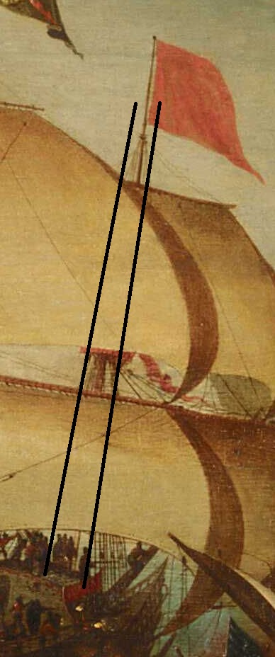 Снизу только снасти идут - выше мачта коричневого цвета и более широкая. Если продолжить ее проекцию вниз, то она должна проходить по левой стороне прямоугольника, который ты нарисовал) Допускаю, что моменте, изображенном на картине, произошел пушечный залп, и мачту заволокло пороховым дымом...