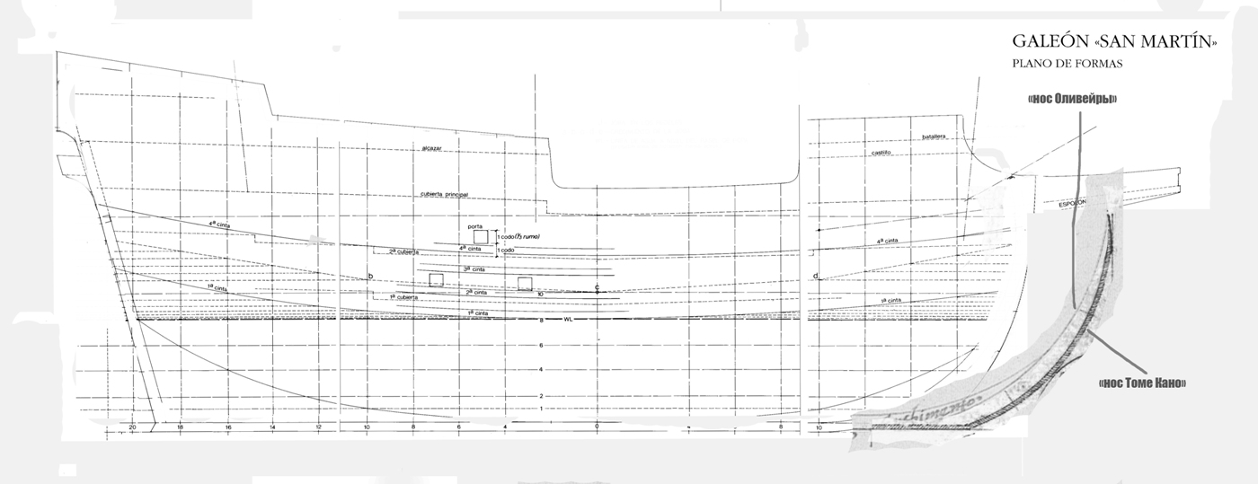 У меня получилось вложить модель во все прописанные выше пропорции. Правильным решением итоге оказался эскиз Оливейры - как только его приложил, паззл из нужных точек тут же сложился. Внутренняя часть форштевня в точности повторяет эскиз оливейры, внешняя - Кано. Это сделал чисто по эстетическим соображениям - мне так больше нравится (на чертеже во всяком случае), но если не прав - могу сделать просто симметричным.