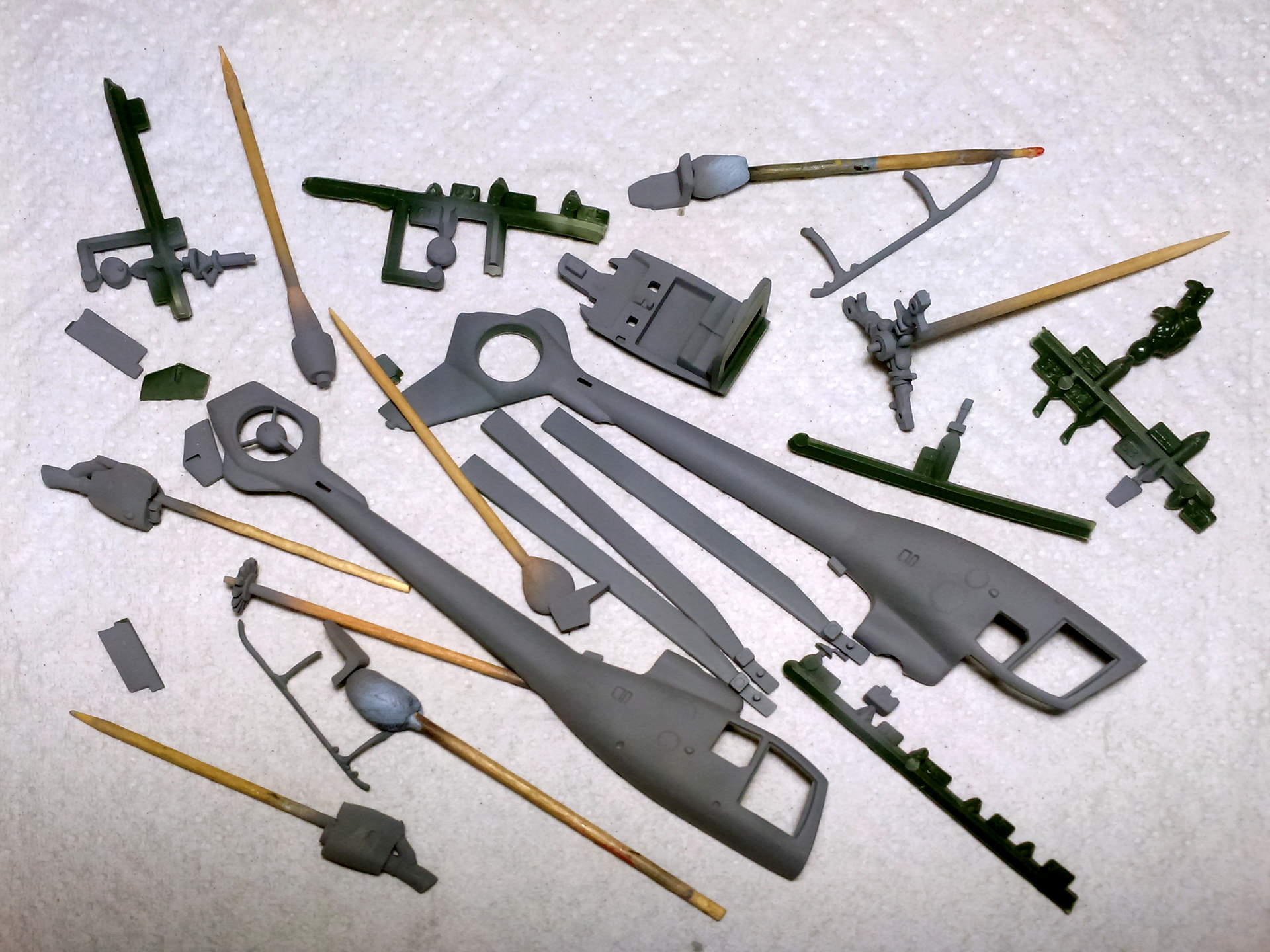 Для начала отделяю все детали от литников, благо их ну ооооочень не много, и тщательно всё зачищаю и обрабатываю от облоя.