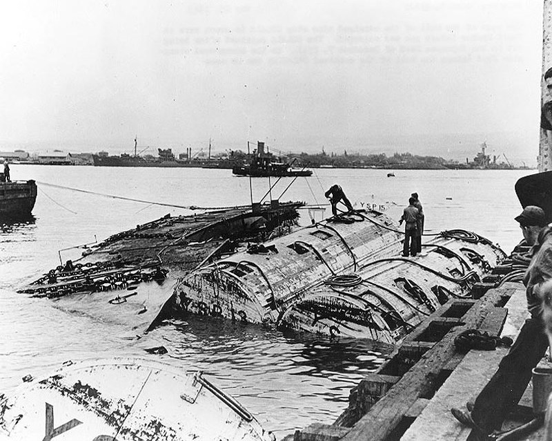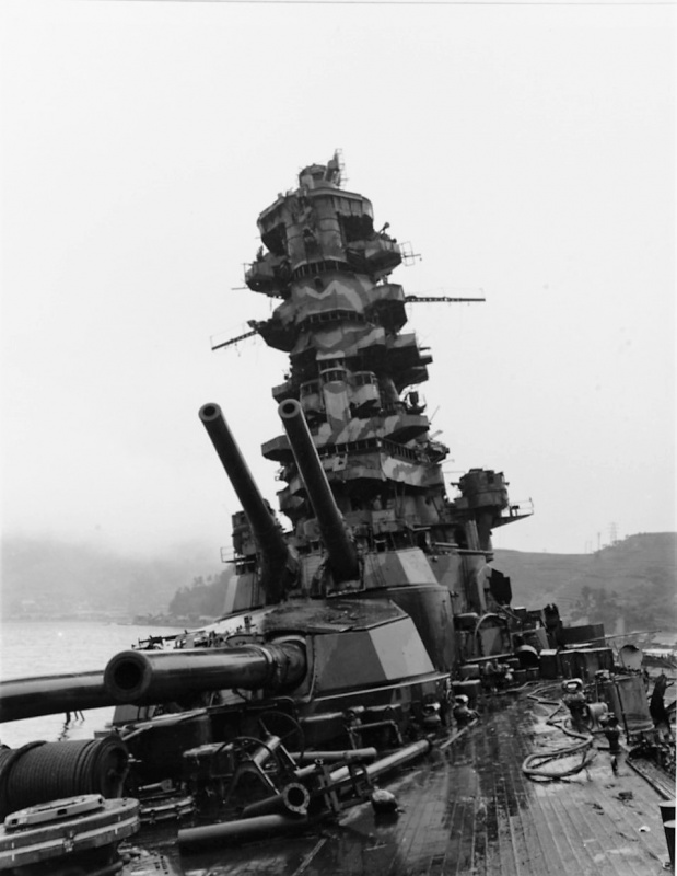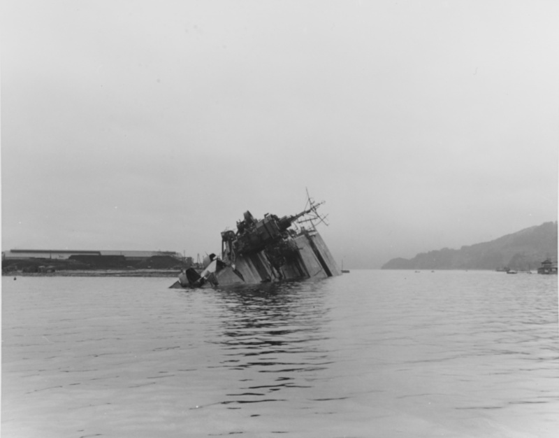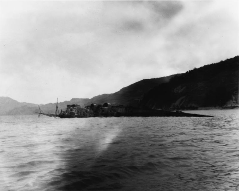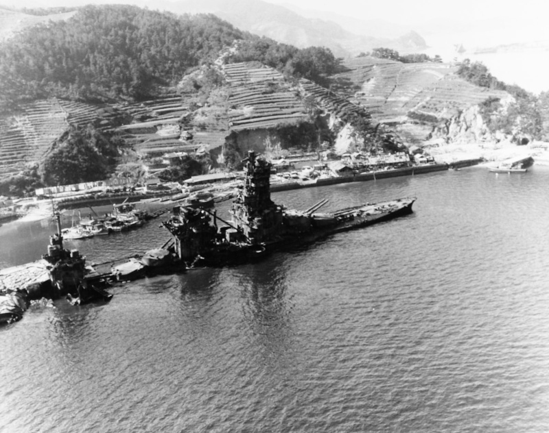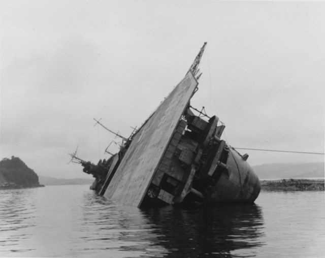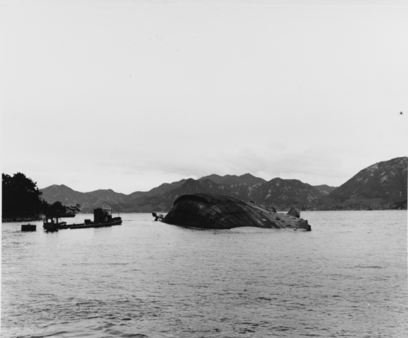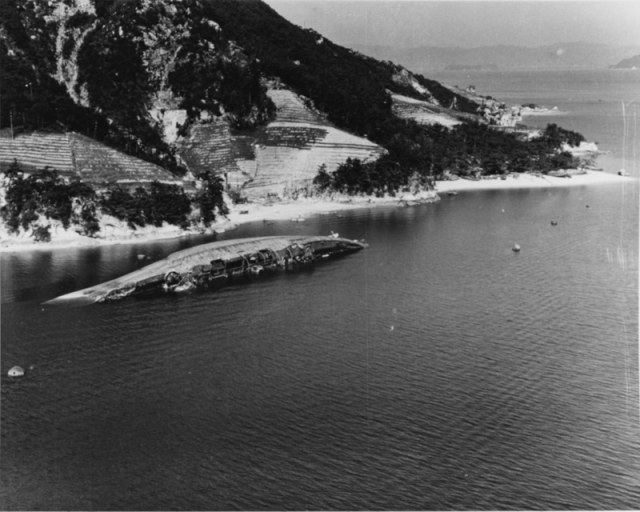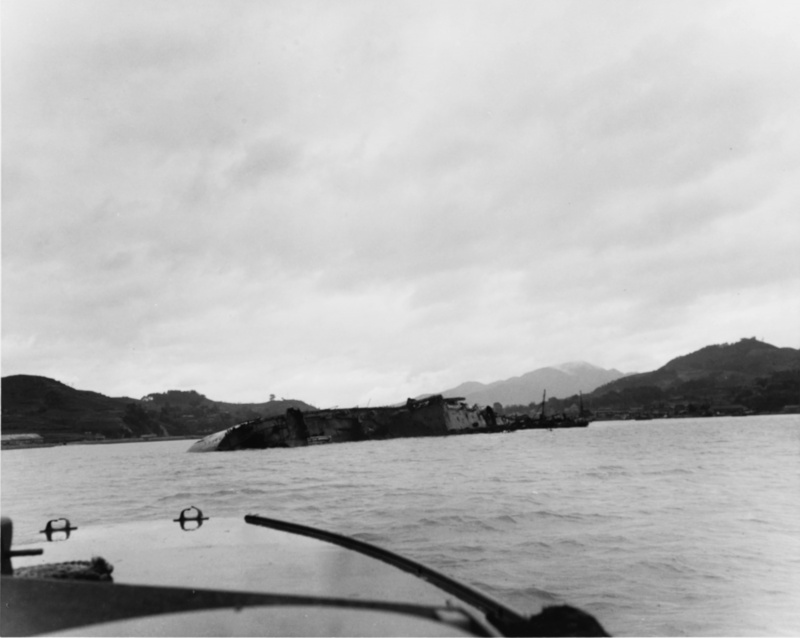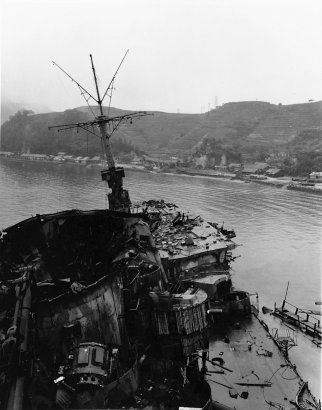 Японский легкий крейсер "Ойодо", лежащий на бравом борту на мелководье в акватории военно-морской базы Курэ. Затонул 28 июля 1945 года после 8 попаданий бомб с американских палубных самолетов.