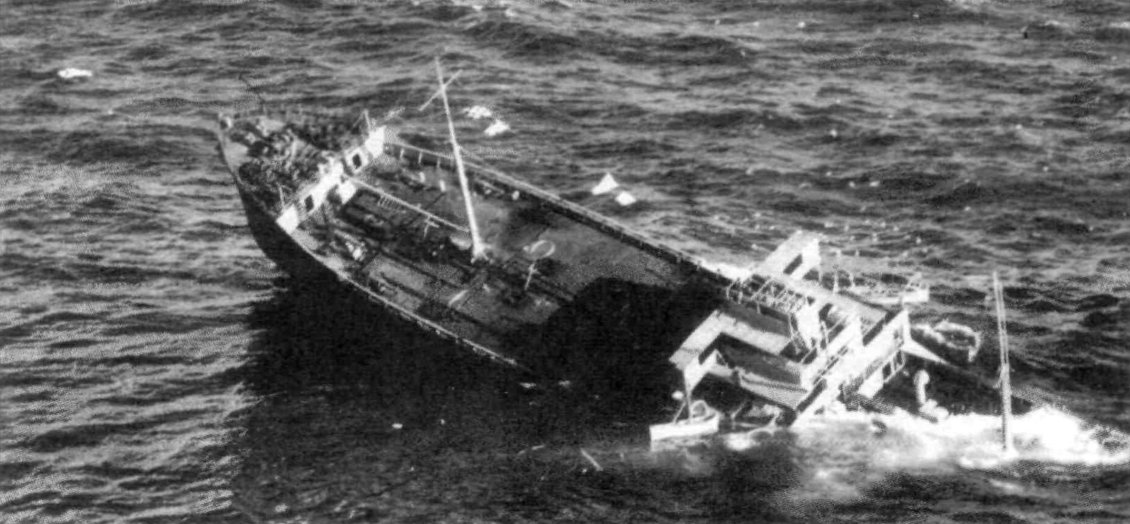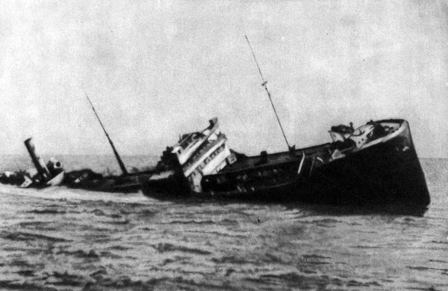 Тонущий финский пароход SS "Margareta",по ошибке торпедированный немецкой подводной лодкой U-46 в Бискайском заливе 9 июня 1940 году.