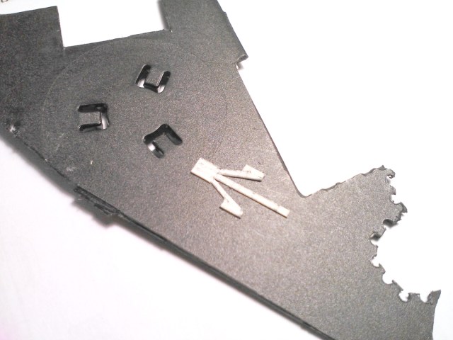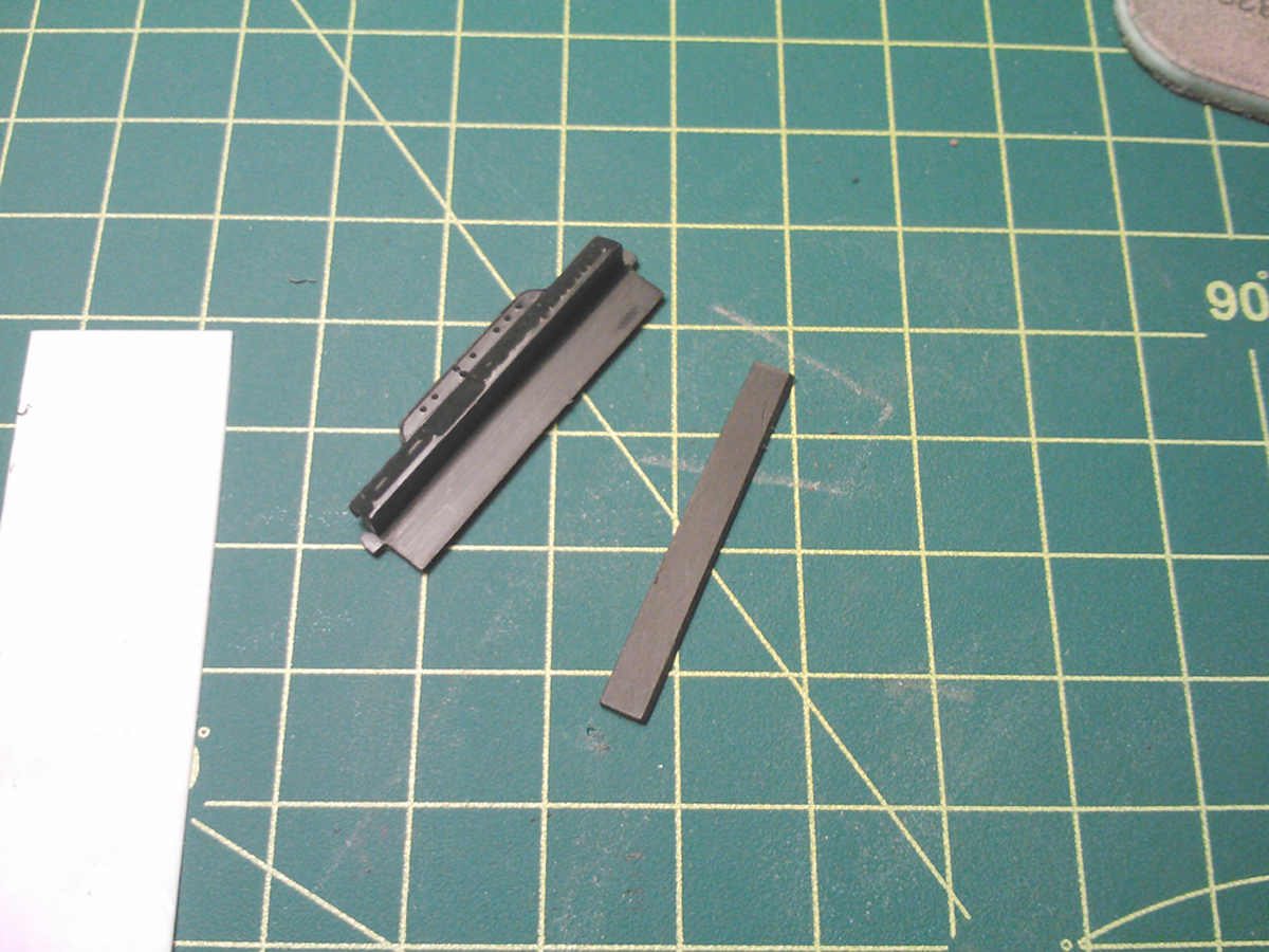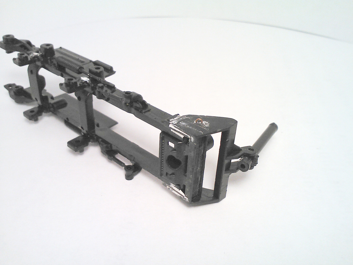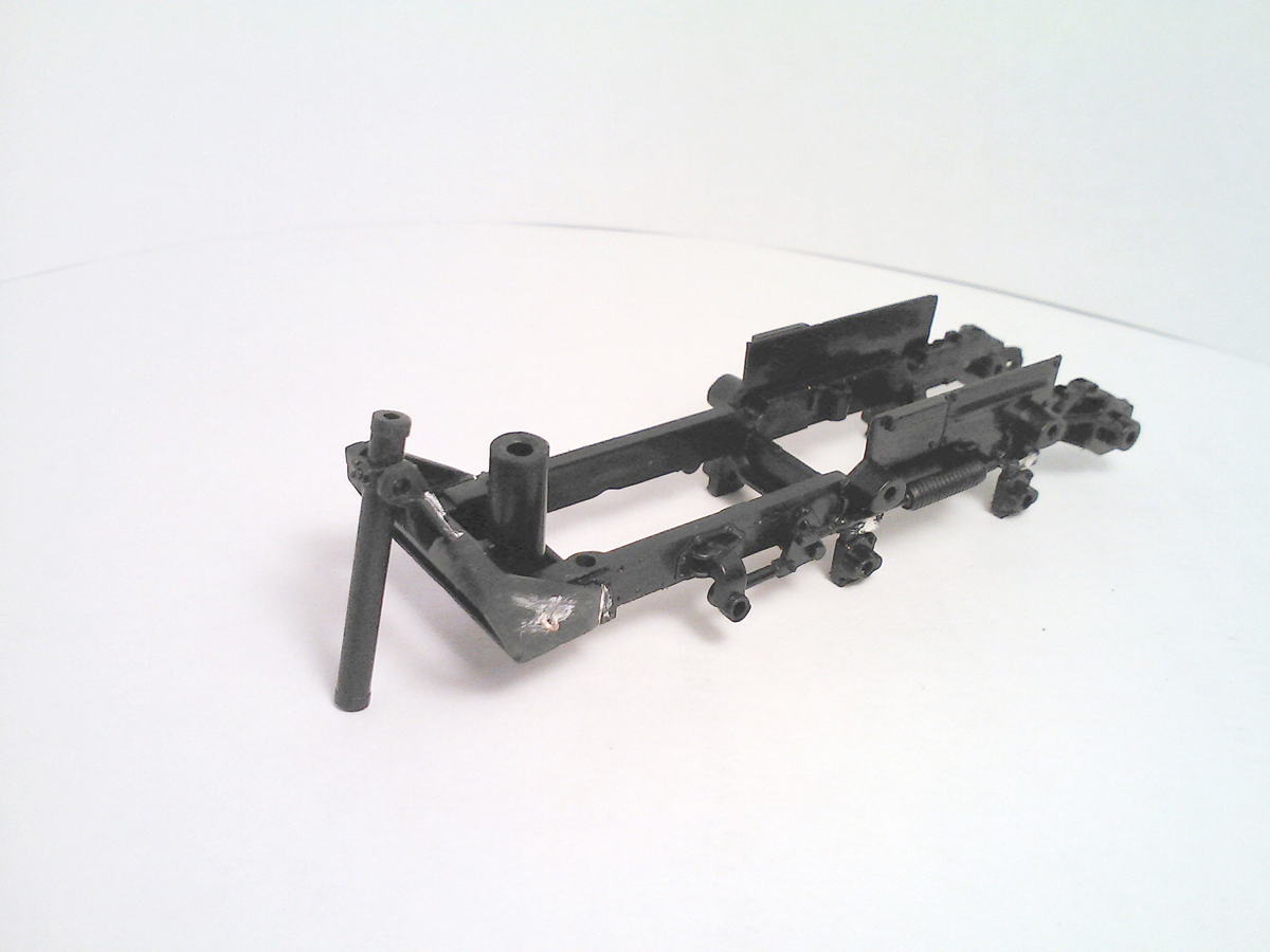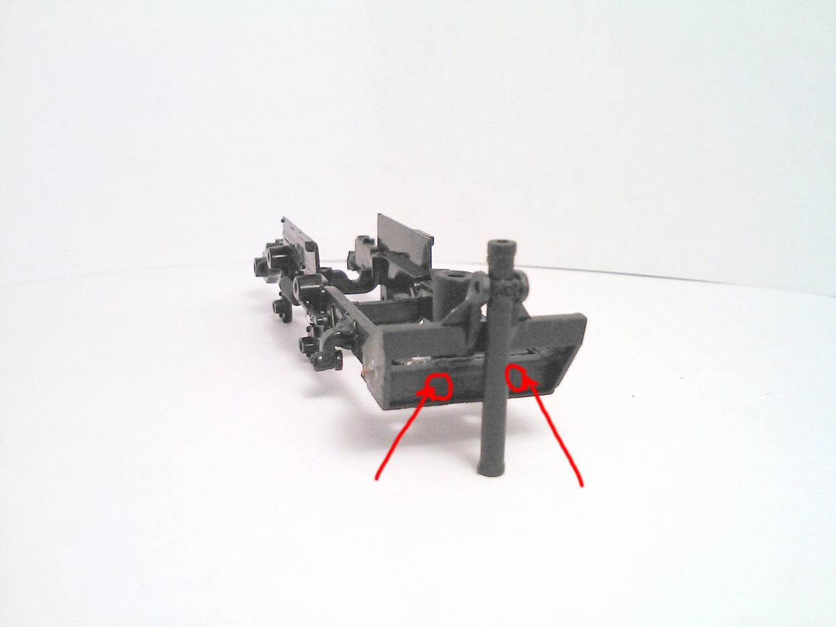 Сразу скажу на модели эта деталь косячная, на переднем швеллере зачем-то отлиты два огромных круга вместо крепежных болтов (на фото они уже срезаны, отметил красным цветом где они были).