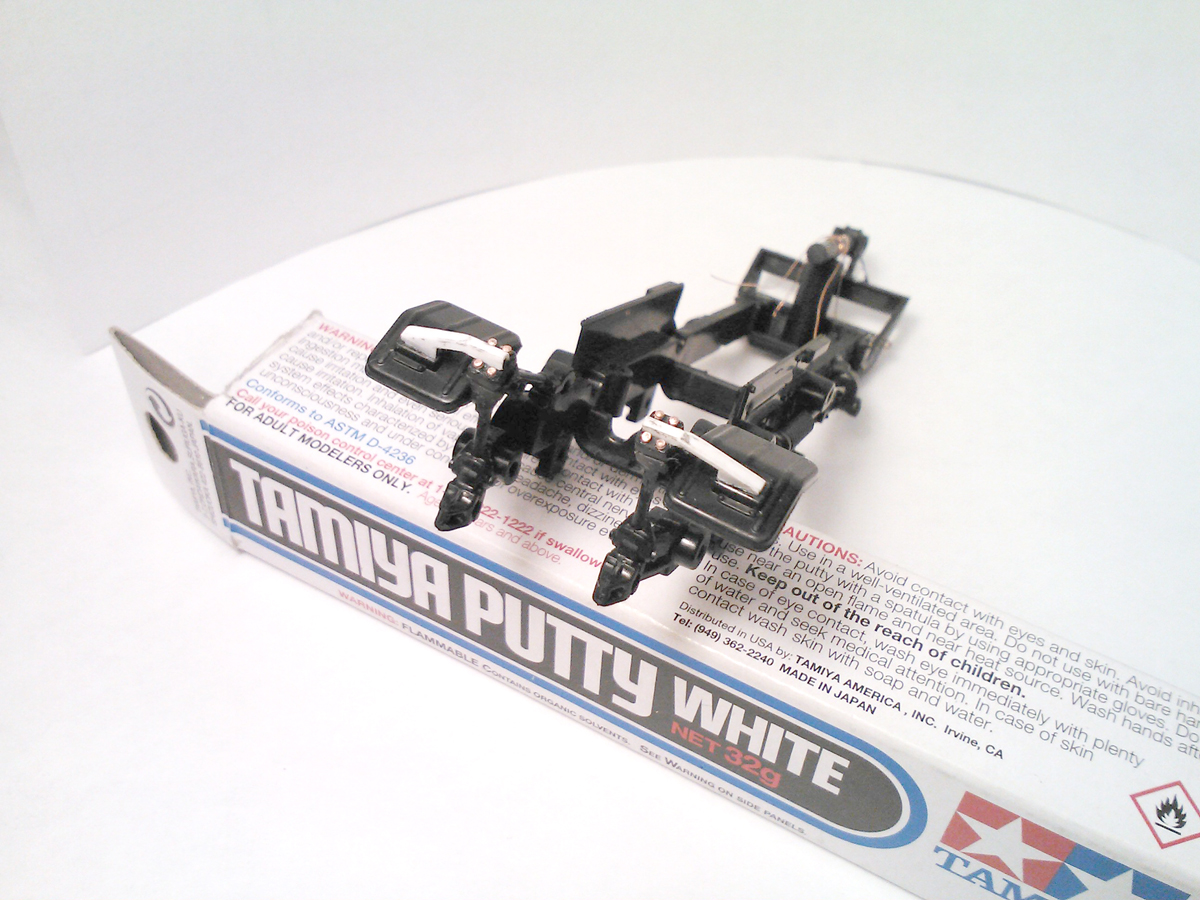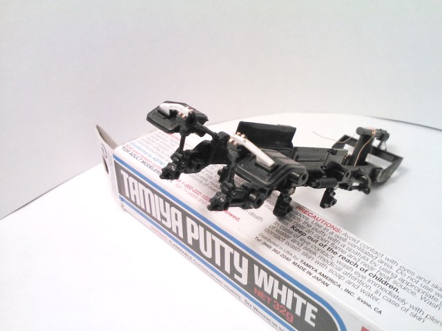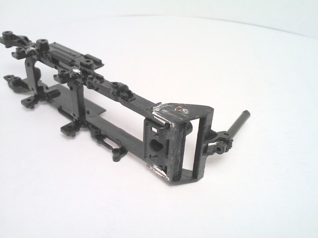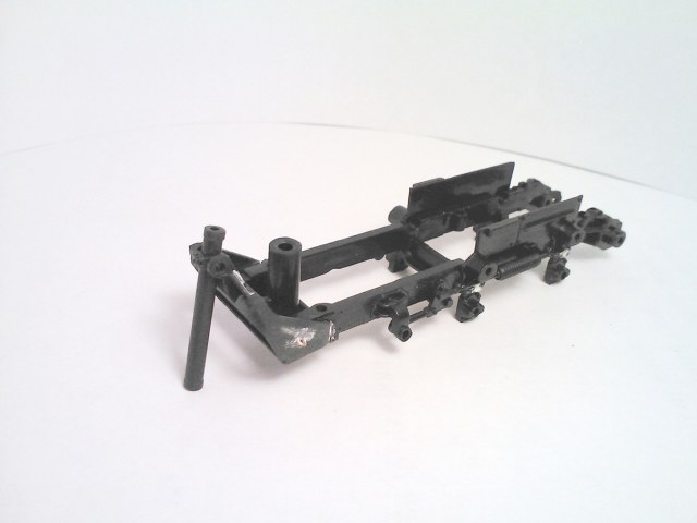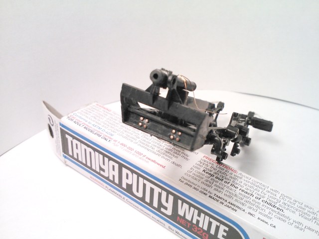 Первое, что хочется отметить: производитель предусматривает полностью рабочую подвеску модели (вращающиеся ведущие колеса, ленивцы и подвижные каретки балансиров). Что касается кареток балансиров, то тут есть один нюанс: хоть крепление их к раме и предусмотрено подвижным через металлические штыри, но в то же время производитель делает на самих пружинах кареток вылитый в пластике штырек, который в свою очередь вставляется в отверстие в раме (выше отверстия основного крепления каретки к раме) и в итоге каретки получаются жестко скрепленные с корпусом. К сожалению я этот момент на фото не запечатлел. От жесткого крепления балансиров избавился в первую очередь: на раме убрал дополнительную выштамповку под крепеж, отверстия зашпаклевал. На фото к сожалению детальности нет (ограничен камерой смартфона) но шпаклеваные места этого крепления впринципе видны
