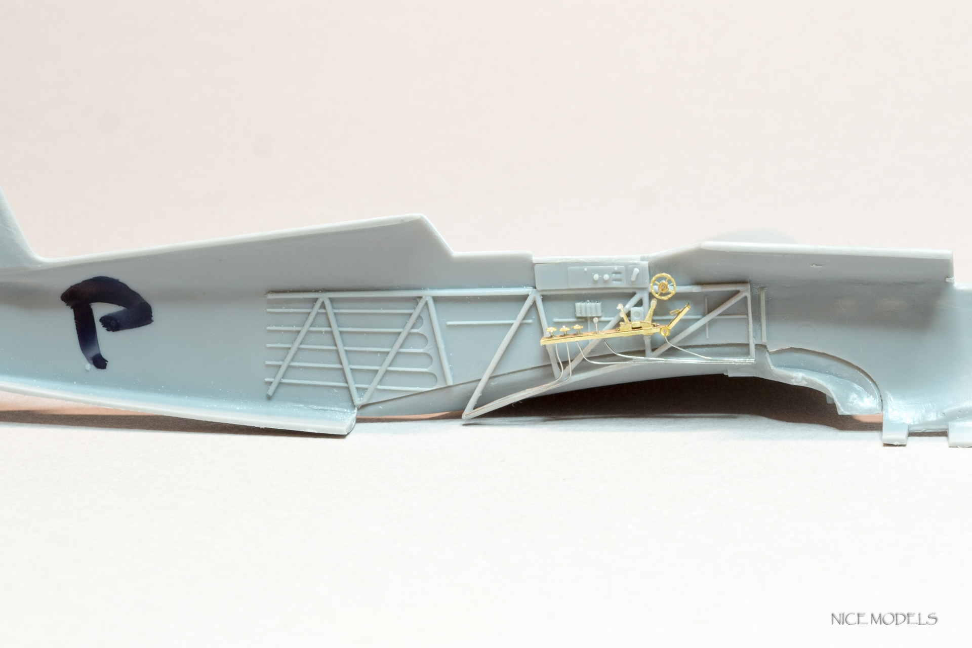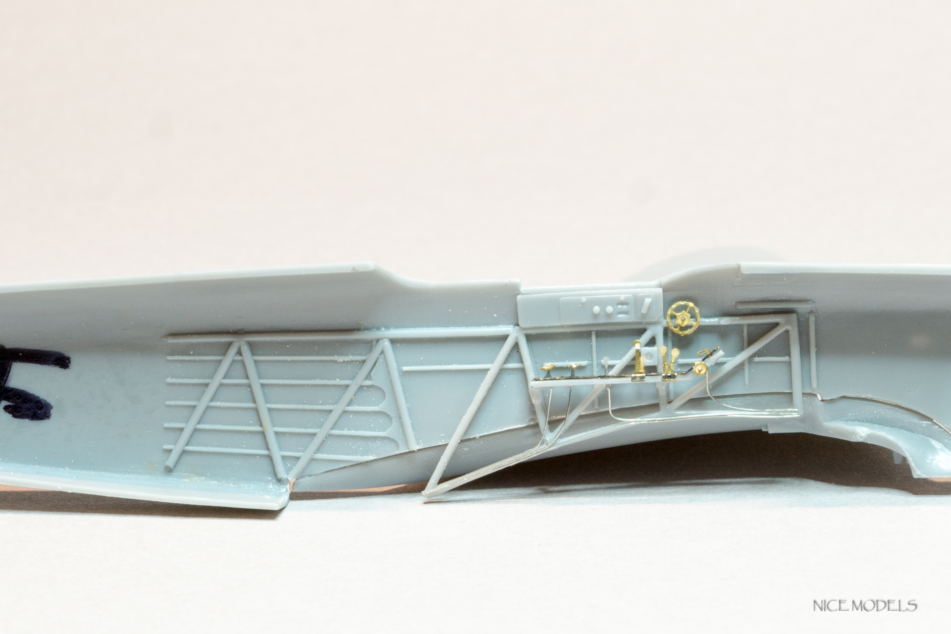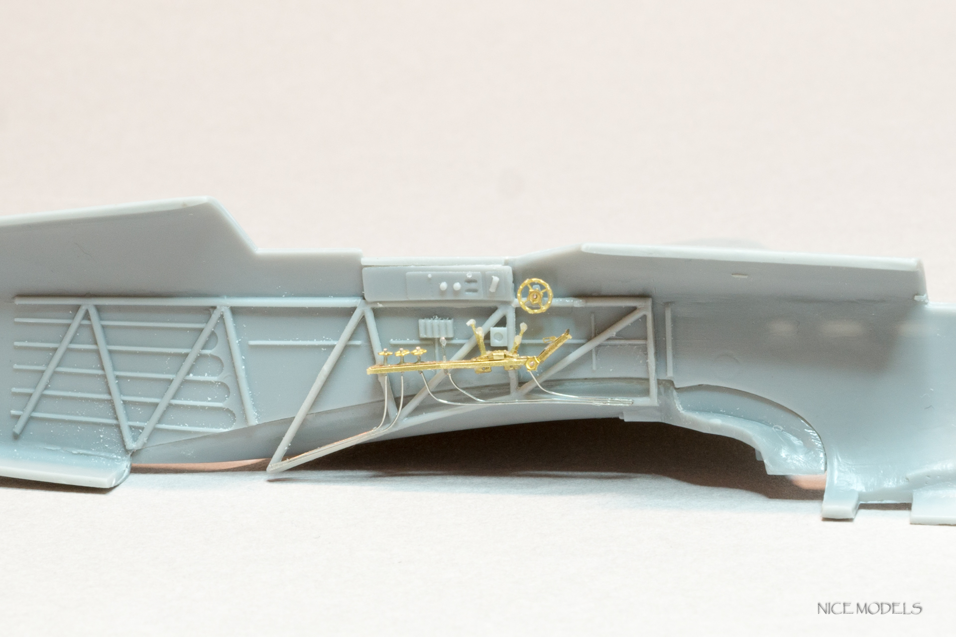 Начал, как водится, с кабинета. Рассверлил патронтажи, добавлена проводка к приборам и рычагам управления, прорезаны воздухозаборники, добавлен вентиль и хомут на кислородный баллон, заменены баранки и сделаны на них оплетки. Из остатков травленки добавлены гашетки. Из разных наборов травленки, латуни и проволоки сделаны пульты управления. Добавлены кислородные приборы от Вектора.