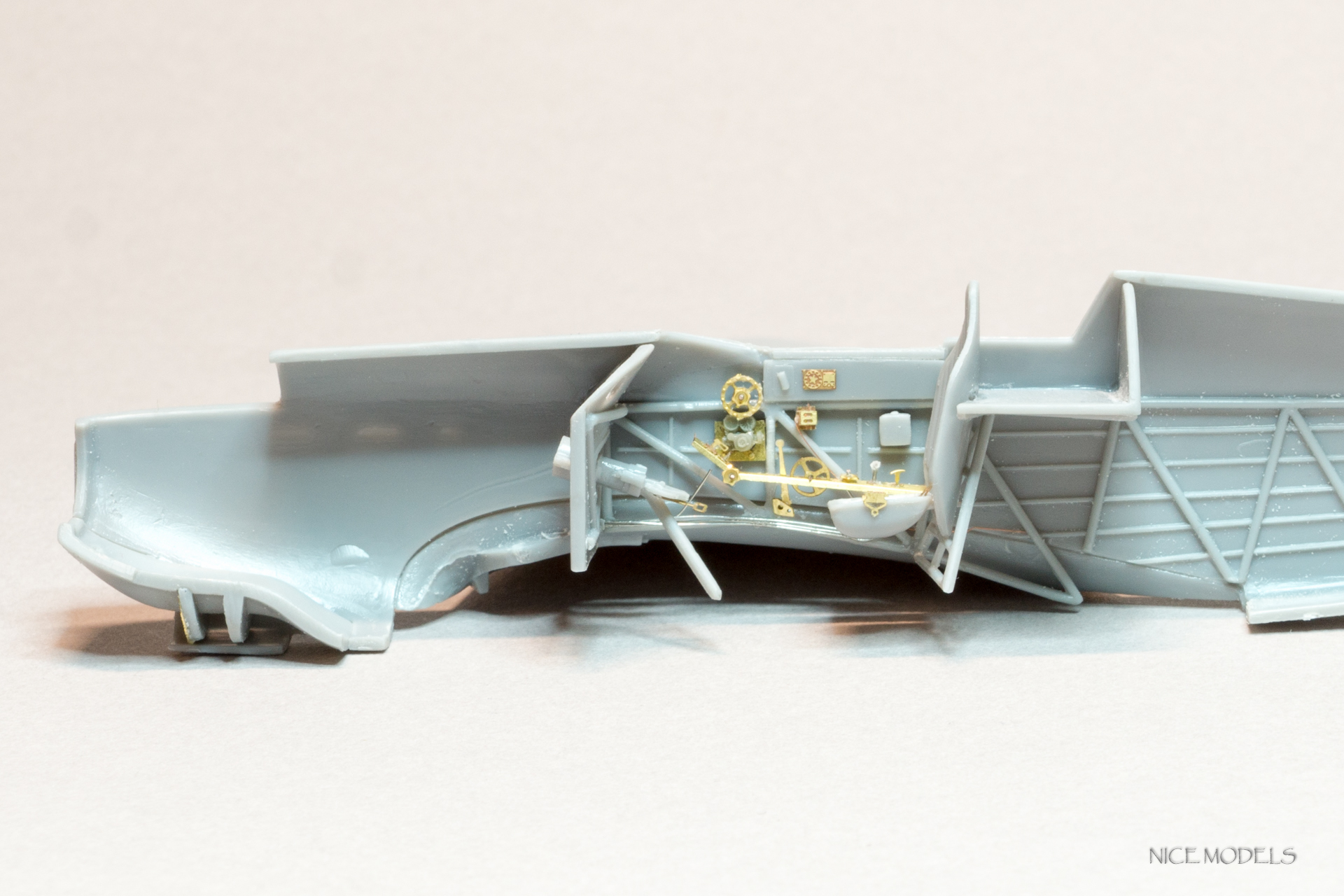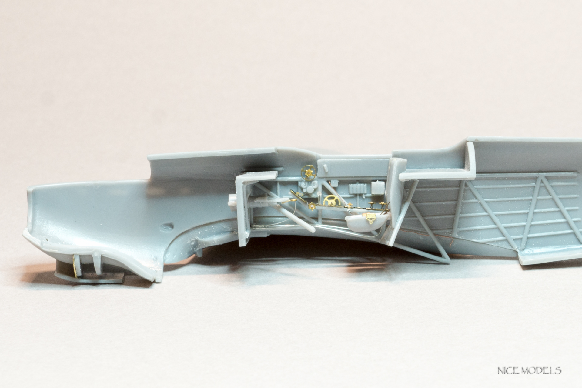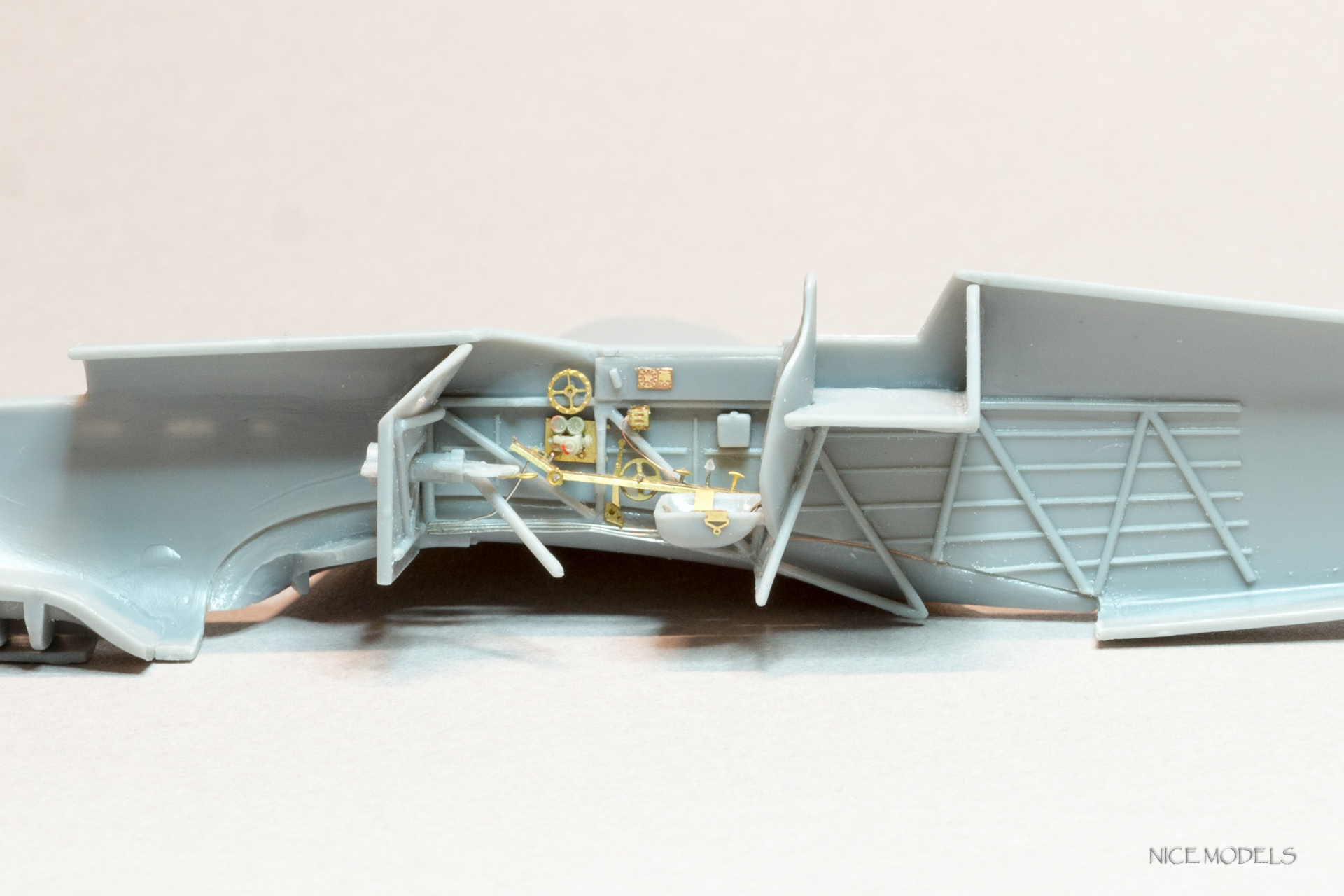 Начал, как водится, с кабинета. Рассверлил патронтажи, добавлена проводка к приборам и рычагам управления, прорезаны воздухозаборники, добавлен вентиль и хомут на кислородный баллон, заменены баранки и сделаны на них оплетки. Из остатков травленки добавлены гашетки. Из разных наборов травленки, латуни и проволоки сделаны пульты управления. Добавлены кислородные приборы от Вектора.