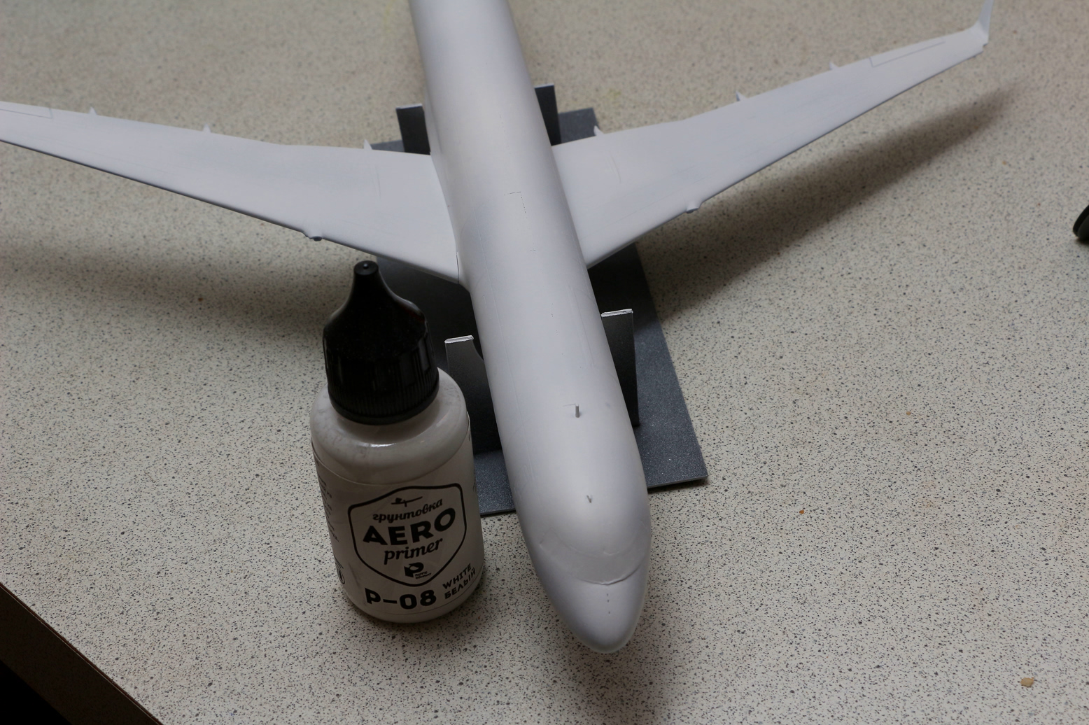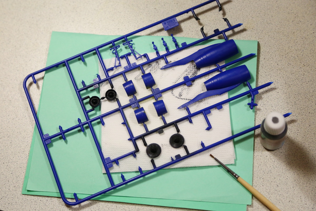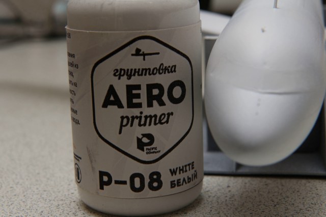 Перенес рабочее место из подвала (где было не очень комфортно) на кухню, с обещанием близким "не вонять". Пришлось перейти на водорастворимую краску. Был вопрос, чем грунтовать - купил грунтовку фирмы "Pacific88". Совершенно без запаха, по укрывистости похожа на грунтовку "Revell" для аэрографа. После нанесения первого слоя вылезли "косячки", которые были незаметны на синем пластике. Особенно расстроило "остекление" кабины, должно быть гладко, а переплет видно.