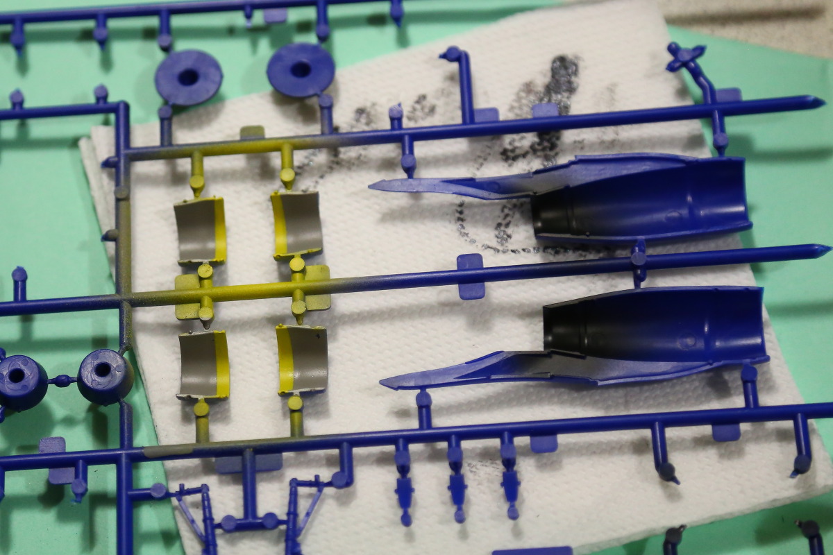 Склеил двигатели. Внутри задул желтое кольцо, но позже выяснилось, что оно толстовато. Переделывать не буду. Прошелся по граням "серебрянкой" "сухой кистью".