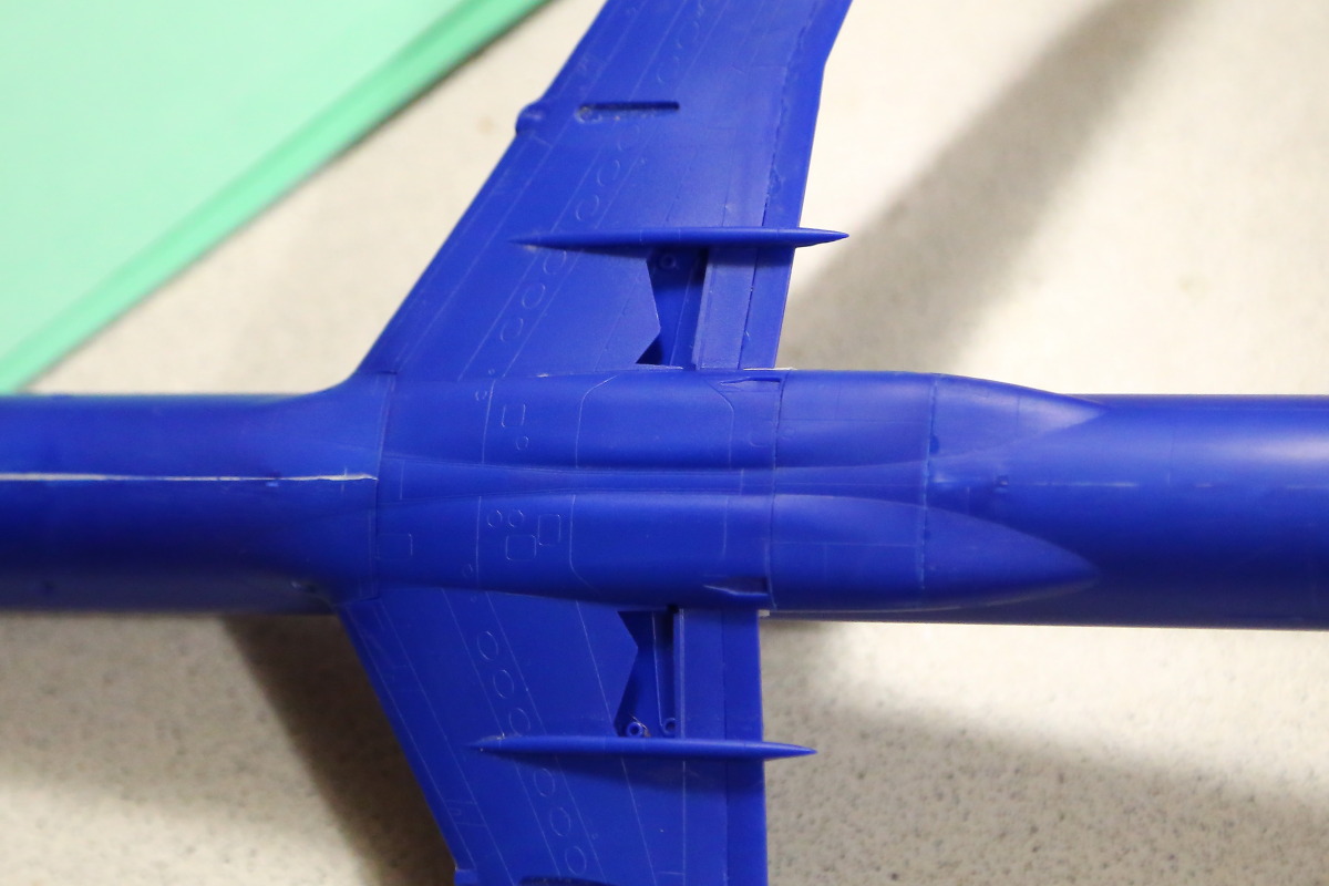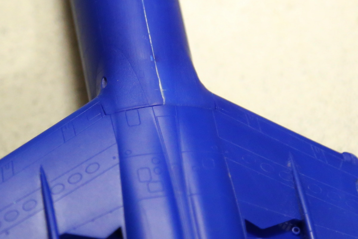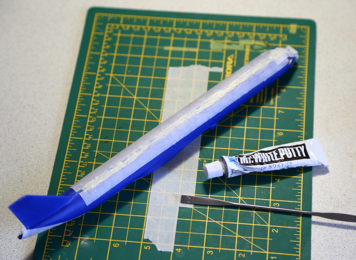 Неспешно продвигается работа. После склейки половинок корпуса у меня образовалась ступенька в доли миллиметра, прошелся шпаклевкой "Mr.White Putty" ("тамиевская" у меня серая, держится хуже), потом сточил все практически в ноль. Так как сопряжение деталей великолепное, большой соблазн отдельно покрасить центроплан, фюзеляж и стабилизаторы, а потом склеить.