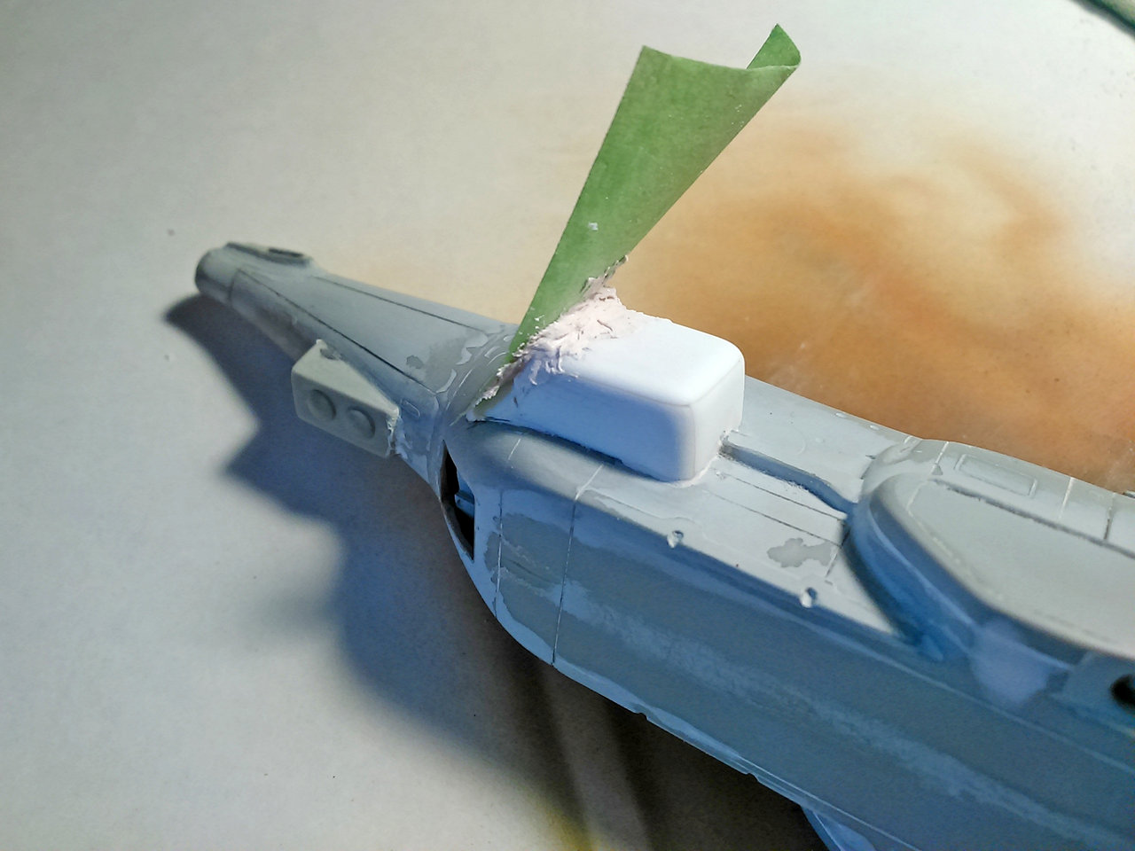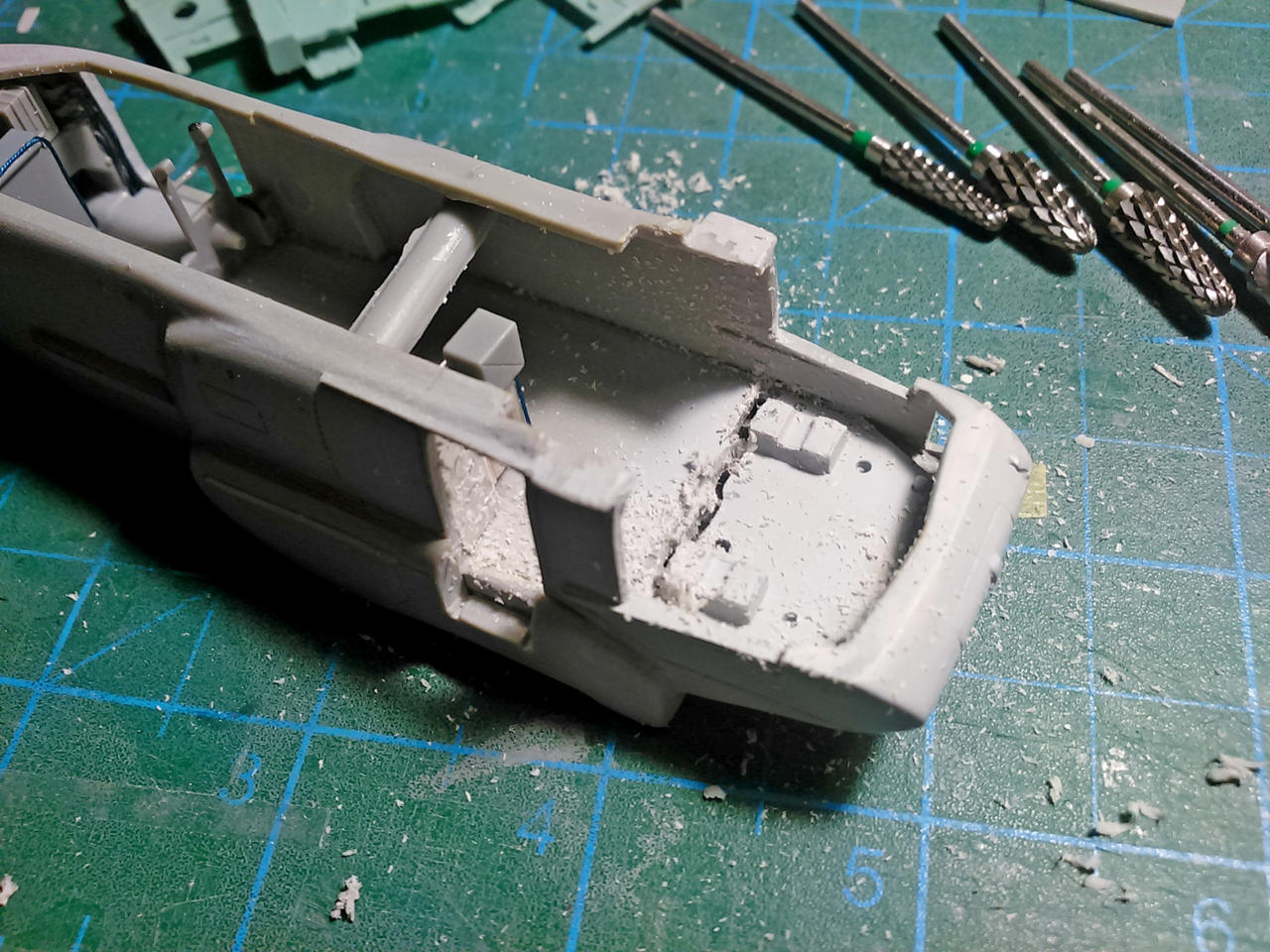 Операция по вживлению смоляной кабины в тушку несчастного прошла достаточно успешно, хоть смола изначально создавалась для модели Звезды. Огромную помощь в этом деле мне оказала бор-машина.