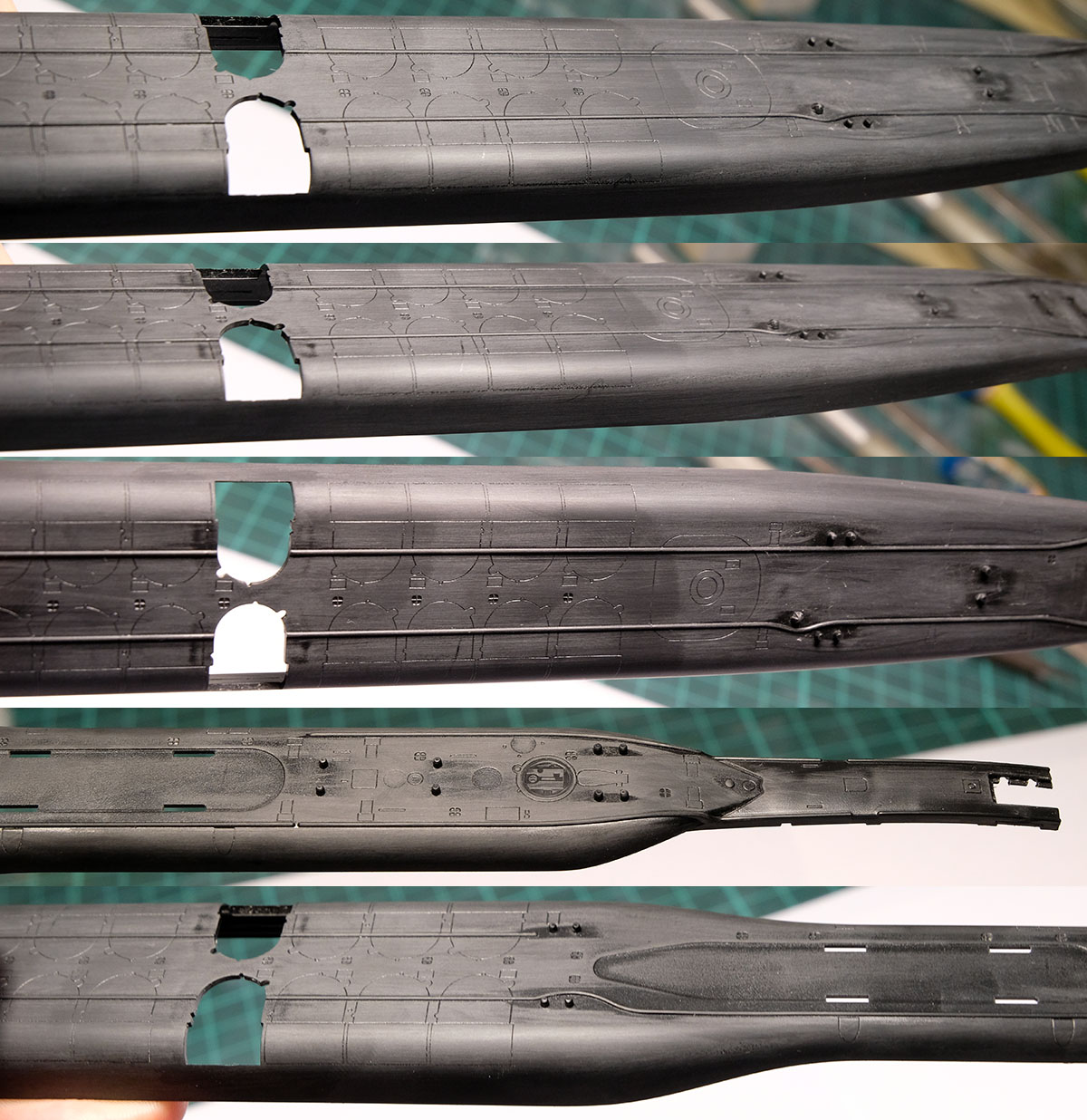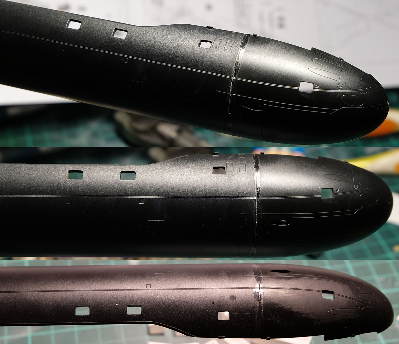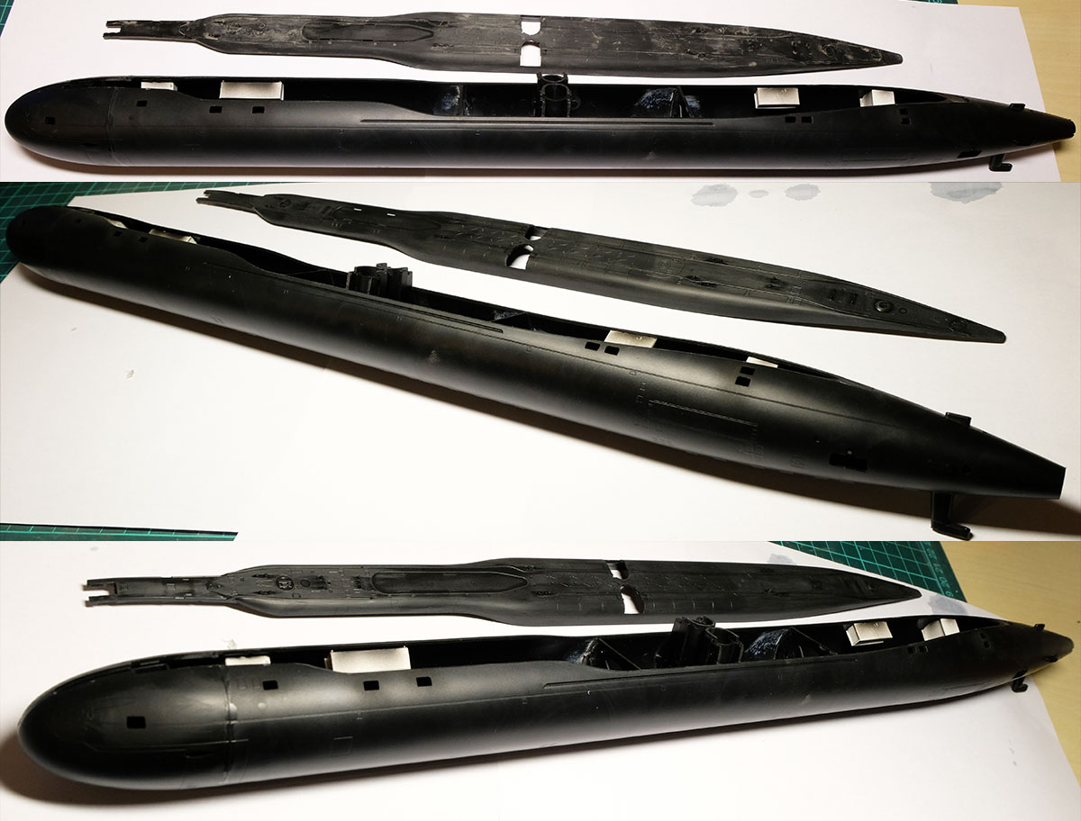 инструкция советует сначала собрать основную часть корпуса и потом уже к ней клеить носовую.