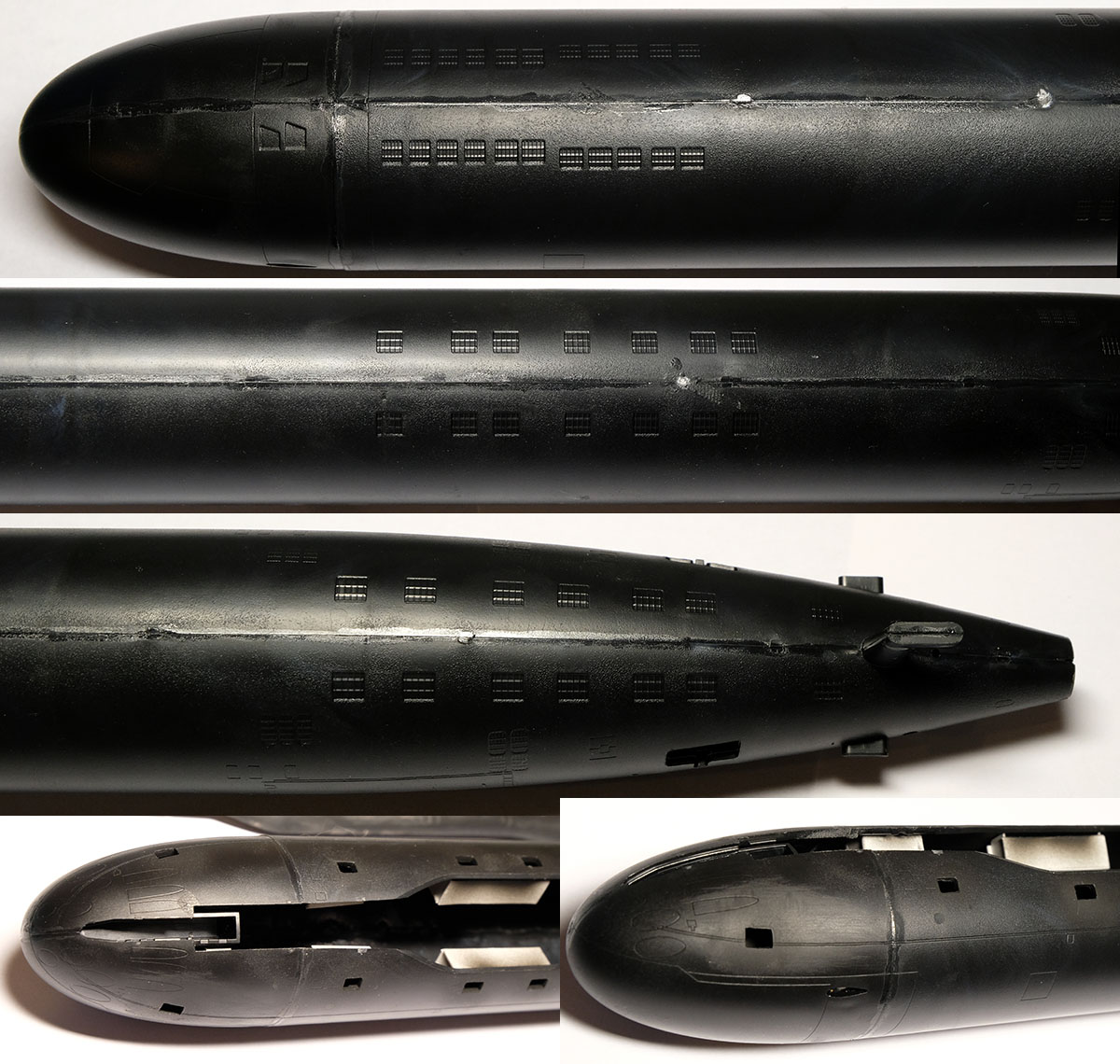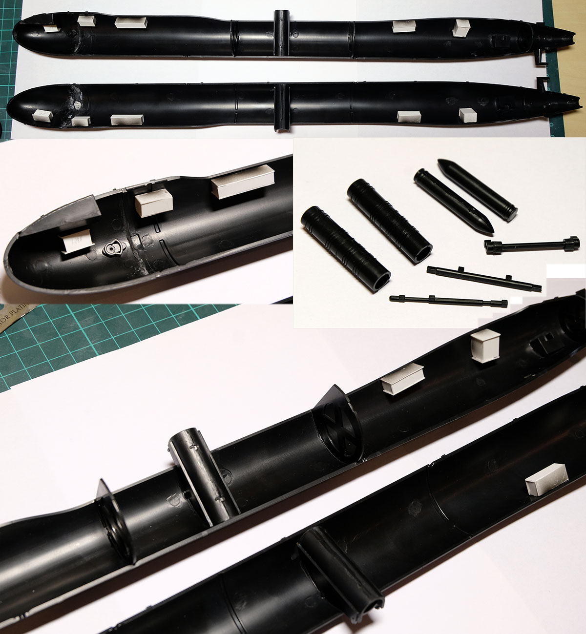 вклеил в корпус переборки, шахты, носовой отсек и отсеки с подруливающими устройствами. Носовую переборку ставить не стал - так как мешался ящик шпигата.