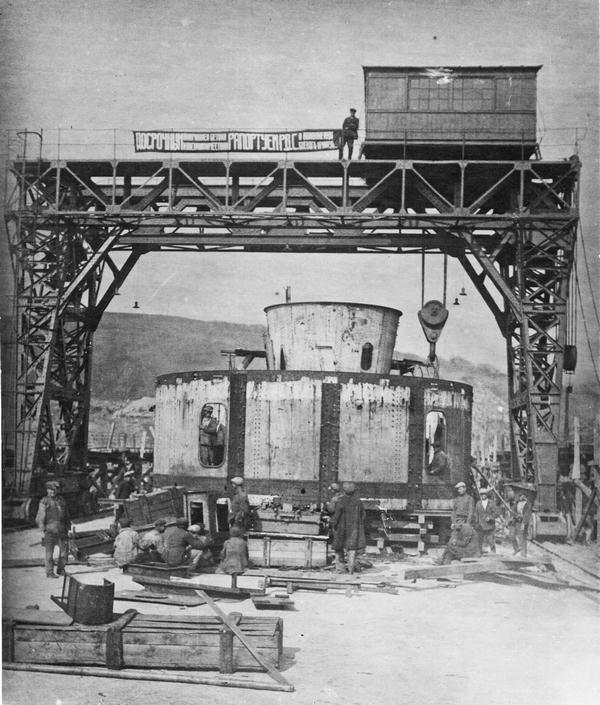 Есть вот такая фотография козлового крана на строительстве Ворошиловской батареи на острове Русский в 1933 году. Больше нет ничего.