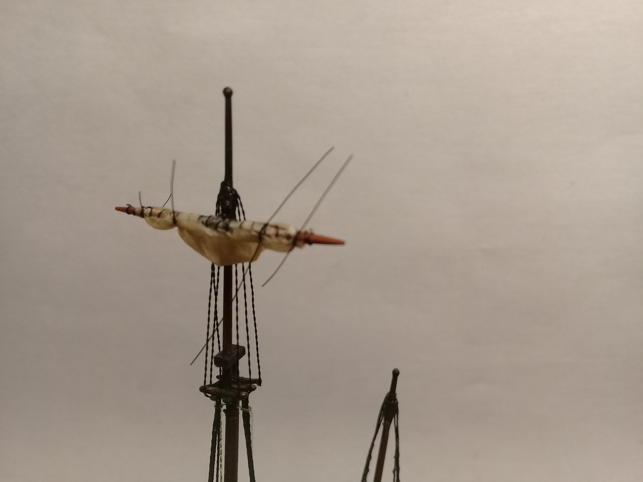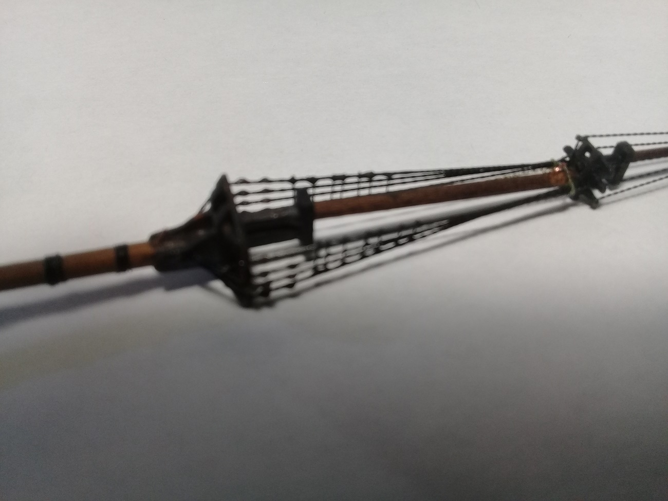 Но скрутка из двух ниток, обозначающая марса-ванту, у Вас слабовато скручена...... если перевести вашу ванту в реальный масштаб, то один оборот троса будет длиться приблизительно от выбленки, до следующей выбленки (а это 40-50см в реальном масштабе)..... при такой вялой скрутке тросов вант, выбленки только подчёркивают несоответствие, может тогда вообще без них?.... Или, как вариант, предлагаю попробовать исходную нитку, или скрутку из ниток, перед использованием, ещё раз подкрутить, до упора, по-шерсти, и потом немного растянуть..... Это Кирилл Шабанов вроде давно и удачно применяет на своей стройке.....