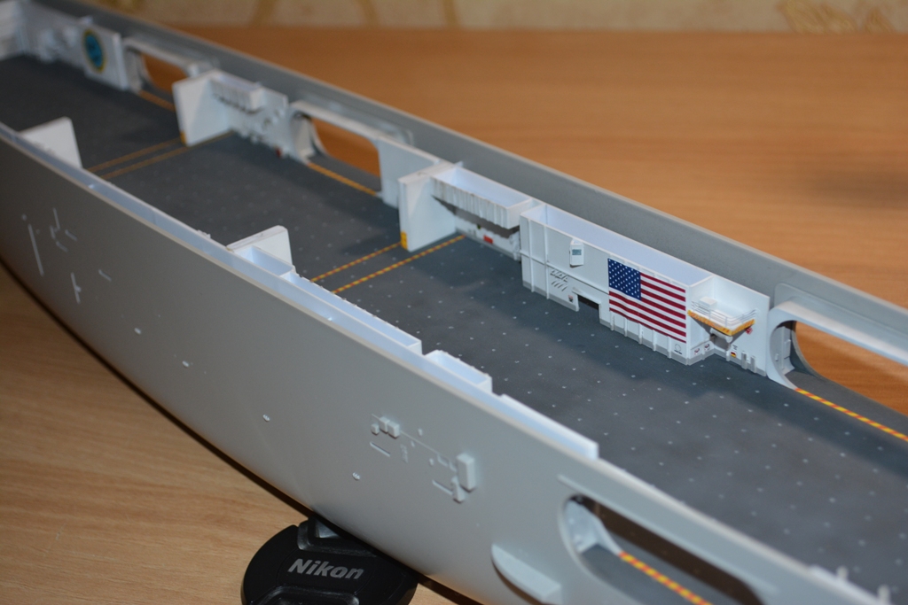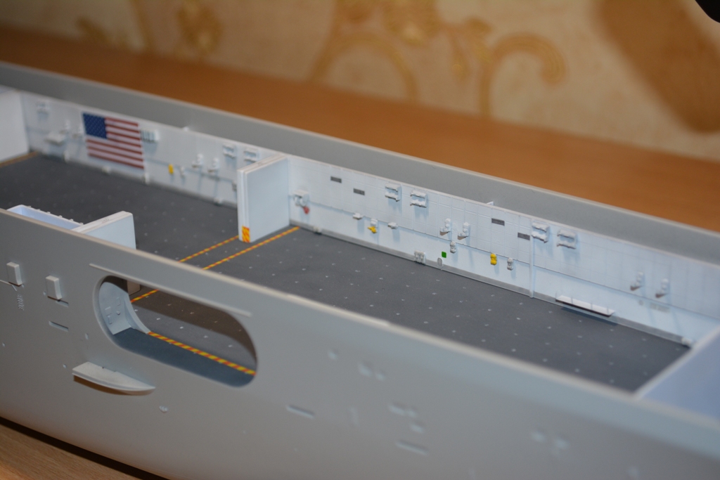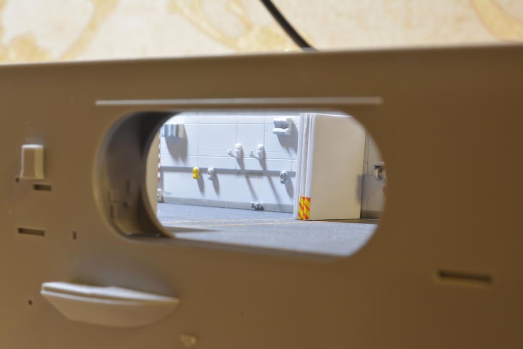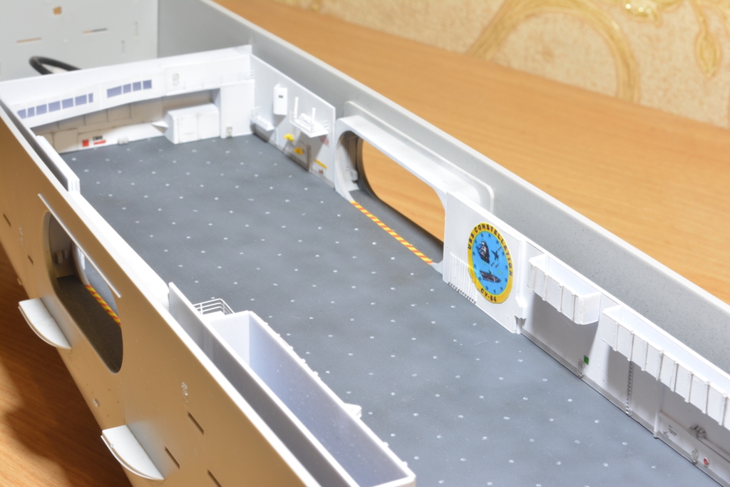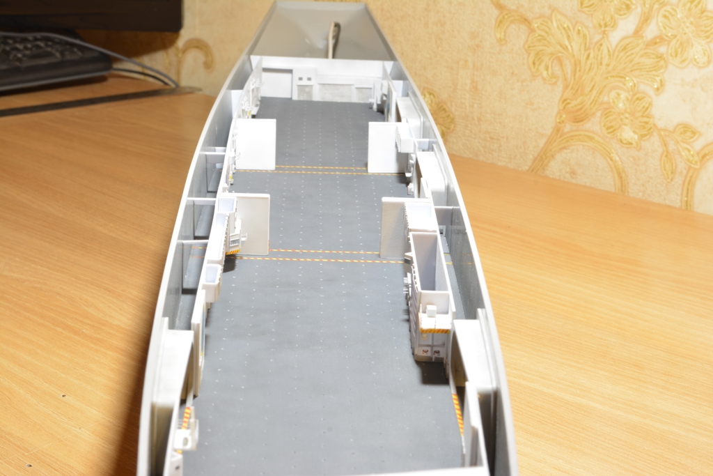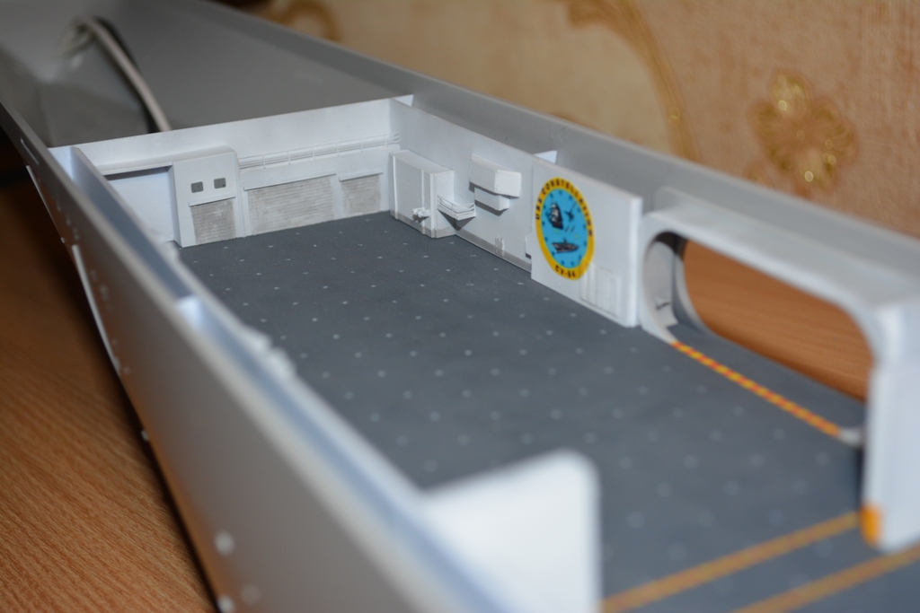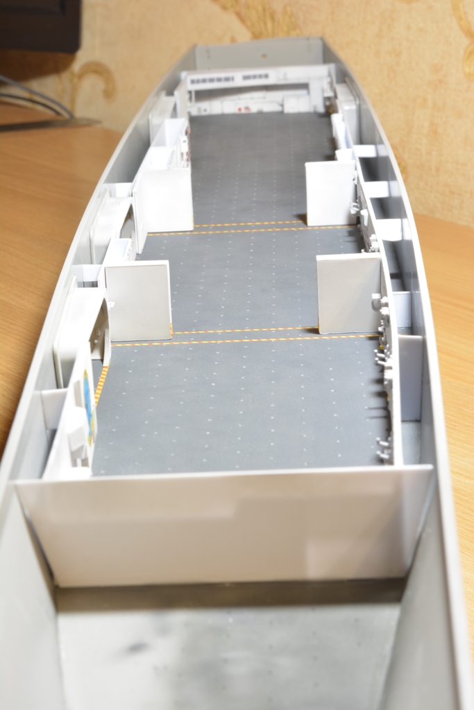 Еще одно продвижение по ангару. Задул палубу и нанес линии разметки. По стенкам добавил травленые двери. Осталось еще 2 секции состряпать и можно будет красить и закреплять на местах.