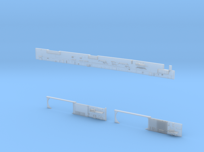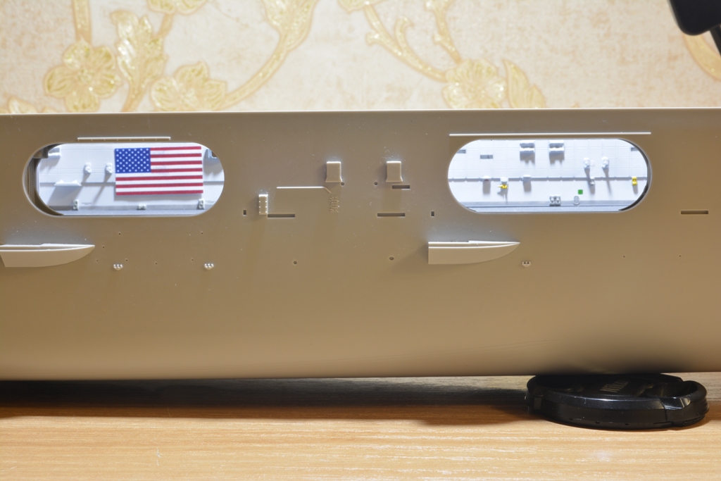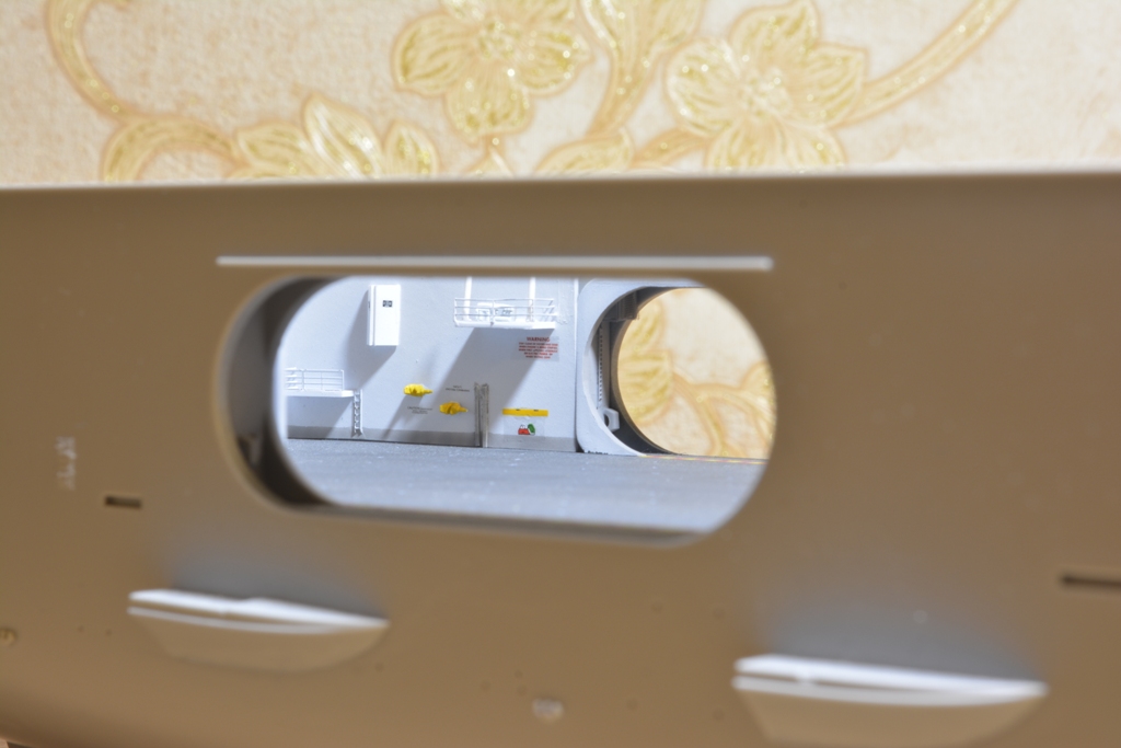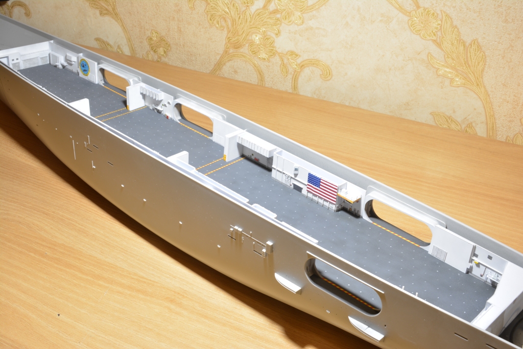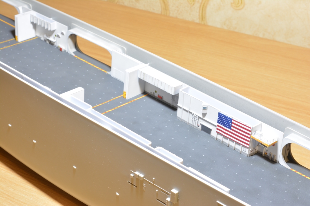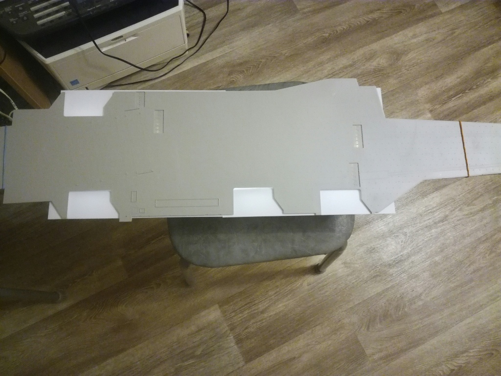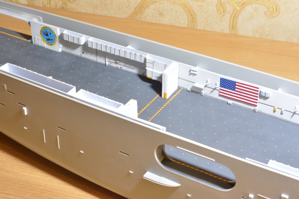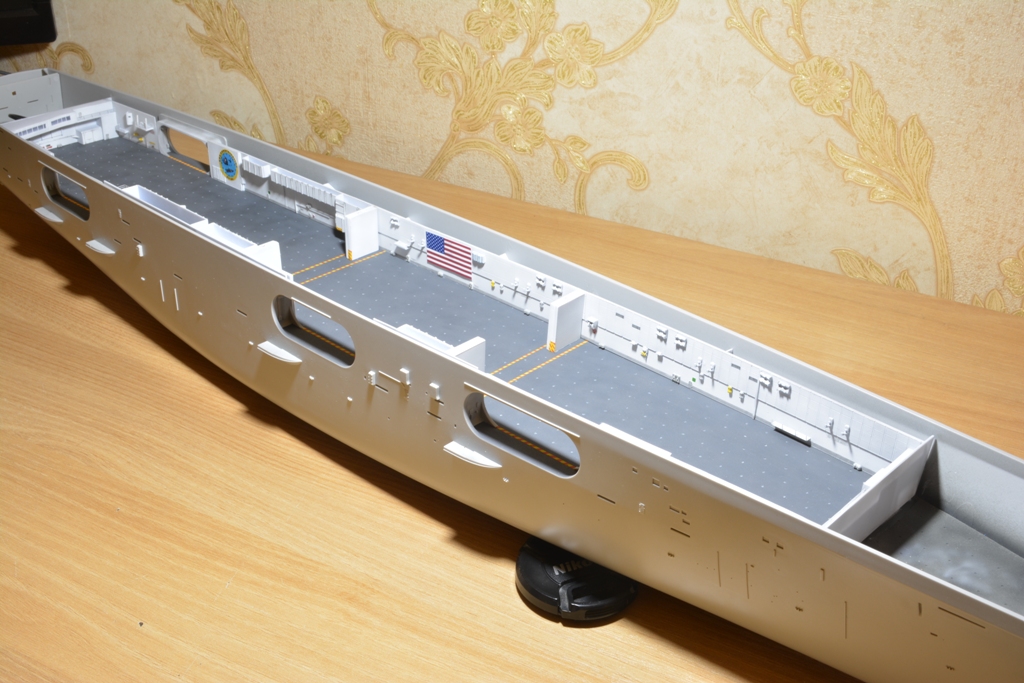 Еще одно продвижение по ангару. Задул палубу и нанес линии разметки. По стенкам добавил травленые двери. Осталось еще 2 секции состряпать и можно будет красить и закреплять на местах.