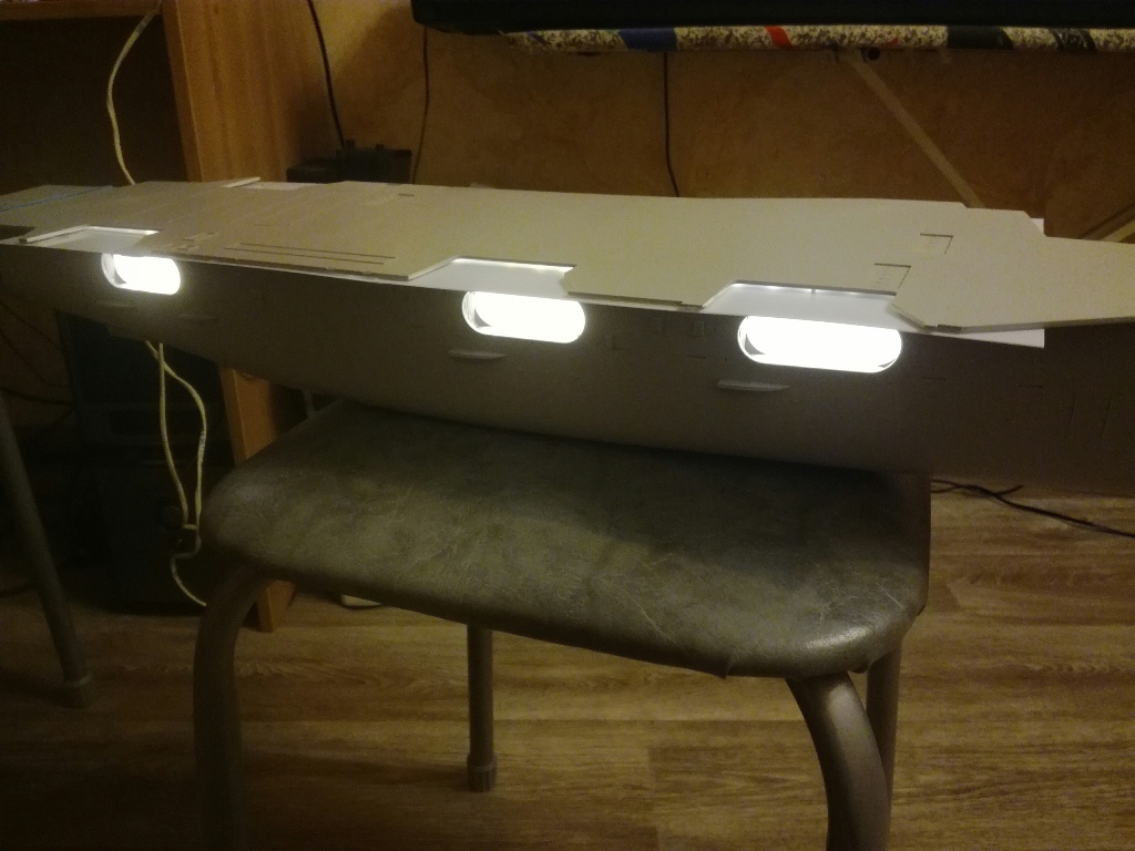 Вчера по экспериментировал с освещением ангара... Отдельно паять каждый SMD диод вообще не вариант, слишком мелкие они и проводов выйдет много(да и руки под паяльник у меня не особо), оптоволокно с торцевым освещением тоже отпадает - метраж большой получается и выходит очень дорого. Осталась светодиодная лента. В принципе неплохой вариант - верхняя палуба достаточно толстая и не просвечивает, думаю поставить в 2 ленты, но вот силу света надо как-то уменьшить... либо резистор ставить, либо ленту другую подбирать.