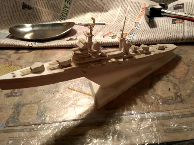 Большие сомнения по поводу масштаба. По архитектуре-крейсер, а по размеру -54 метра?Не смешите. 350 или 400.Наточить стволы,купить леера и еще кое-что из травленки,спаять мачты, дубовые антенны заменить на более приемлемое.И попытаться привести архитектуру в соответствие с 26 или 68 проектом. Раз уж это "лицо школы"