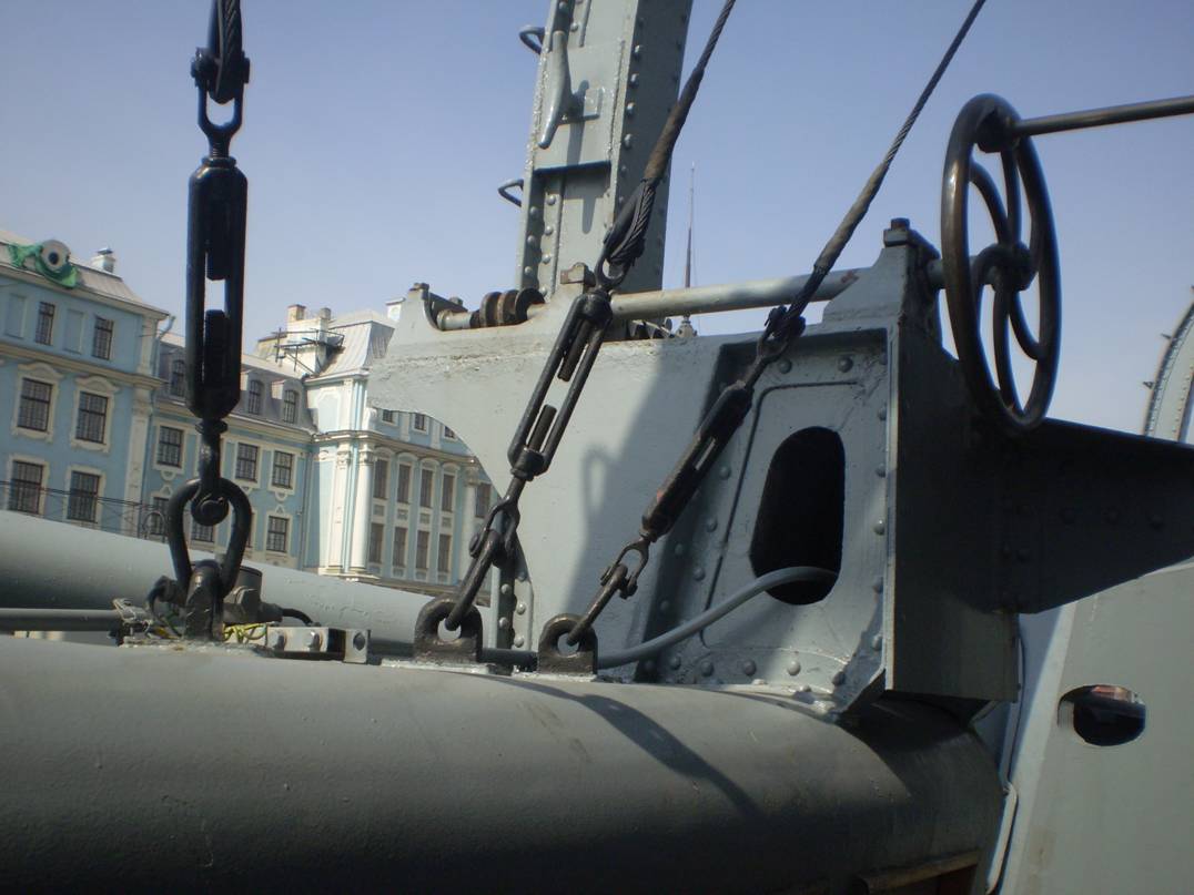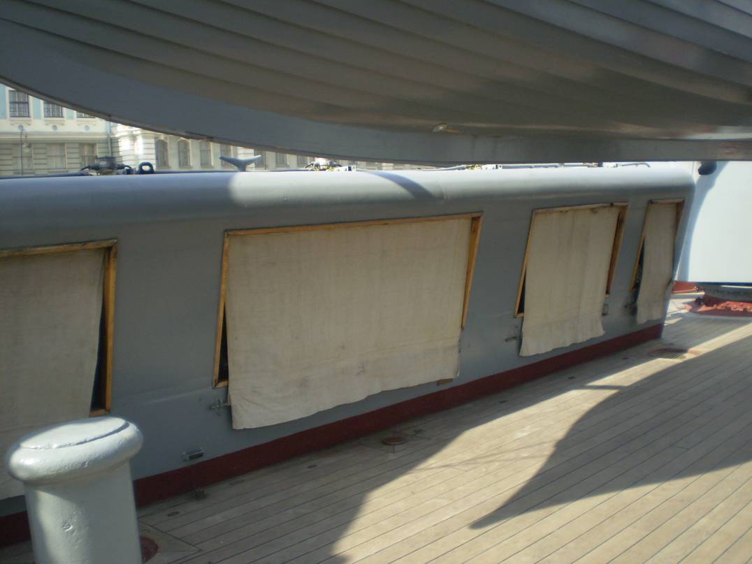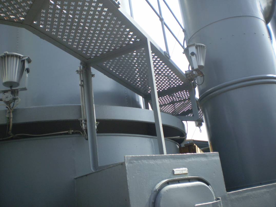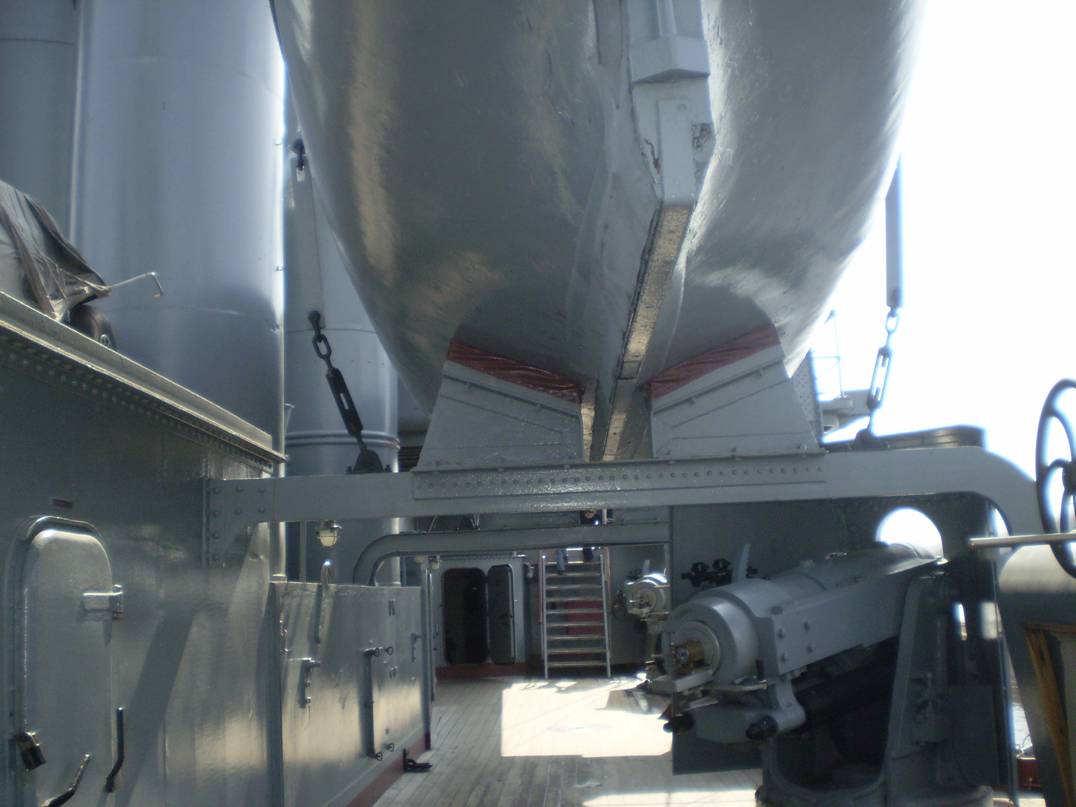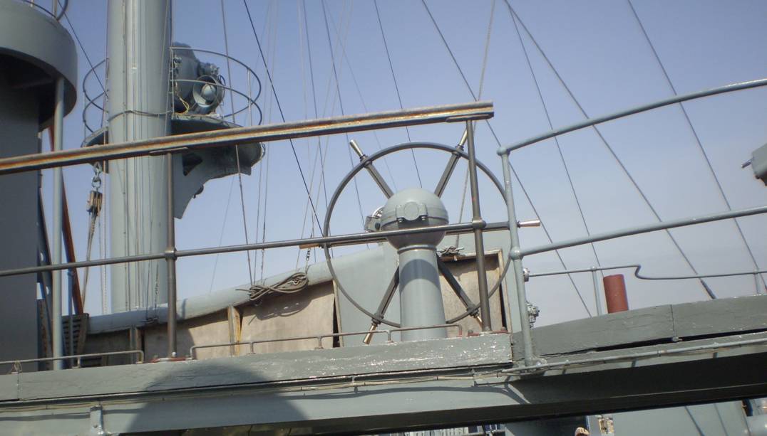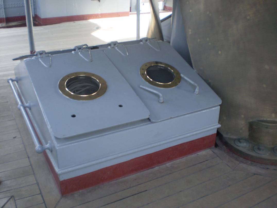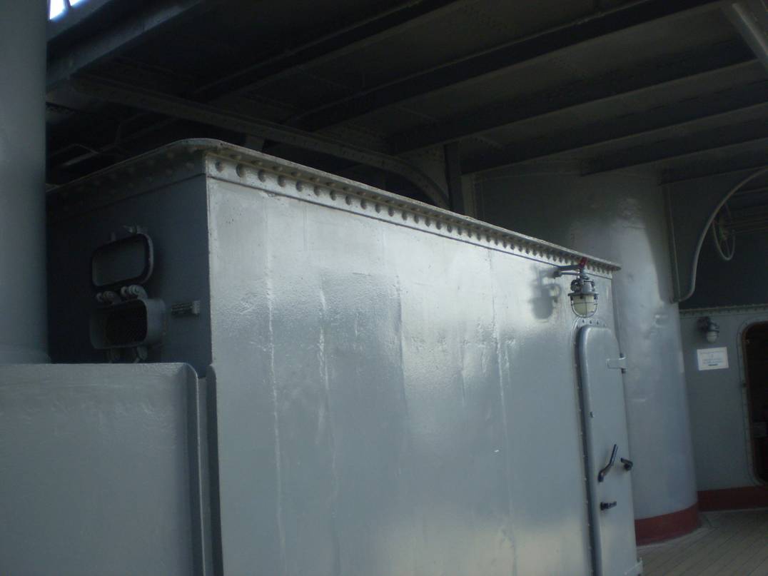 4. Интересует количество секций (размер и расположение проемов) коечных сеток на среднем мостике. Так же интересно, что сохранилось на палубе под мостиком (малый световой люк и четыре вертикально стоящих цилиндра, предназначение которых я не знаю).