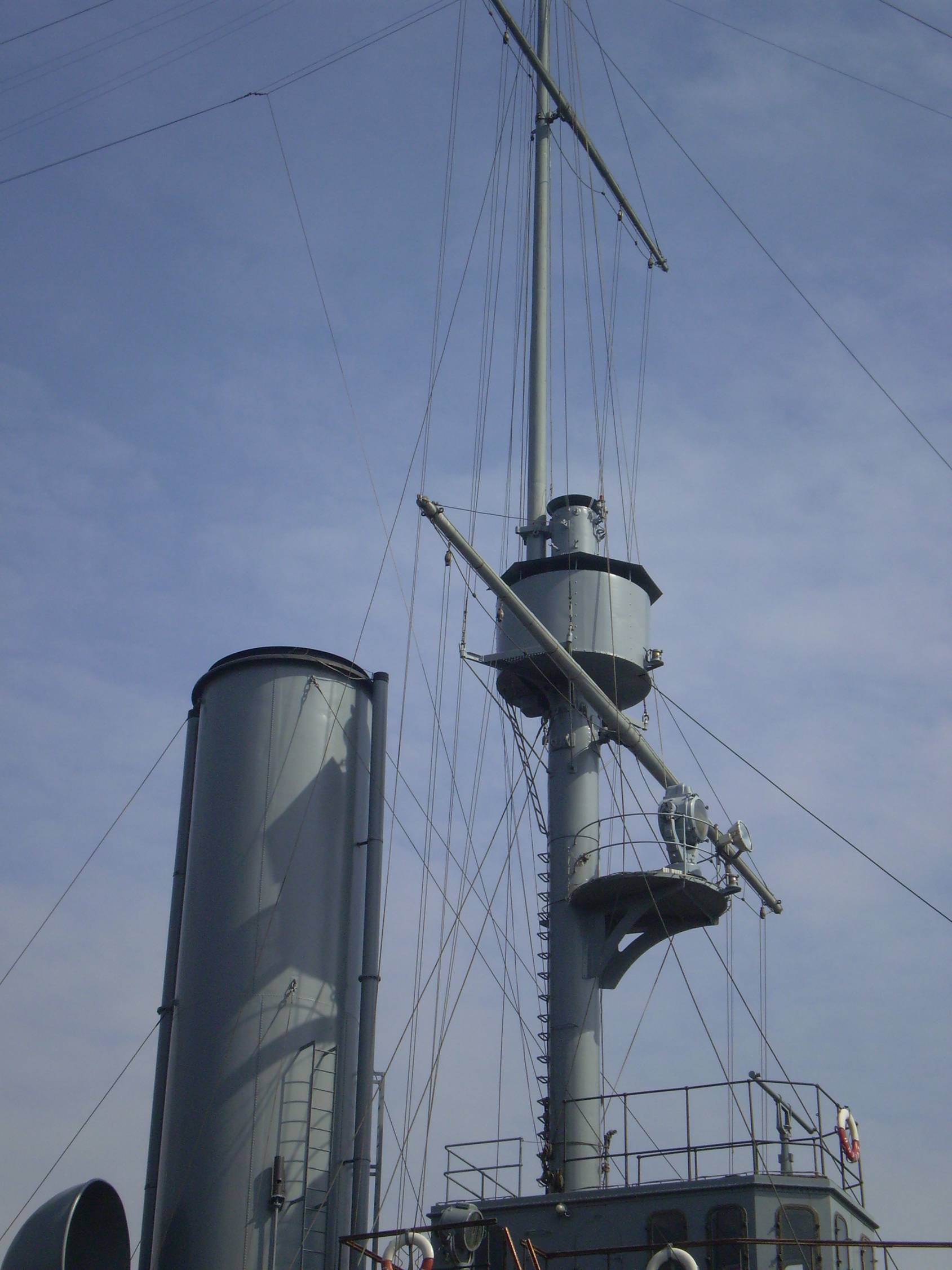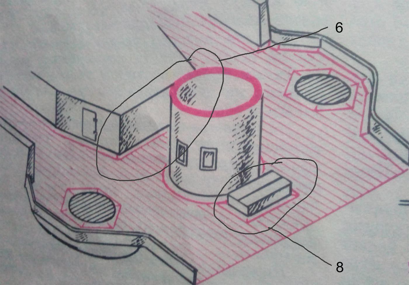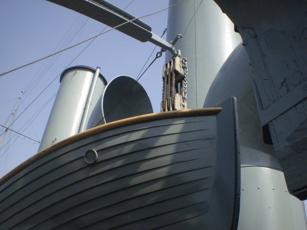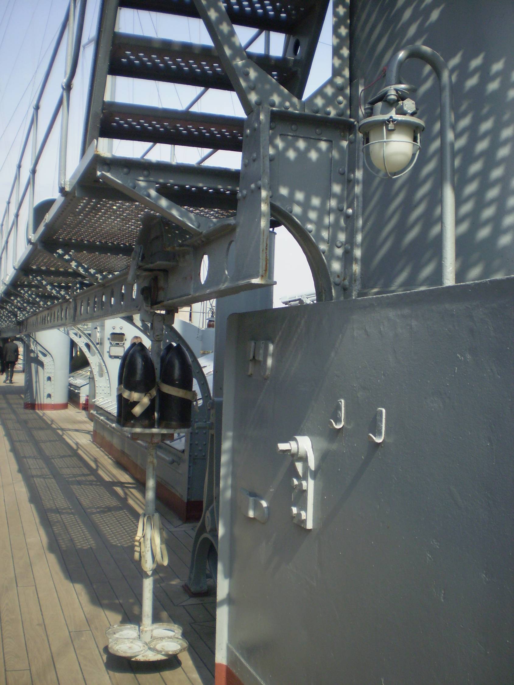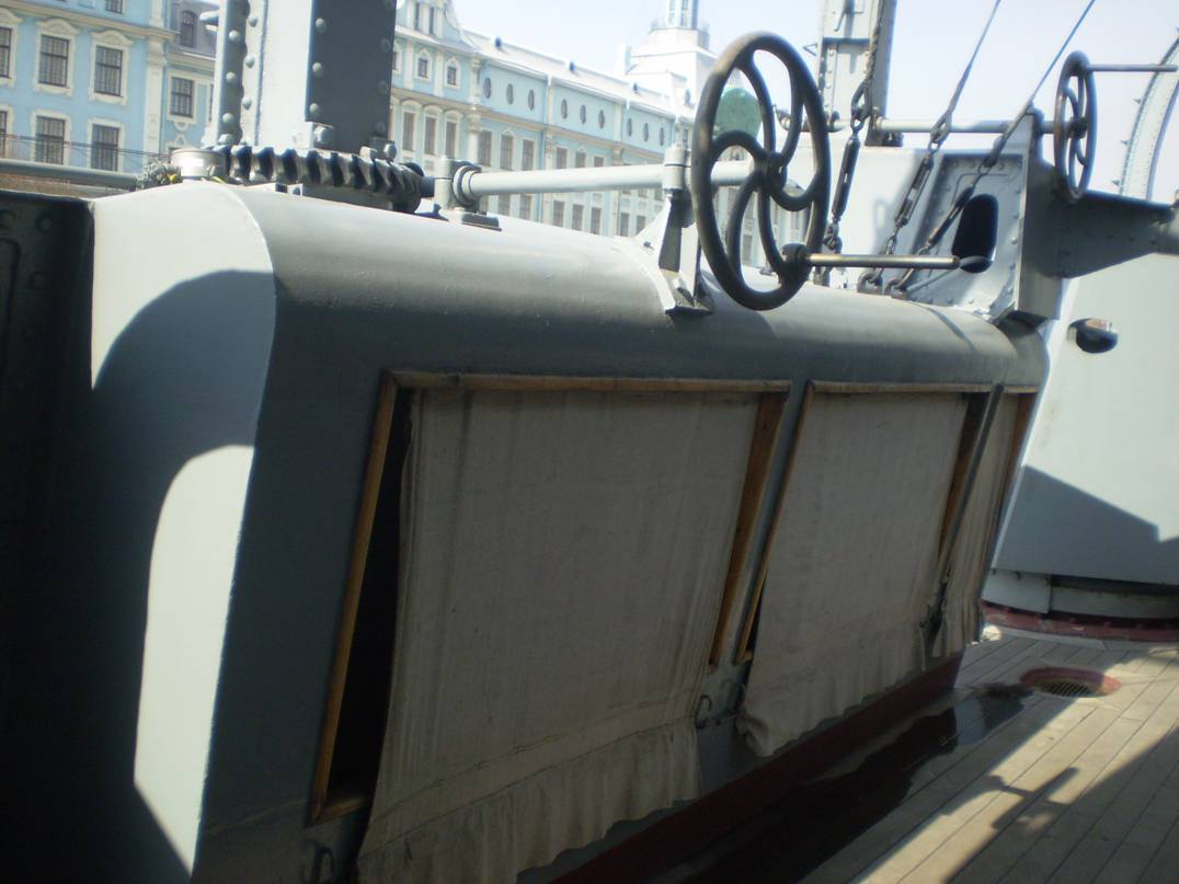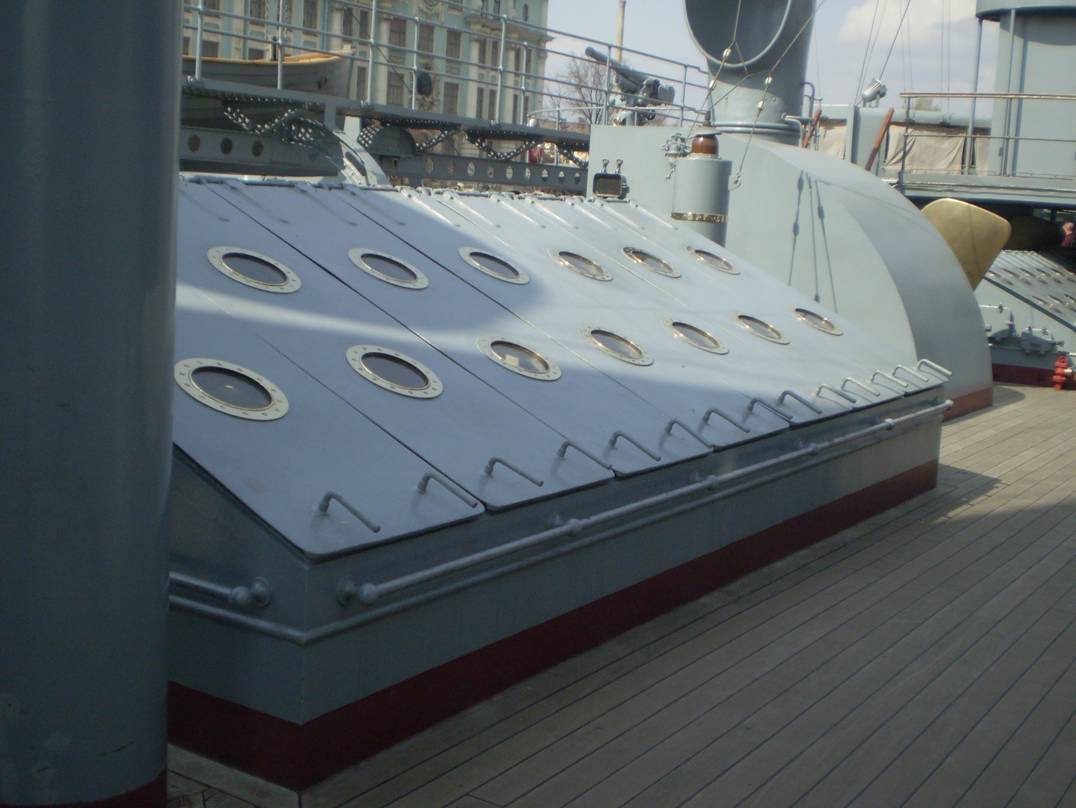 4. Интересует количество секций (размер и расположение проемов) коечных сеток на среднем мостике. Так же интересно, что сохранилось на палубе под мостиком (малый световой люк и четыре вертикально стоящих цилиндра, предназначение которых я не знаю).