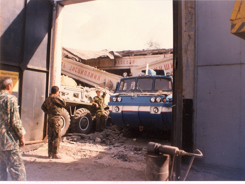 Прошу прощения,поясняю. Загоняя БТР в бокс задним ходом ,бойчишки вынесли кормой основную центральную колонну,на которой был стык поперечных балок крыши. Основное принял на себя БТР,но ему ничего не случилось серьёзного,выдернули из завала,обмели веником и закрасили царапины. А вот у "птицы" треснул корпус и взорвались покрышки.Куда её потом утащили и что с ней стало,к сожалению не знаю