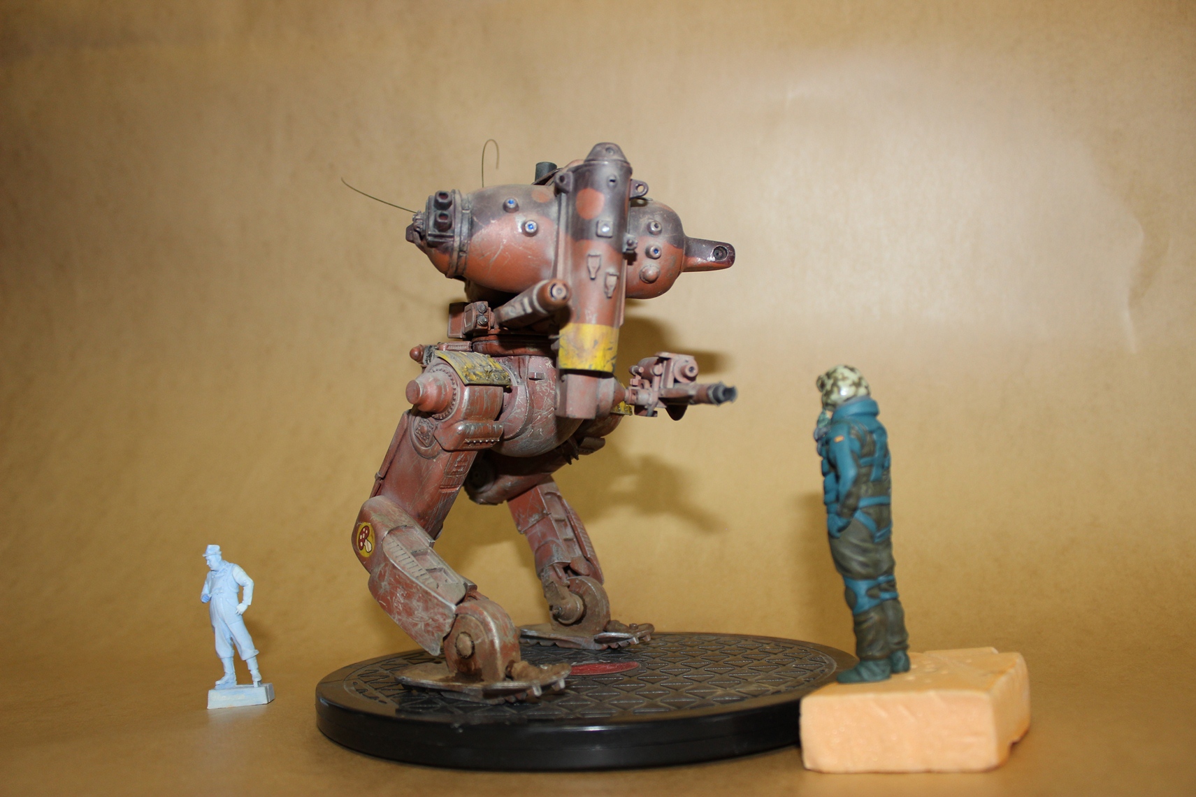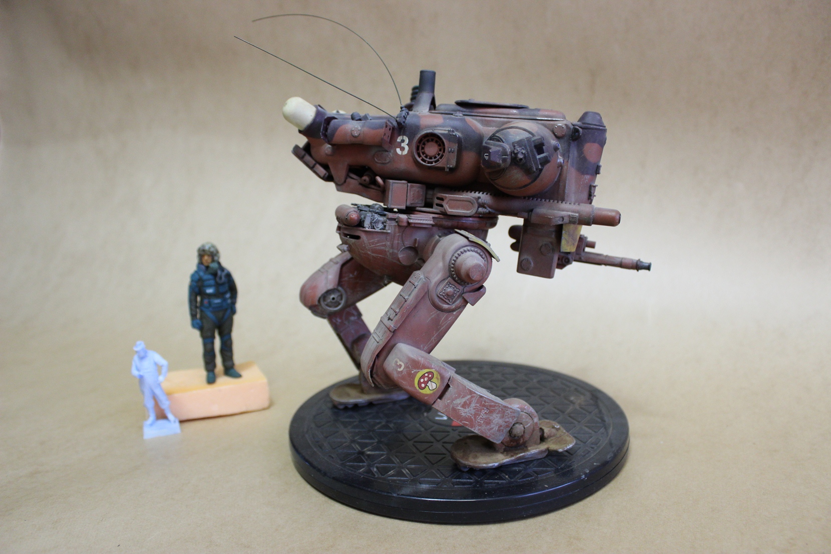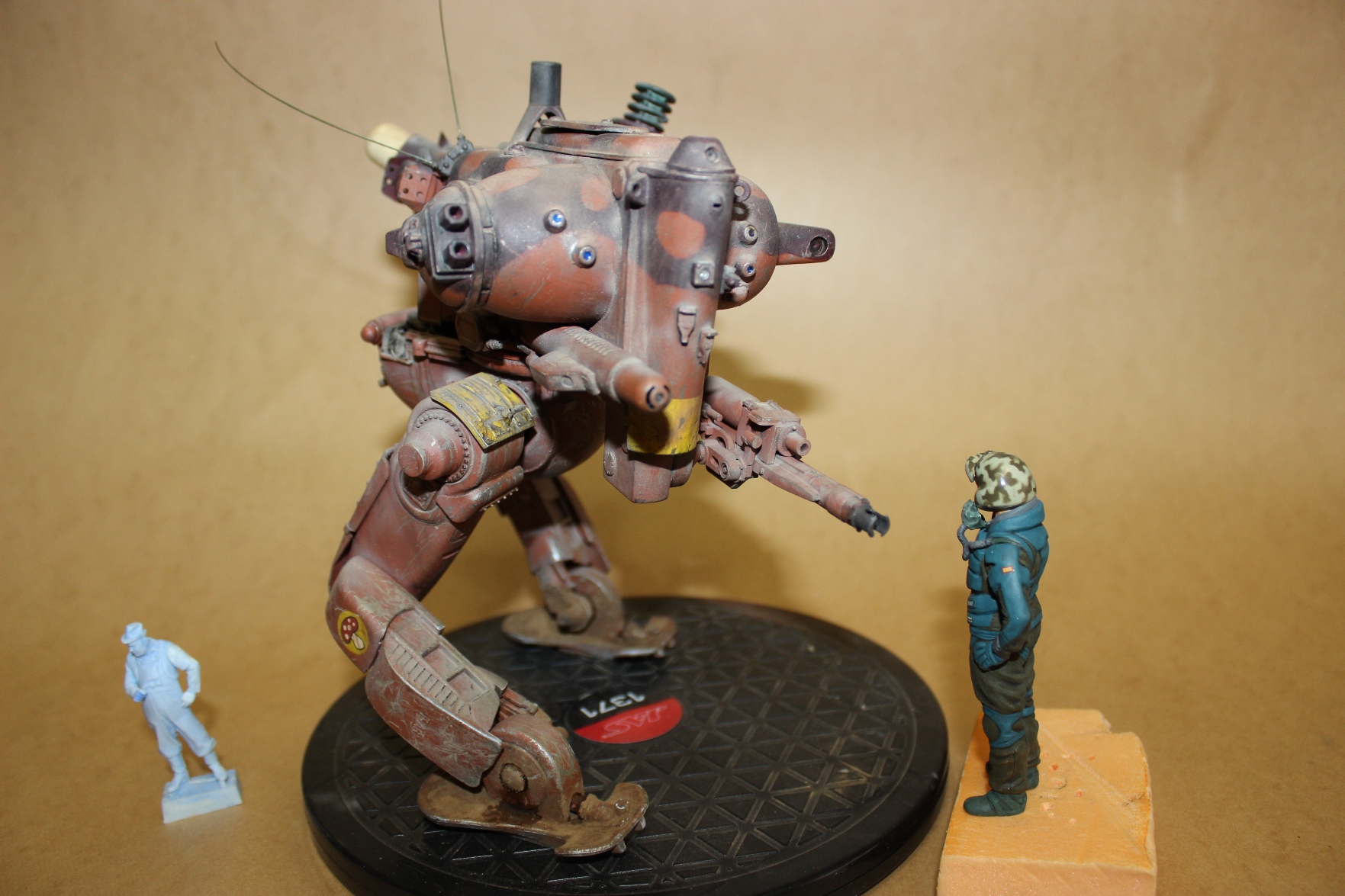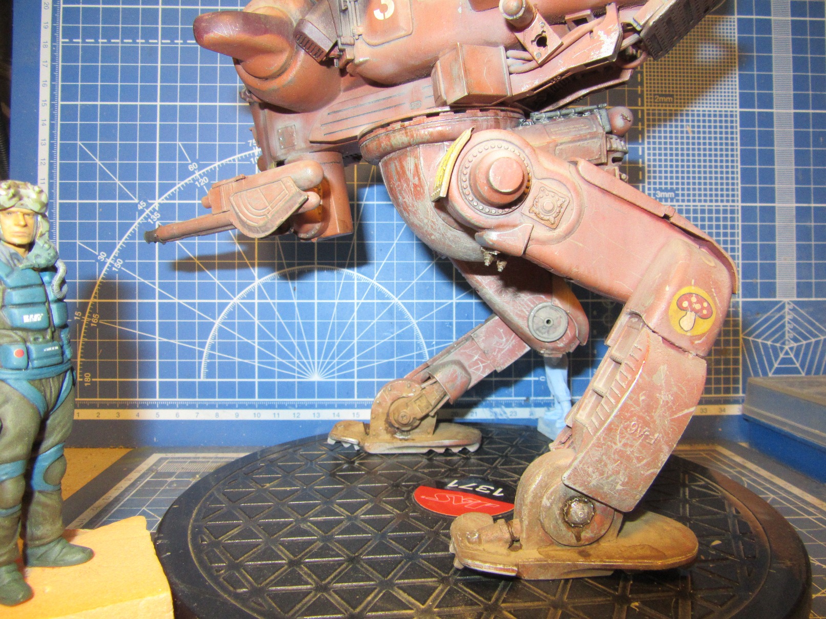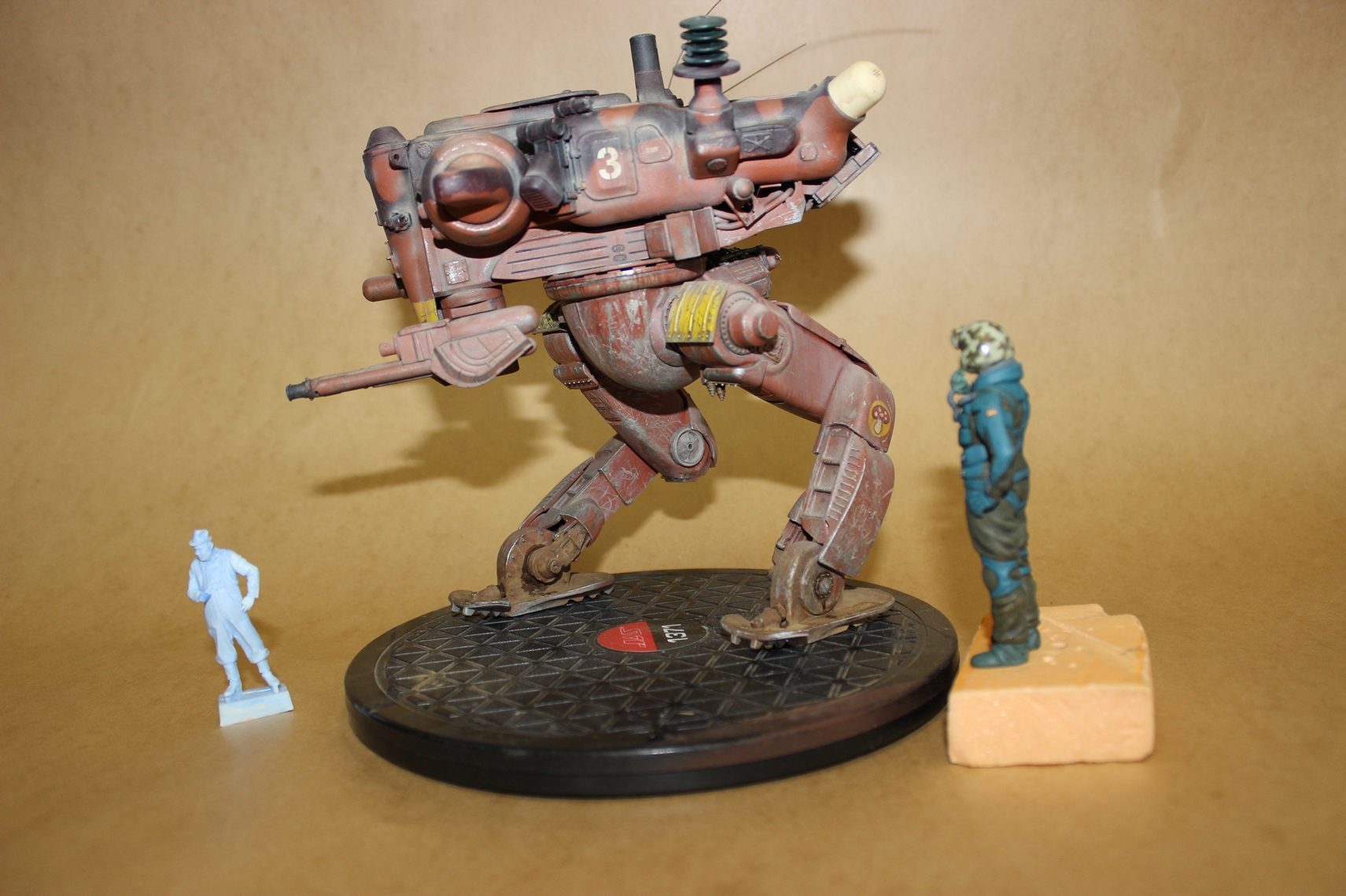 Собиралась вся конструкция на Космофене и саморезах, . Шарниры и "башня" впринципе подвижны. Получился "Цыпленок" немаленький - примерно 17-18 см в высоту. Масштаб классический для этой темы -1 к 20. Живьём-бы эта Цыпа была метра под четыре. Для понимания размера рядом стоят фигурки в 35 - мужик в шляпе и в масштабе 1к 20 - мужик - пилот (оператор) из наборов от Хасегавы. Грунт -тамия нитро, окраска: База -под титан (акрил от пасифика 88), затем химия МИГ для обдирки (чиппинг-эффект чтоли), далее окраска, камуфляж, обдирка в основном нижней части. (по легенде - длительное автономное дежурство на развалинах....ну пусть будет города Сиднея 8) ). затем декали - надписи и эмблемы пордразделения "Мухомор" взял у Хасегавы. Далее небольшая тонировка миговскими эмалями, затем пыль - пигменты и потёки от ГСМ от Мига.