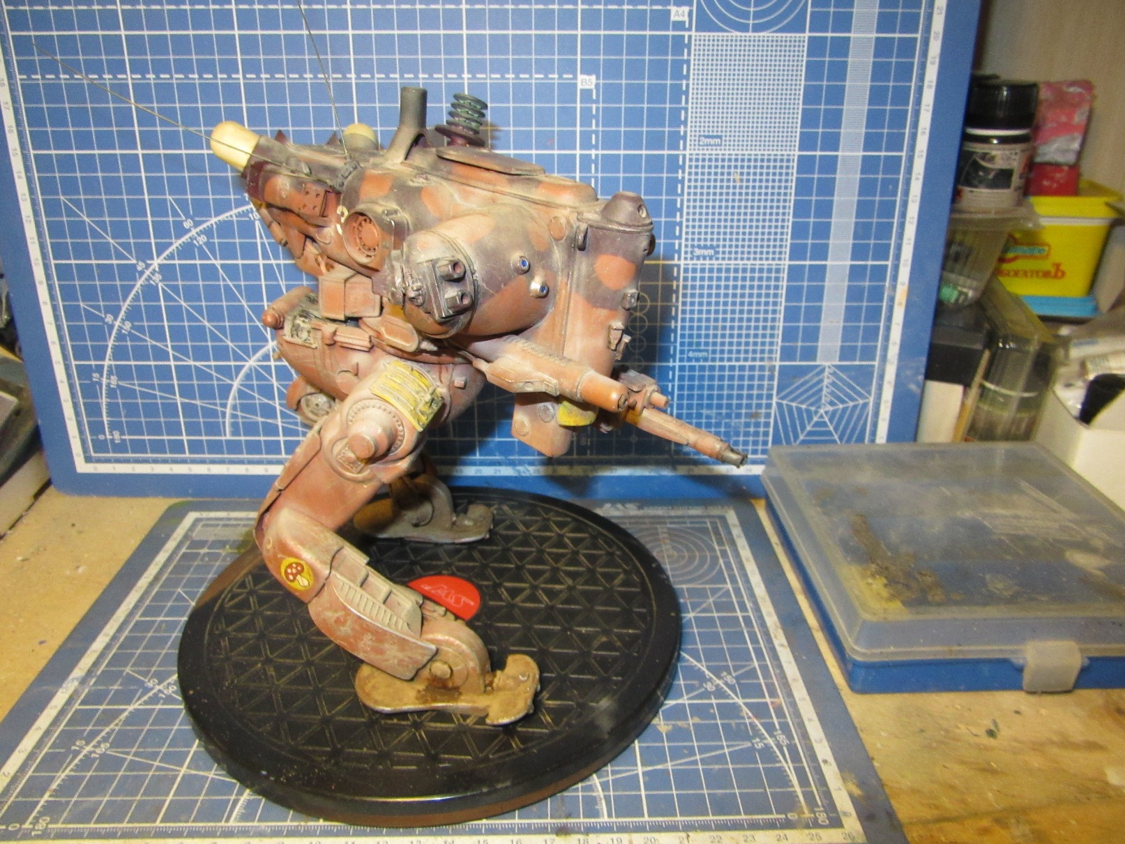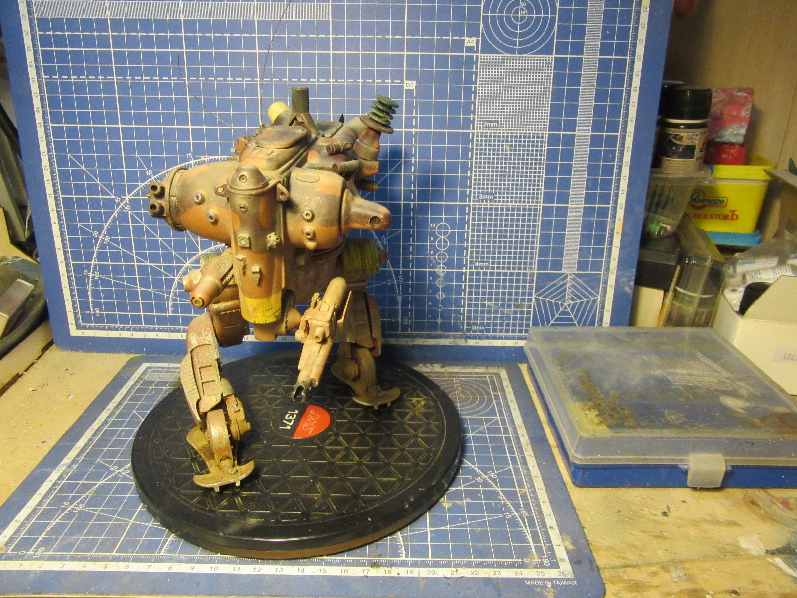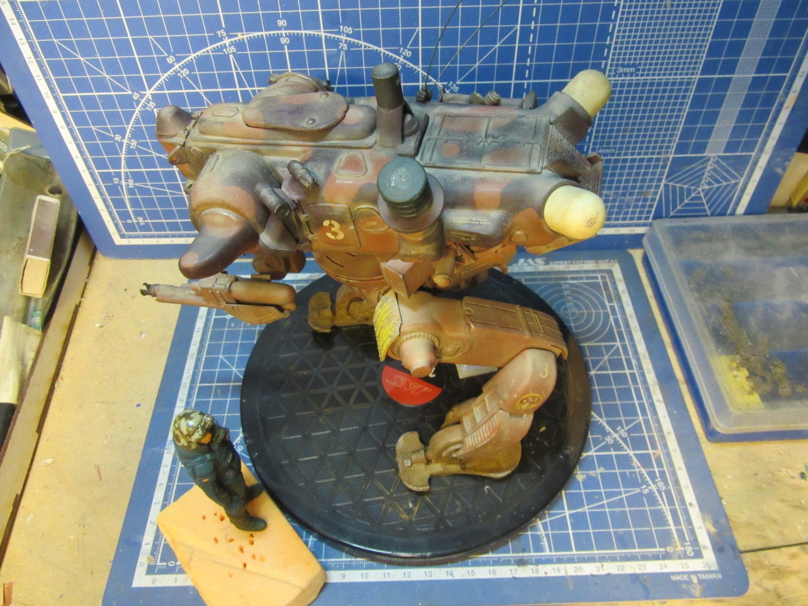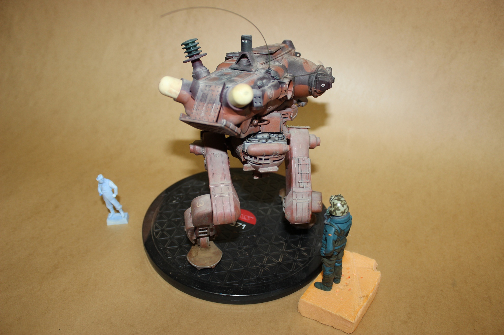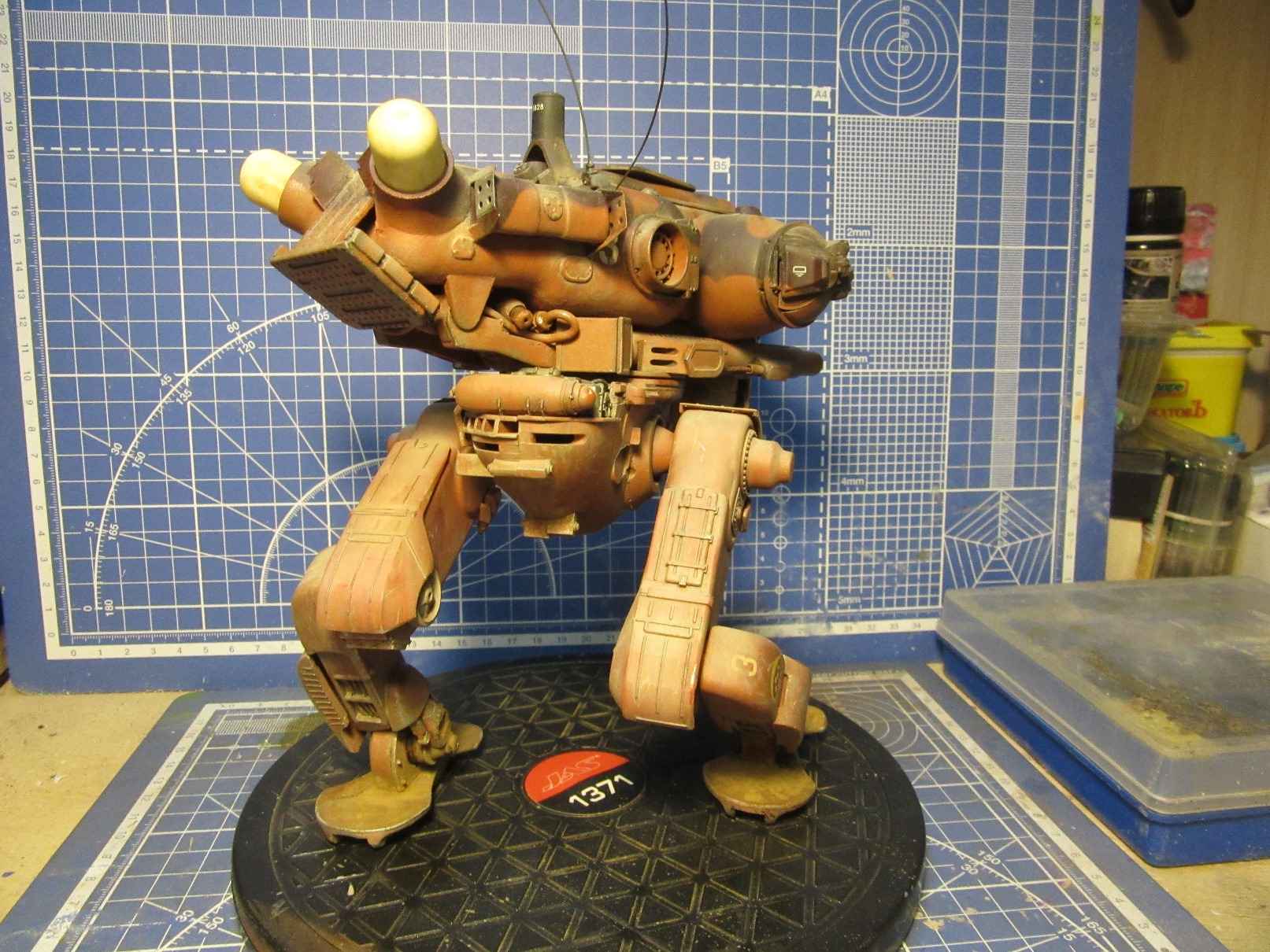 Собиралась вся конструкция на Космофене и саморезах, . Шарниры и "башня" впринципе подвижны. Получился "Цыпленок" немаленький - примерно 17-18 см в высоту. Масштаб классический для этой темы -1 к 20. Живьём-бы эта Цыпа была метра под четыре. Для понимания размера рядом стоят фигурки в 35 - мужик в шляпе и в масштабе 1к 20 - мужик - пилот (оператор) из наборов от Хасегавы. Грунт -тамия нитро, окраска: База -под титан (акрил от пасифика 88), затем химия МИГ для обдирки (чиппинг-эффект чтоли), далее окраска, камуфляж, обдирка в основном нижней части. (по легенде - длительное автономное дежурство на развалинах....ну пусть будет города Сиднея 8) ). затем декали - надписи и эмблемы пордразделения "Мухомор" взял у Хасегавы. Далее небольшая тонировка миговскими эмалями, затем пыль - пигменты и потёки от ГСМ от Мига.