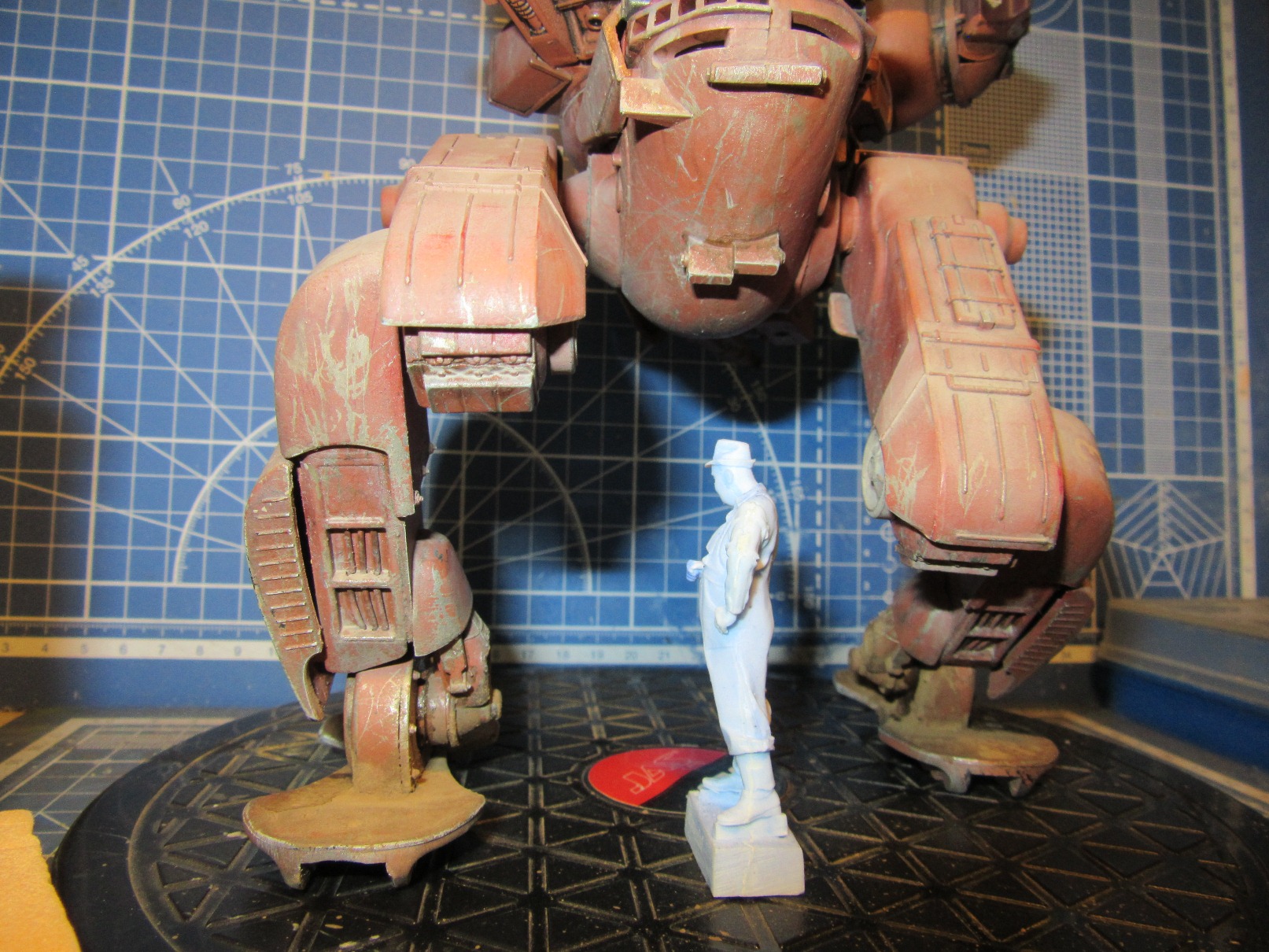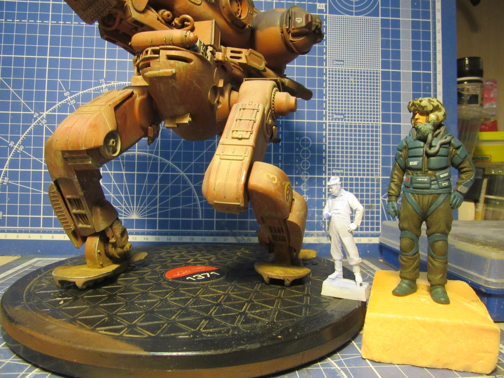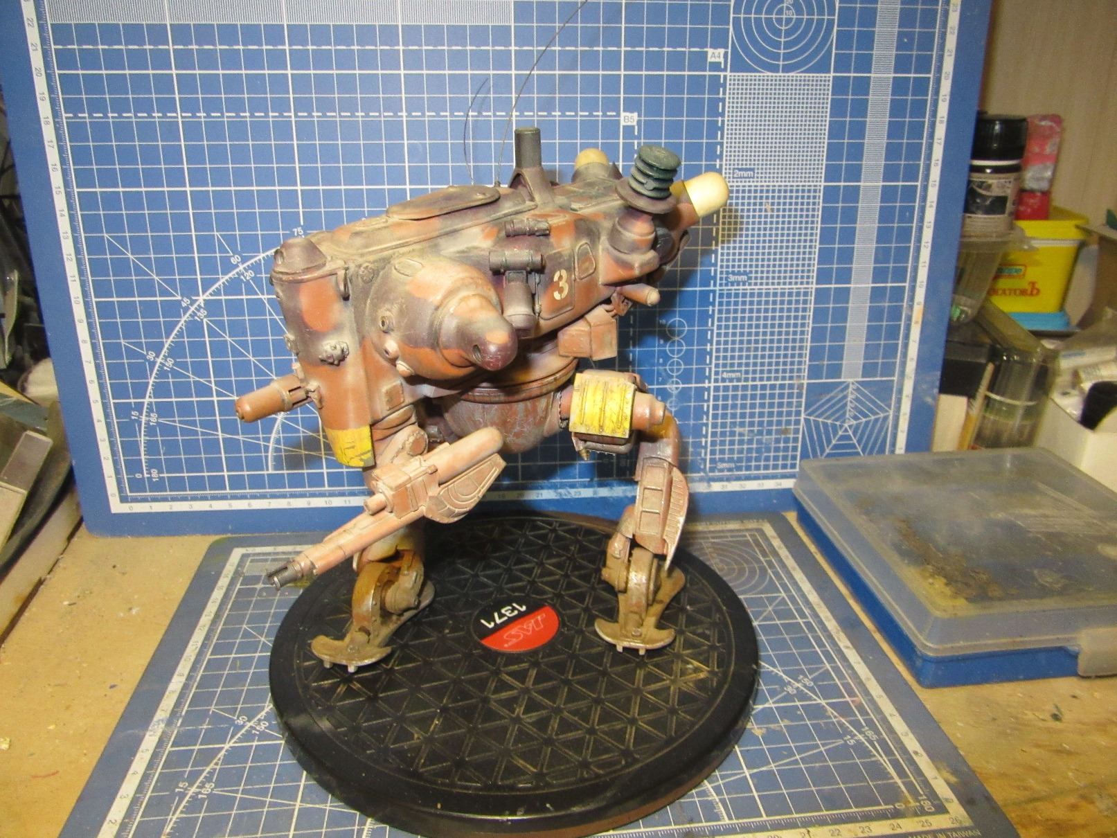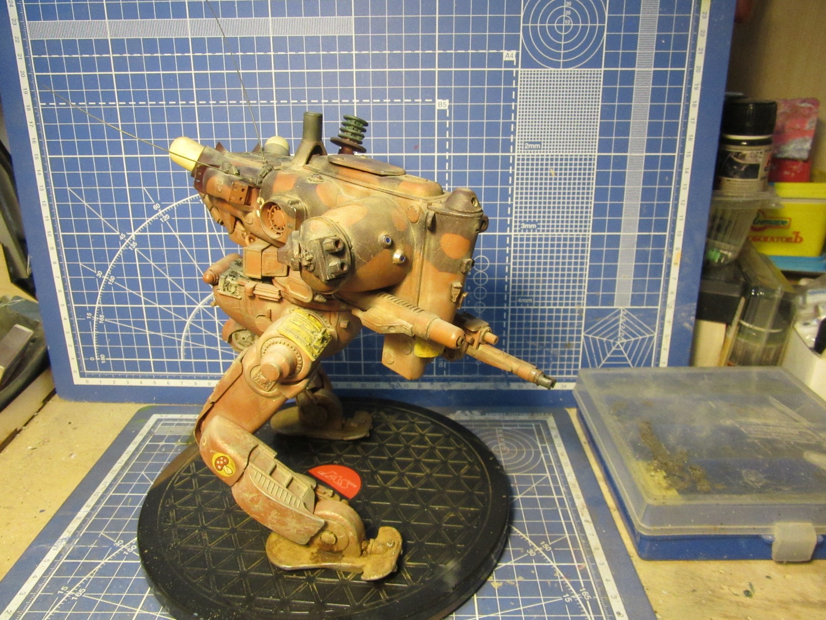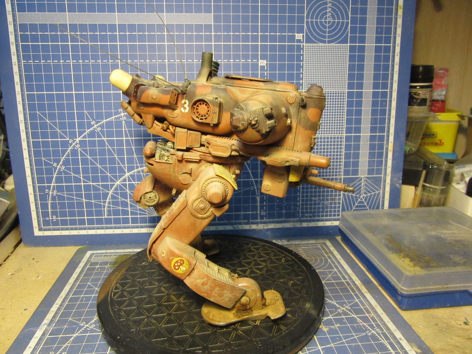 Собиралась вся конструкция на Космофене и саморезах, . Шарниры и "башня" впринципе подвижны. Получился "Цыпленок" немаленький - примерно 17-18 см в высоту. Масштаб классический для этой темы -1 к 20. Живьём-бы эта Цыпа была метра под четыре. Для понимания размера рядом стоят фигурки в 35 - мужик в шляпе и в масштабе 1к 20 - мужик - пилот (оператор) из наборов от Хасегавы. Грунт -тамия нитро, окраска: База -под титан (акрил от пасифика 88), затем химия МИГ для обдирки (чиппинг-эффект чтоли), далее окраска, камуфляж, обдирка в основном нижней части. (по легенде - длительное автономное дежурство на развалинах....ну пусть будет города Сиднея 8) ). затем декали - надписи и эмблемы пордразделения "Мухомор" взял у Хасегавы. Далее небольшая тонировка миговскими эмалями, затем пыль - пигменты и потёки от ГСМ от Мига.