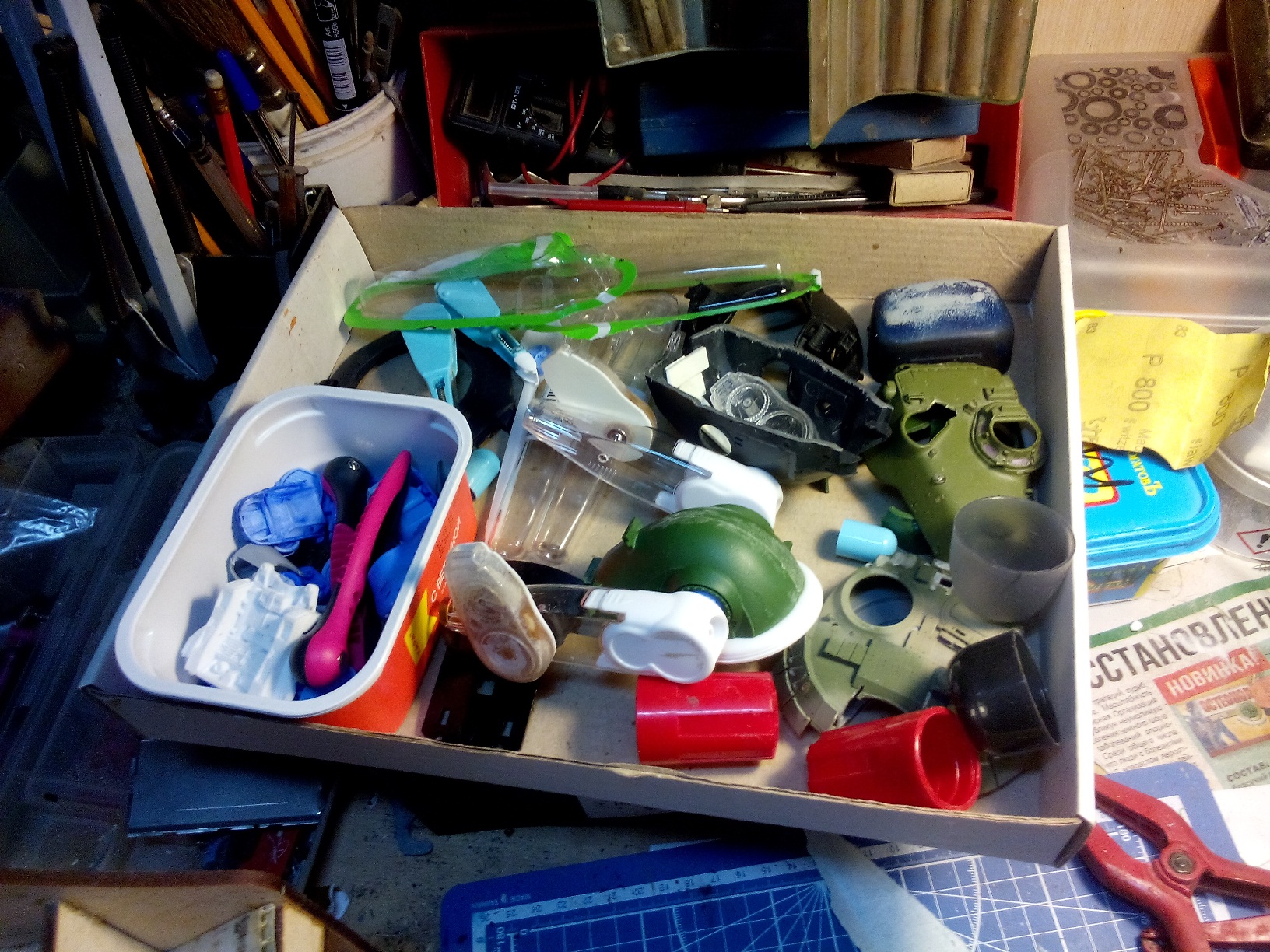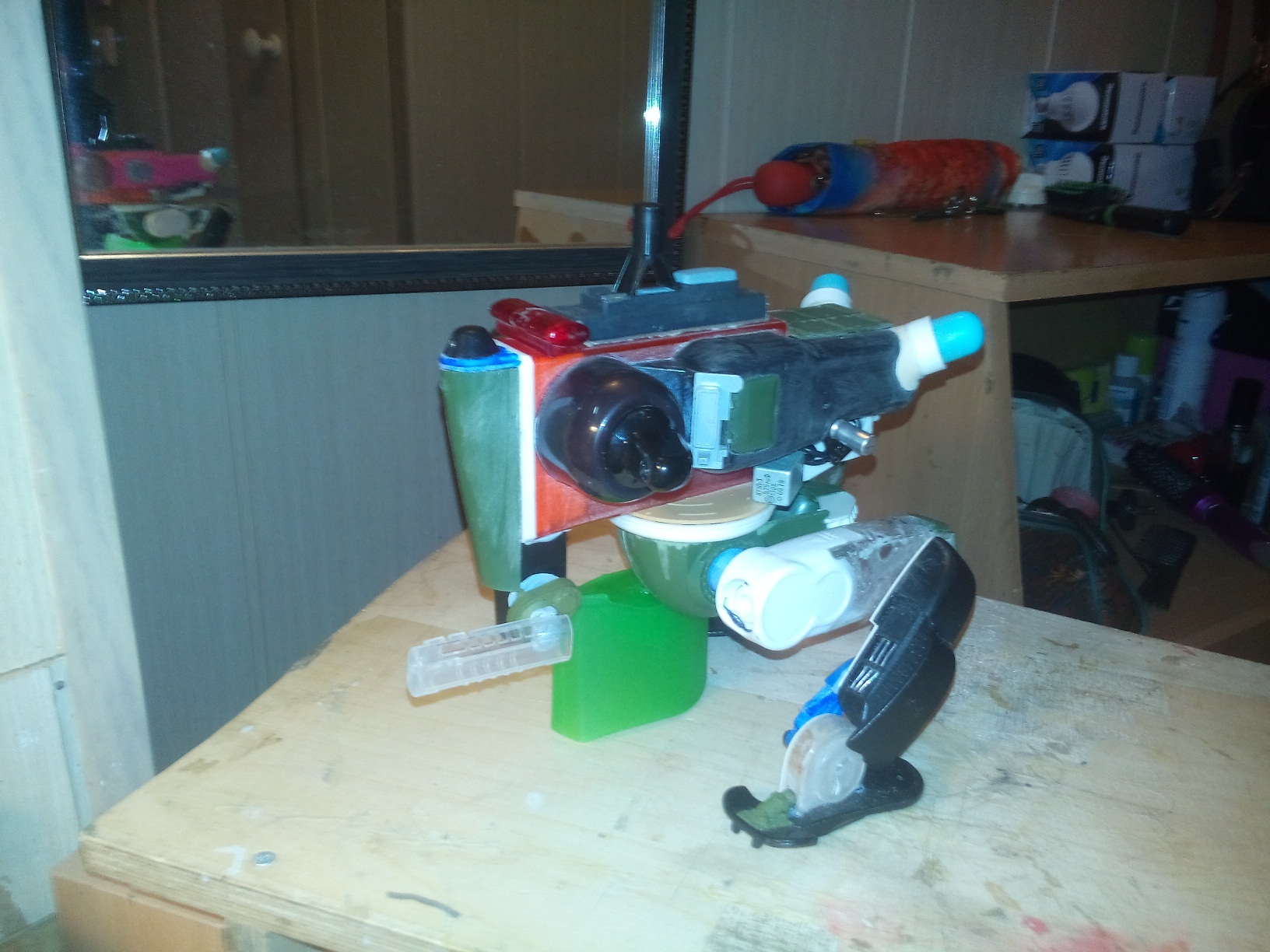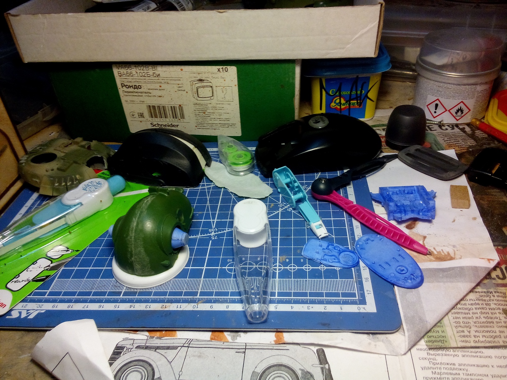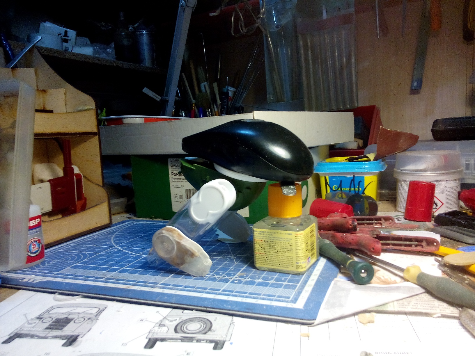 Строить начал из всего, что могло оказаться под руками, перебирал множество вариантов внешнего вида и компоновки, самое трудное было останолвиться на чем-либо конкретном, ибо вариативность бесконечная. Вобщем использовалось все, начиная с деталей 35 и 24 масштабов, канцелярские принадлежности и до деталей из наборов крепежа щеток стеклочистителей, что обычно россыпью идет в упаковках "дворников" и выбрасывается за ненадобностью.