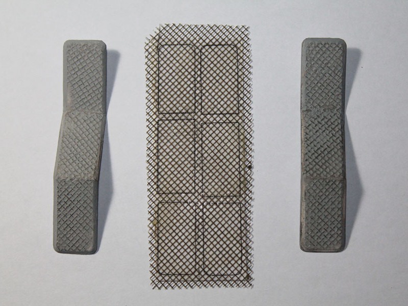 Поэкспериментировал с рифлением на полках. Из всего, до чего руки дотянулись понравилась москитная сетка - нашел подраную кошками и вырезал из неё кусок. Первый вариант получился так себе - местами перезалил цианоакрилатом, буду пробовать ещё