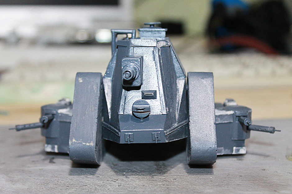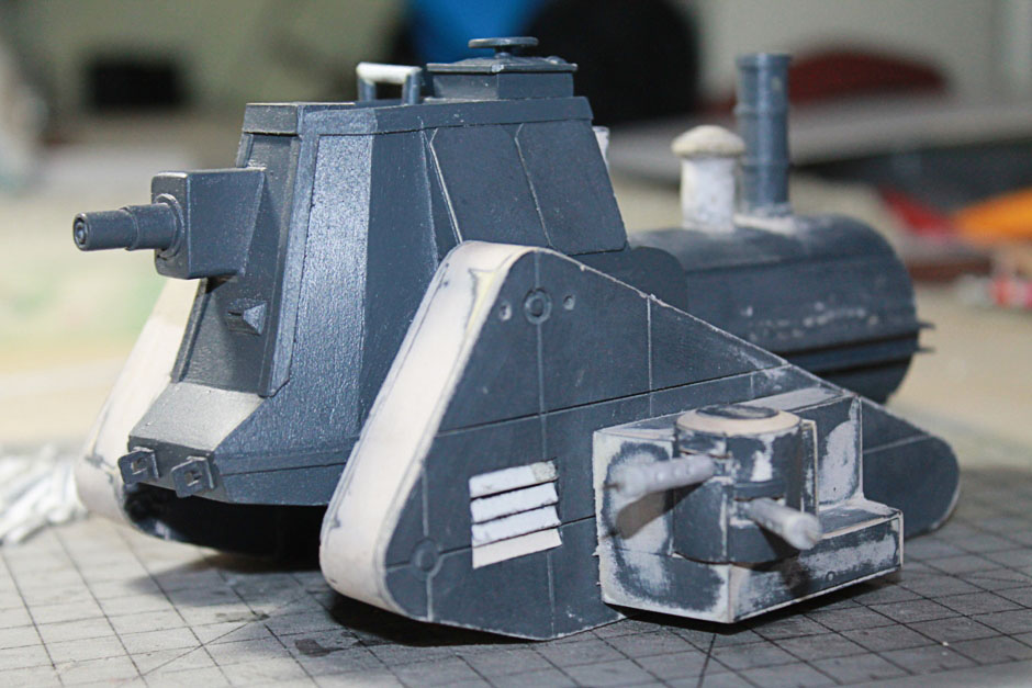 Вклеил пулемётные башни (надо было глубину резкости больше выставить - пулемёты не в фокусе), ходовую часть одел на штифты, пока не приклеивал