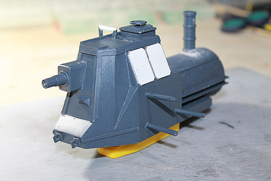 Сделал фару. Приклеил манометр — и тут же отломил его, так что пока отложил в сторону. И смотровые приборы на бортовые спонсоны сделал — но... скорее всего, смахнул их вместе с мусором, так что — буду переделывать