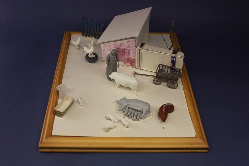В планах следующие доработки. Центральным объектом будет бабушка и свинья. Бабушкину свинью планирую переделать в хряка со всеми гендерными признаками. Неестественно изогнутая коричневая свинья перекочевала из набора Звезды про фашистов на мотоцикле. Ее надо "выпрямлять". Недостающую живность (кролики, свиньи и куры) попробую слепить самостоятельно. Надо еще сделать дерево с листвой. Сарай, стену и забор. Бочки и корыто. В общем работы много.