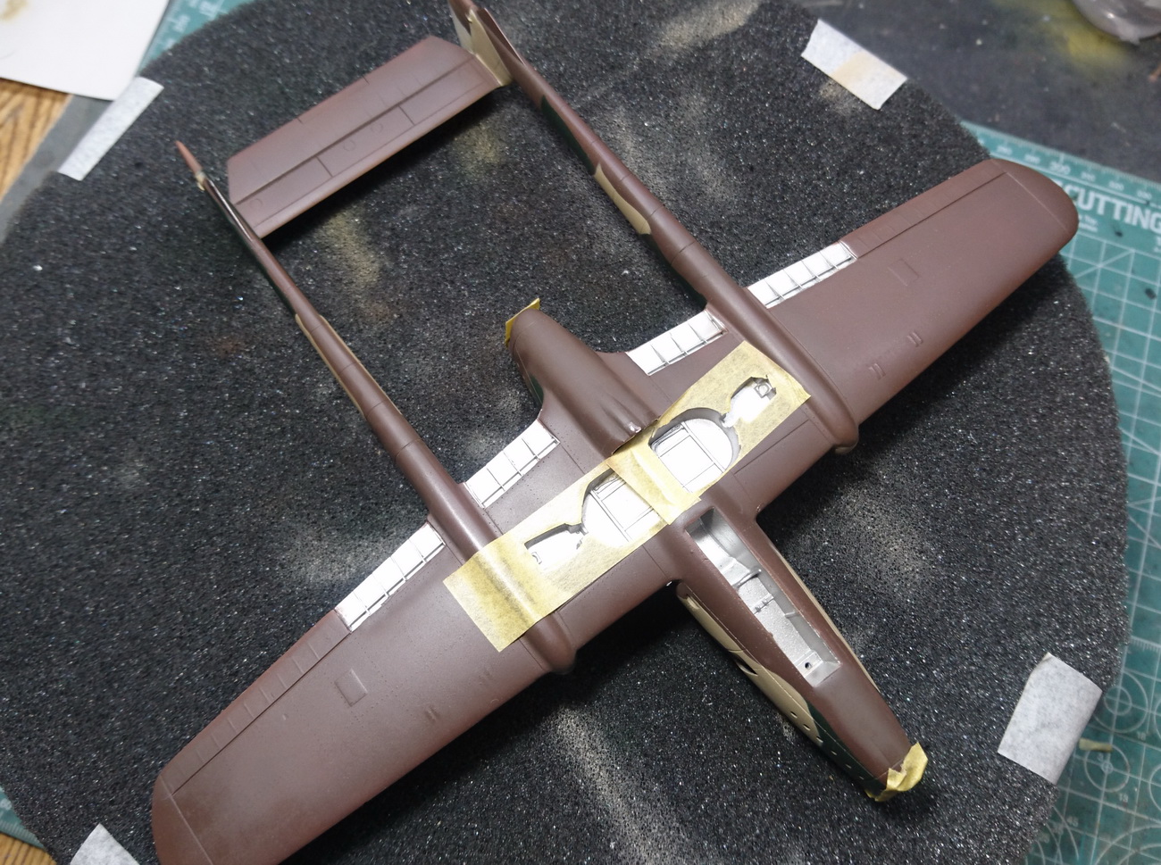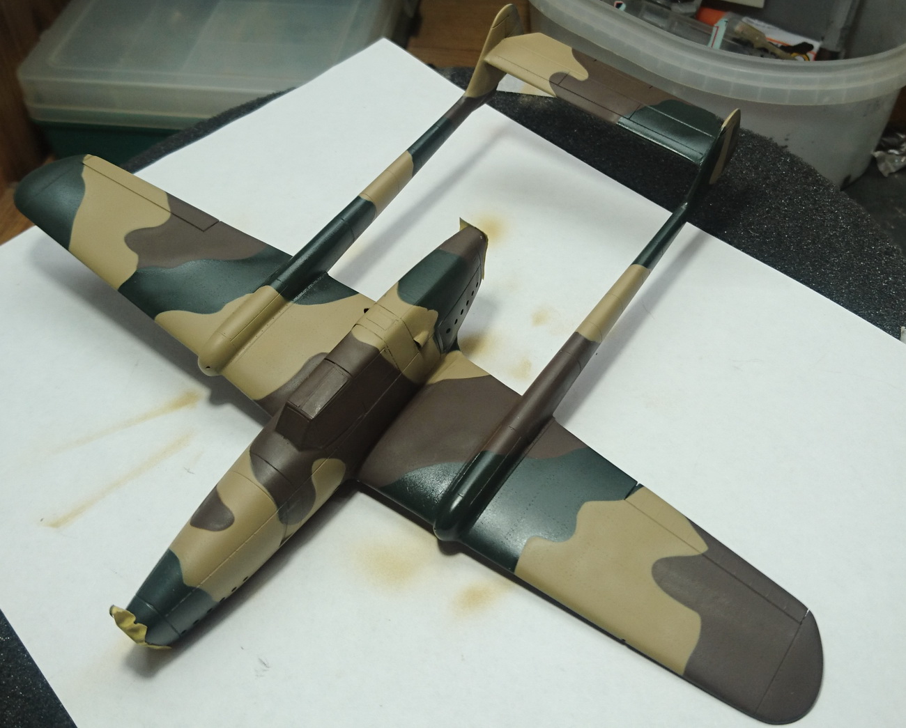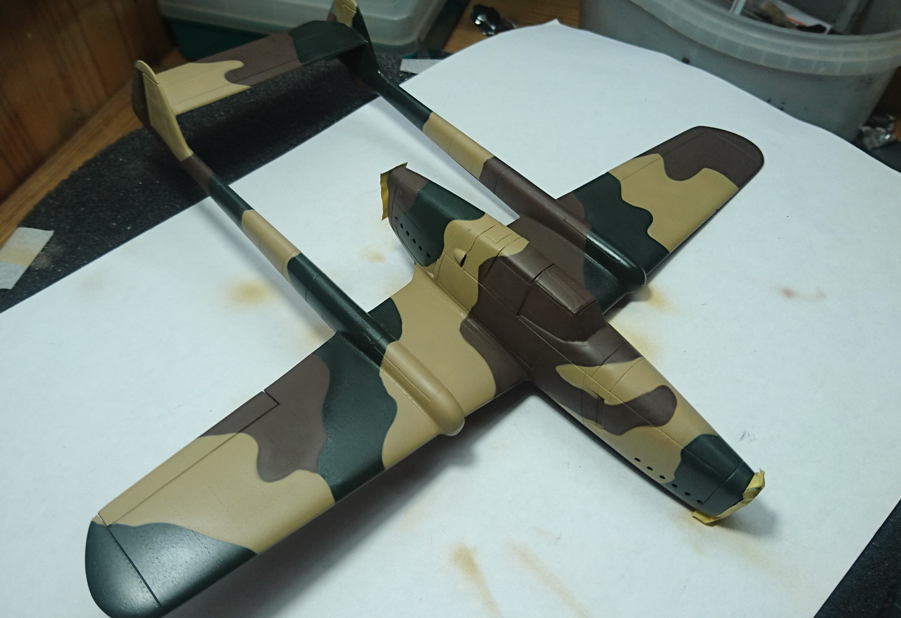 Что-то мой перерыв затянулся. Нанёс камуфляж...Использовал краски Hobby Boss Dark Dreen, Khaki Brown и Mr. Color Mahogany..За достоверность не ручаюсь...Вообще голландских камуфляж довольно странный, к тому же этот самолёт экспериментальная машина, налетавшая всего несколько часов.