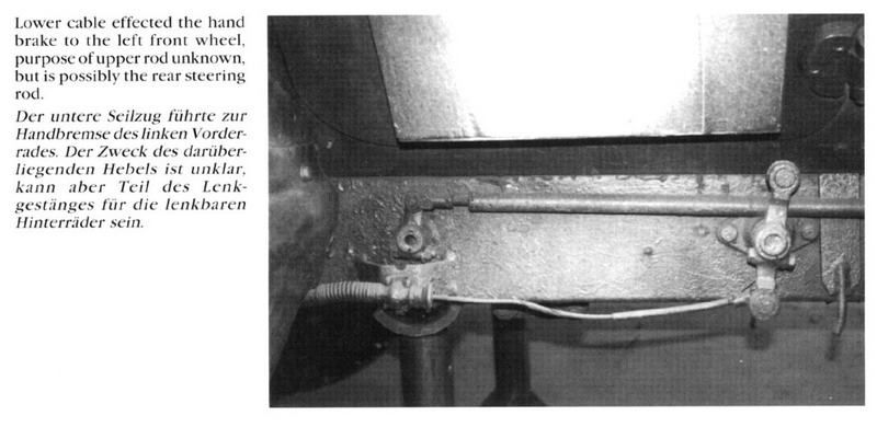 А этого похоже даже умные дяди не знают, судя по подписи к фото. Но вроде есть подозрение, что это какая-то рулевая тяга, видимо для управления поворотом задних колес. Там как раз ещё какая-то рукоятка рядом с ручником.