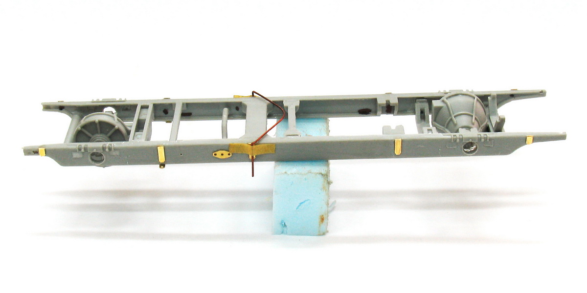 Точнее тормозные тяги. Они отлиты вместе с рамой. Придется срезать и делать их из проволоки. Они то на виду...