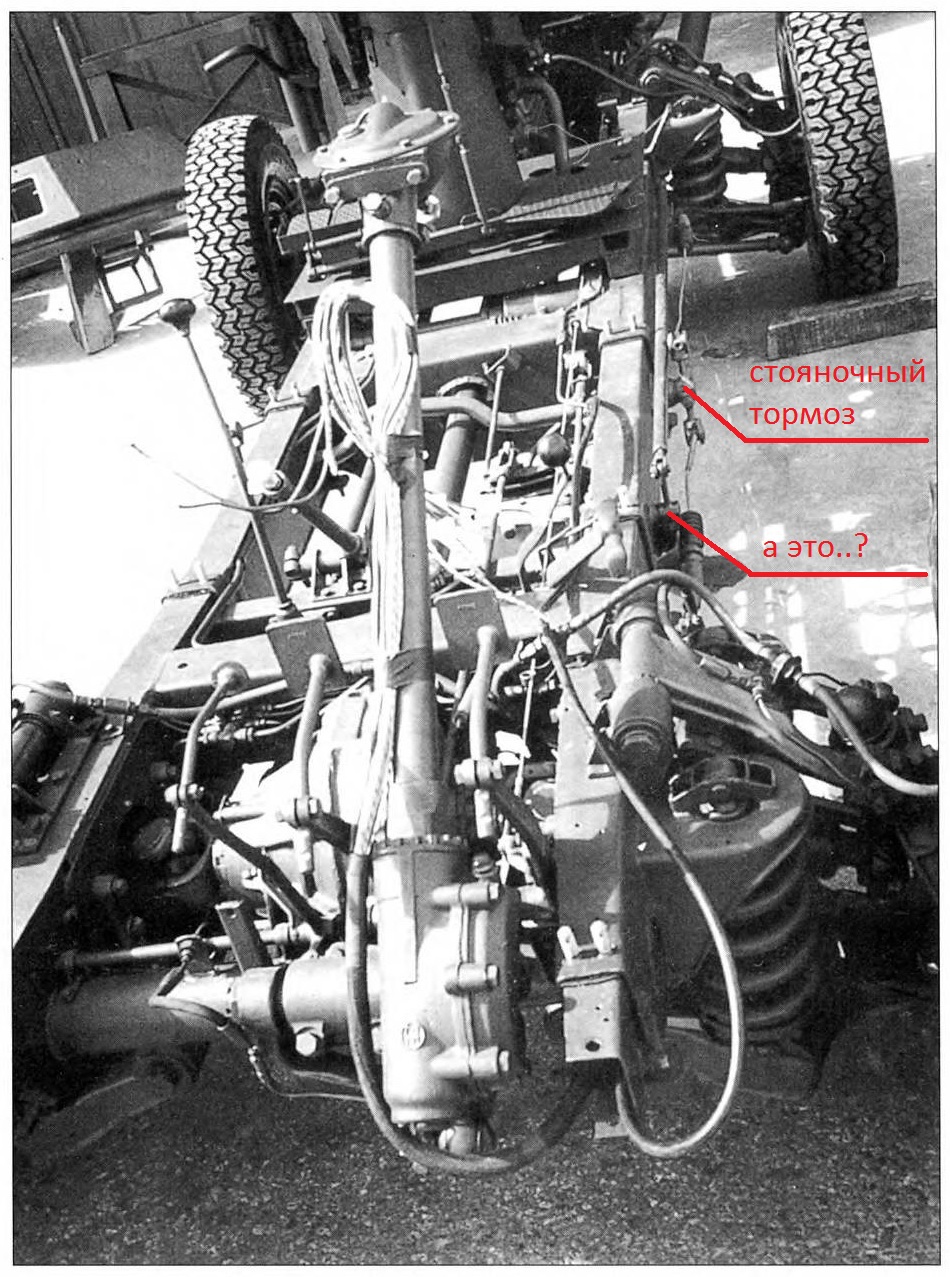 На фото пометил. Двуплечие качалки с обоих бортов - ручник на все колеса, а вот одноплечая качалка и тяга идущая куда то на зад по левому борту это что?
