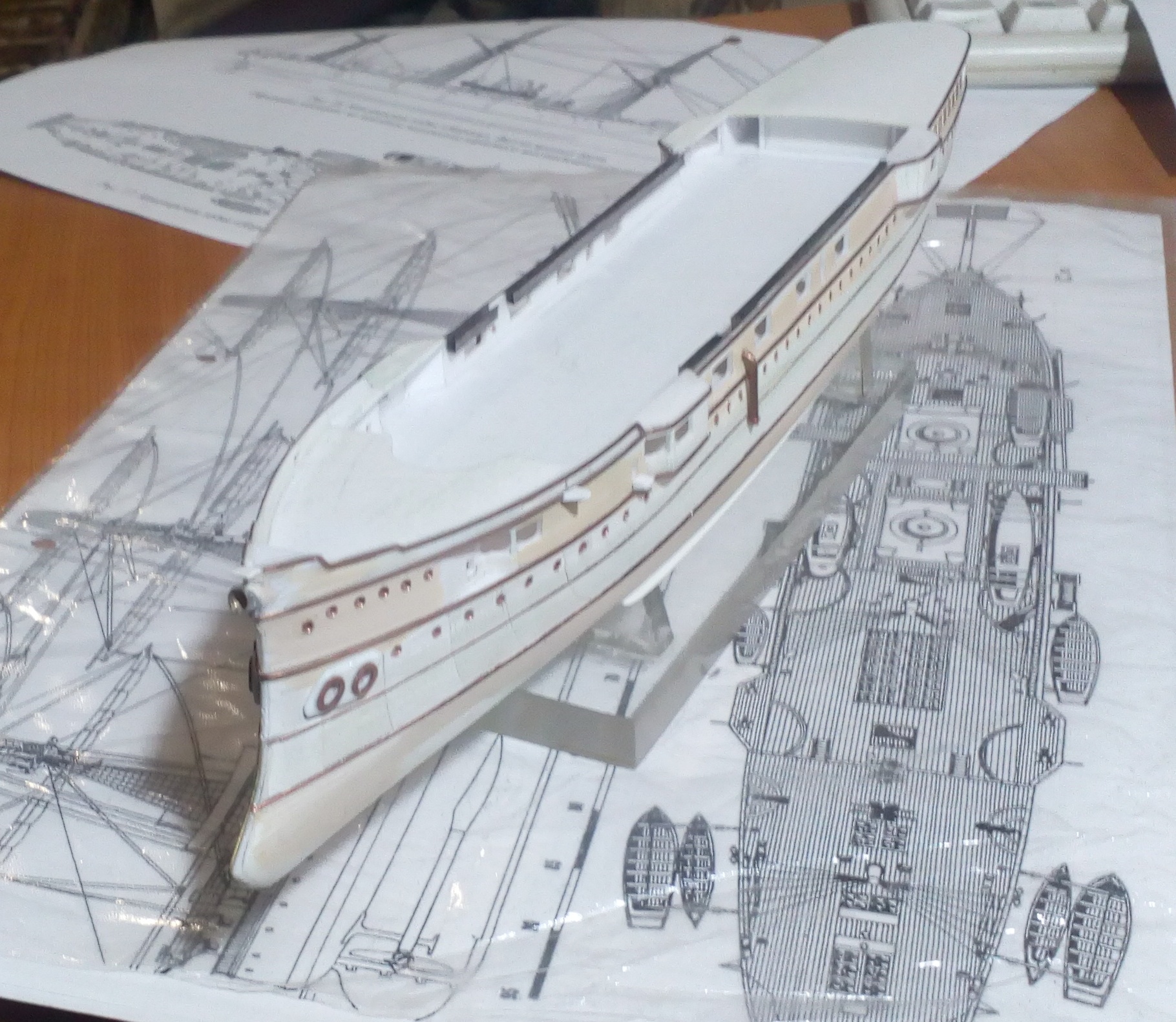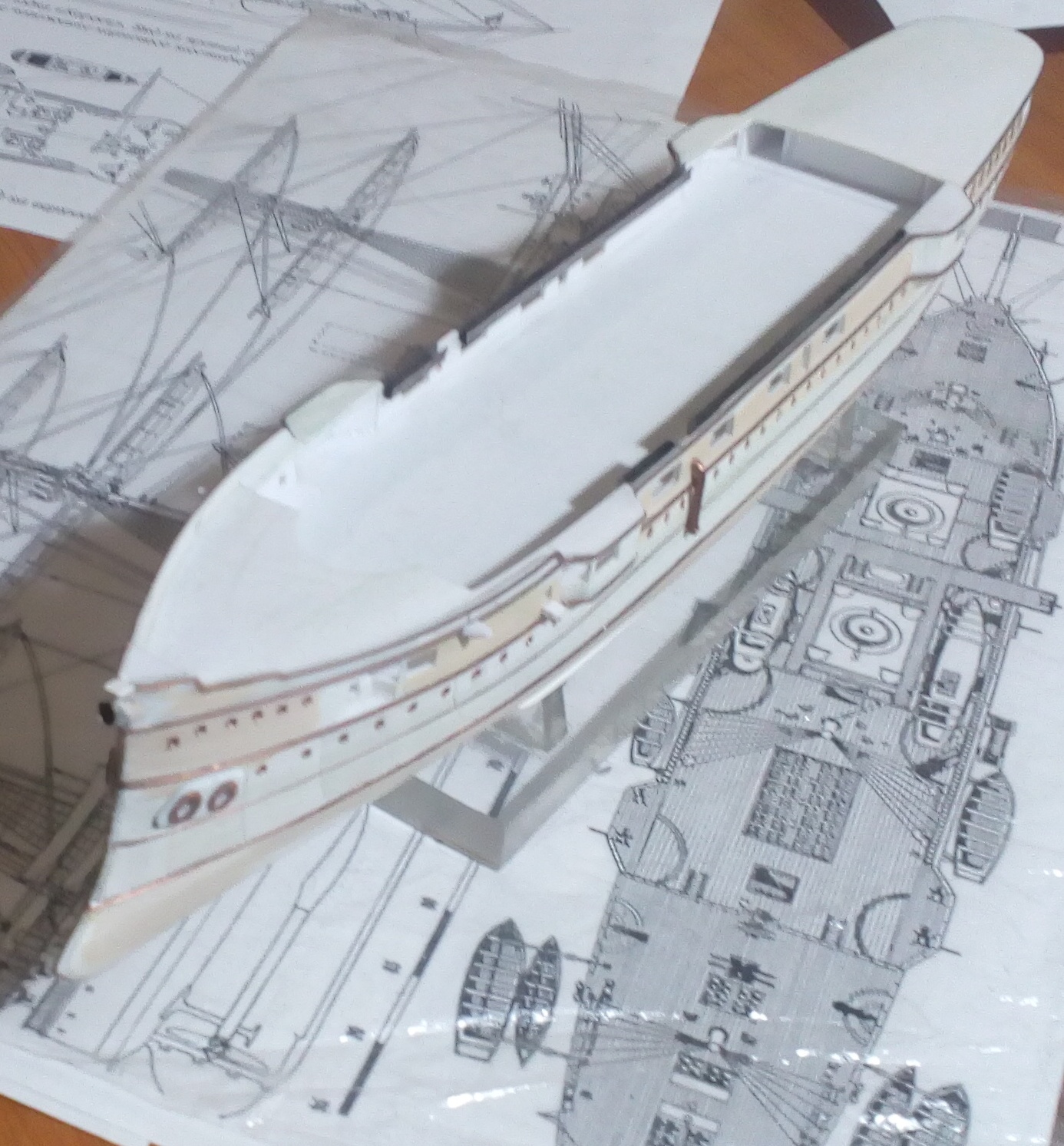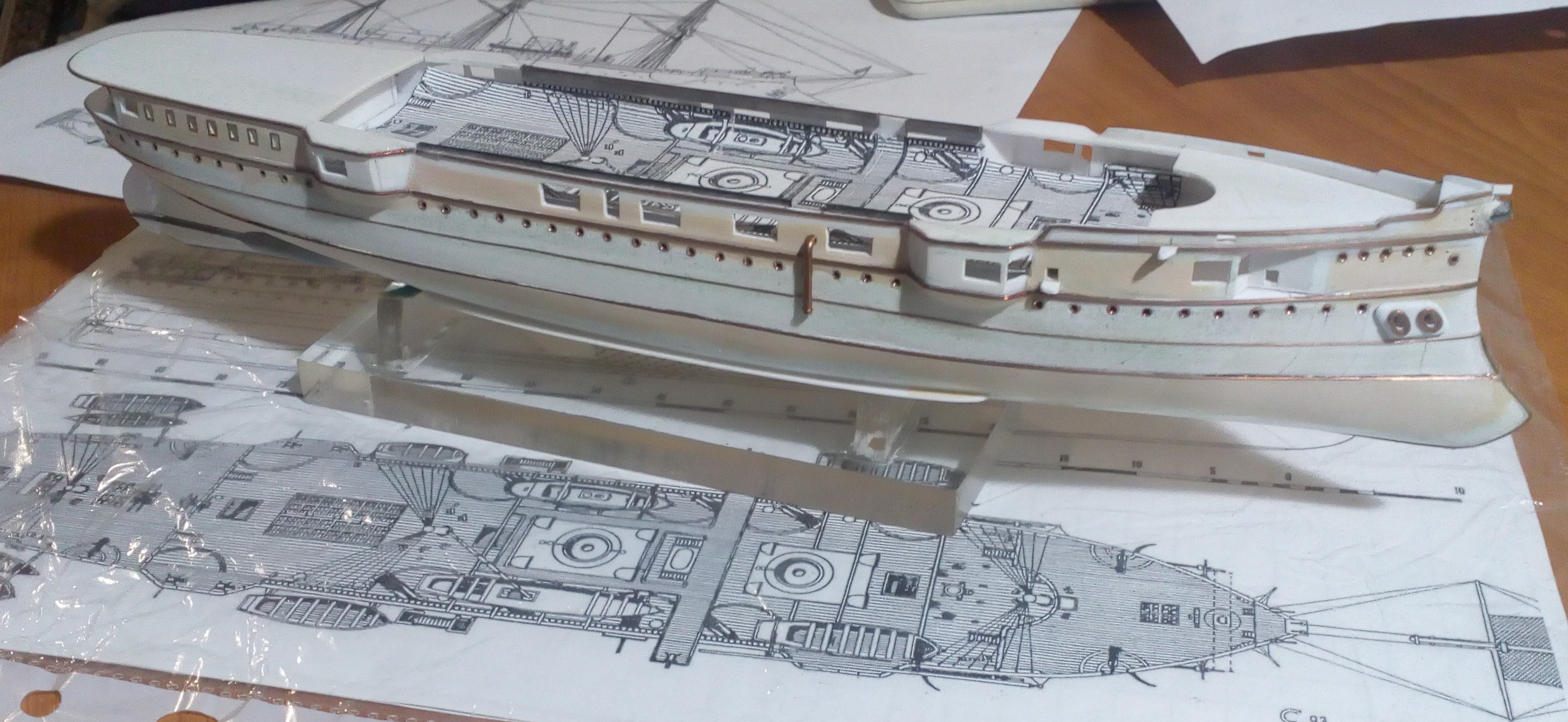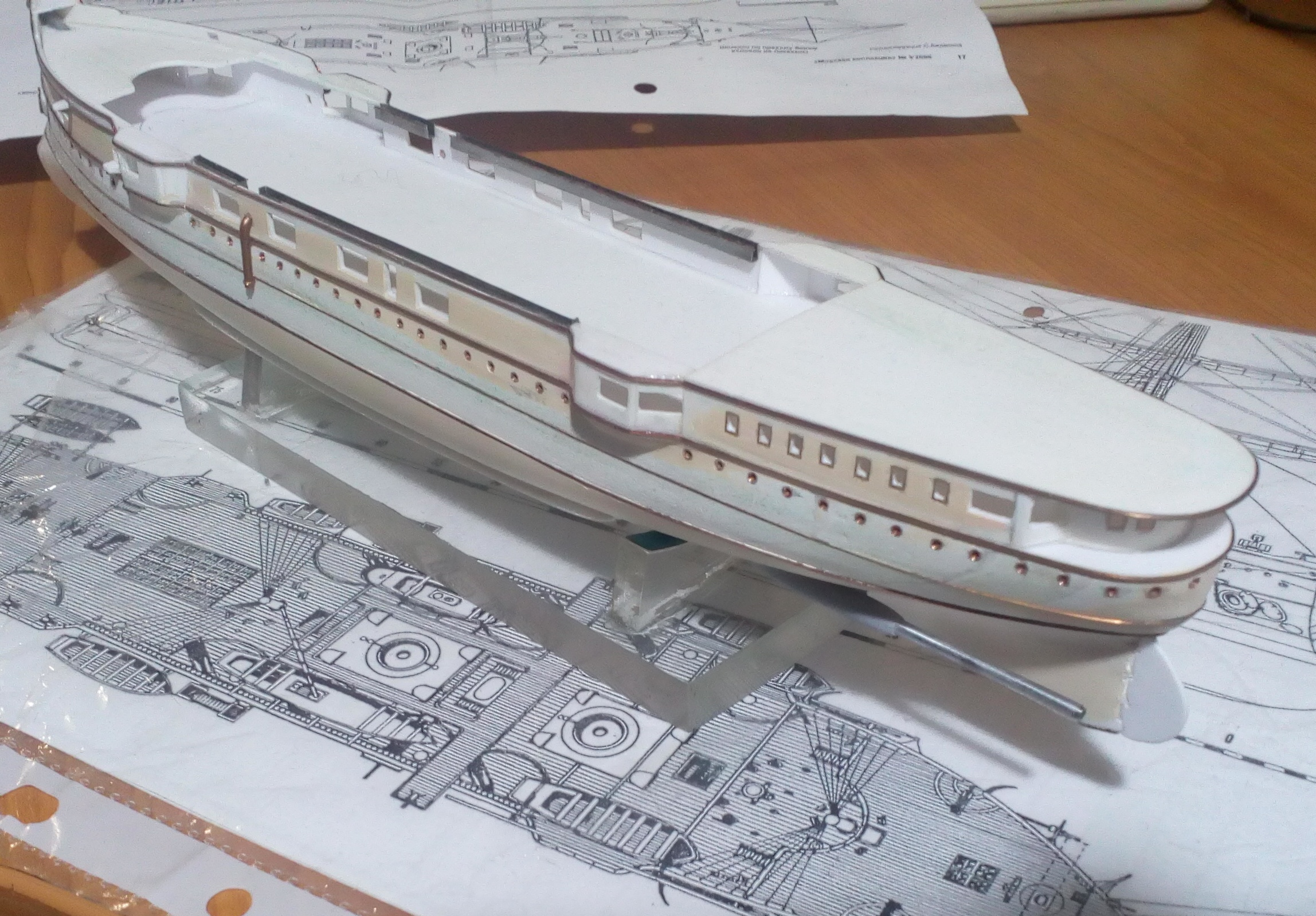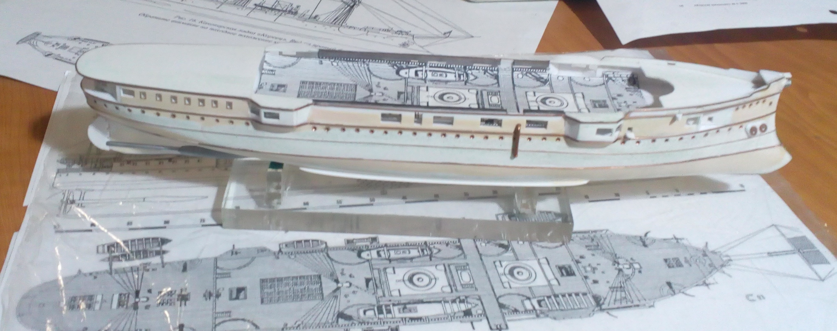 Вашу стройку смотрю, то, что получается нравится, особенно если учесть что корпус из бумаги.. Немного фото по модели. Установлены иллюминаторы, якорные клюзы, гребные валы и по мелочам. Вопрос к знатокам по окраске на начальный момент службы. Корпус черный, ниже ватерлинии медные листы, но выше медной обшивки по фото идет широкая полоса- какого цвета?