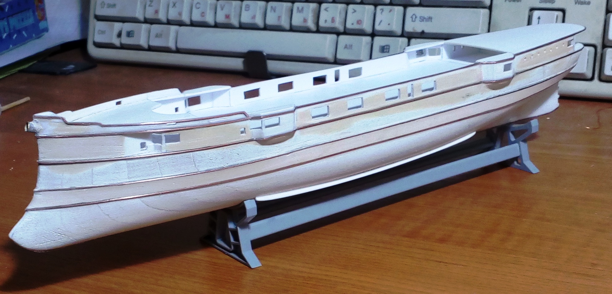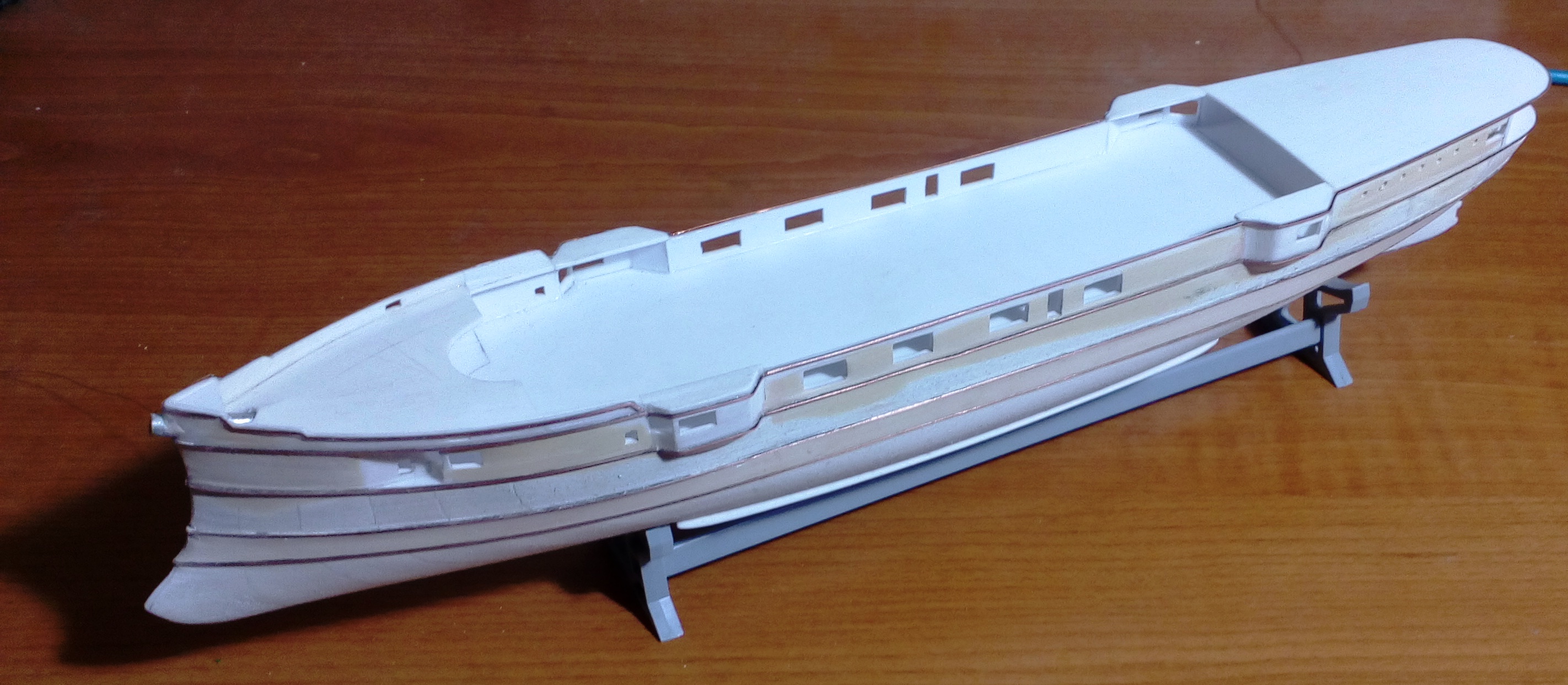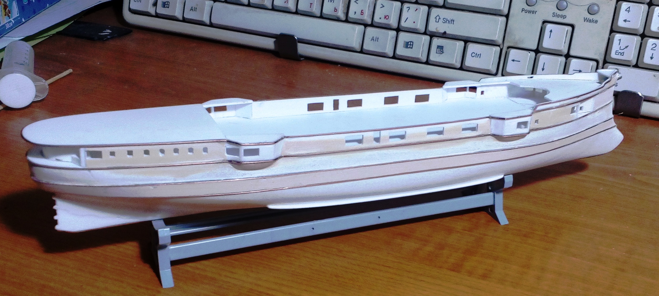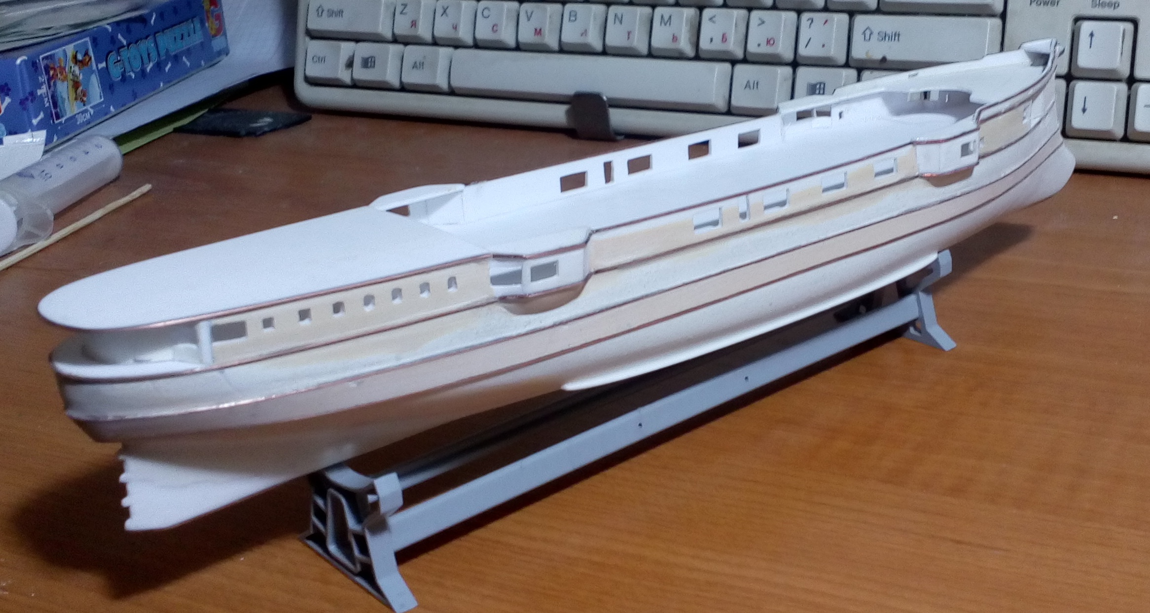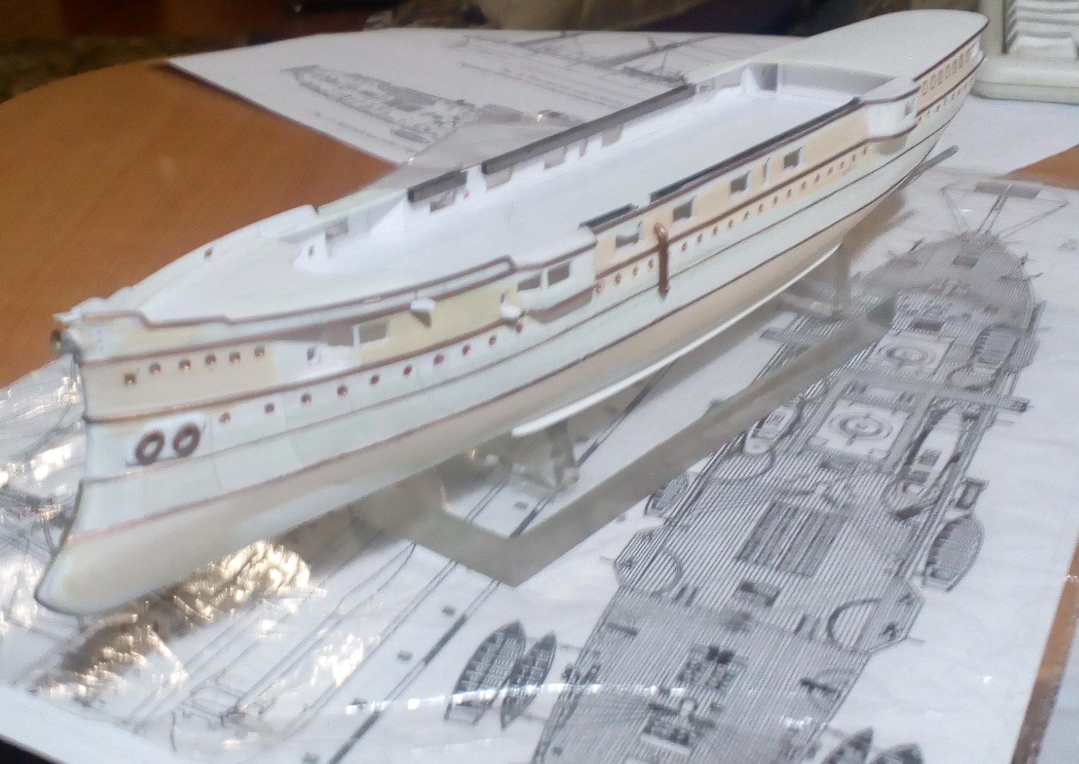 Вашу стройку смотрю, то, что получается нравится, особенно если учесть что корпус из бумаги.. Немного фото по модели. Установлены иллюминаторы, якорные клюзы, гребные валы и по мелочам. Вопрос к знатокам по окраске на начальный момент службы. Корпус черный, ниже ватерлинии медные листы, но выше медной обшивки по фото идет широкая полоса- какого цвета?