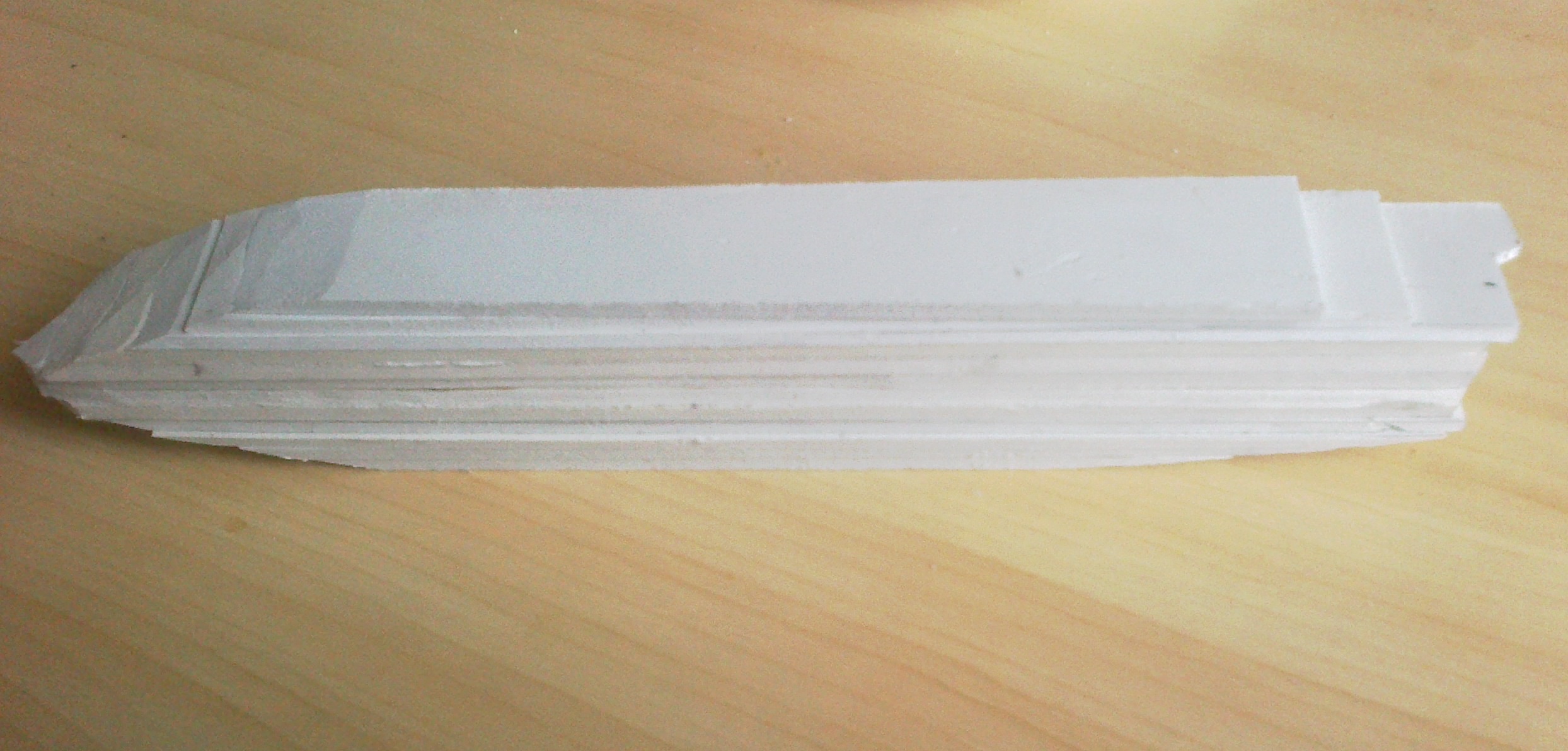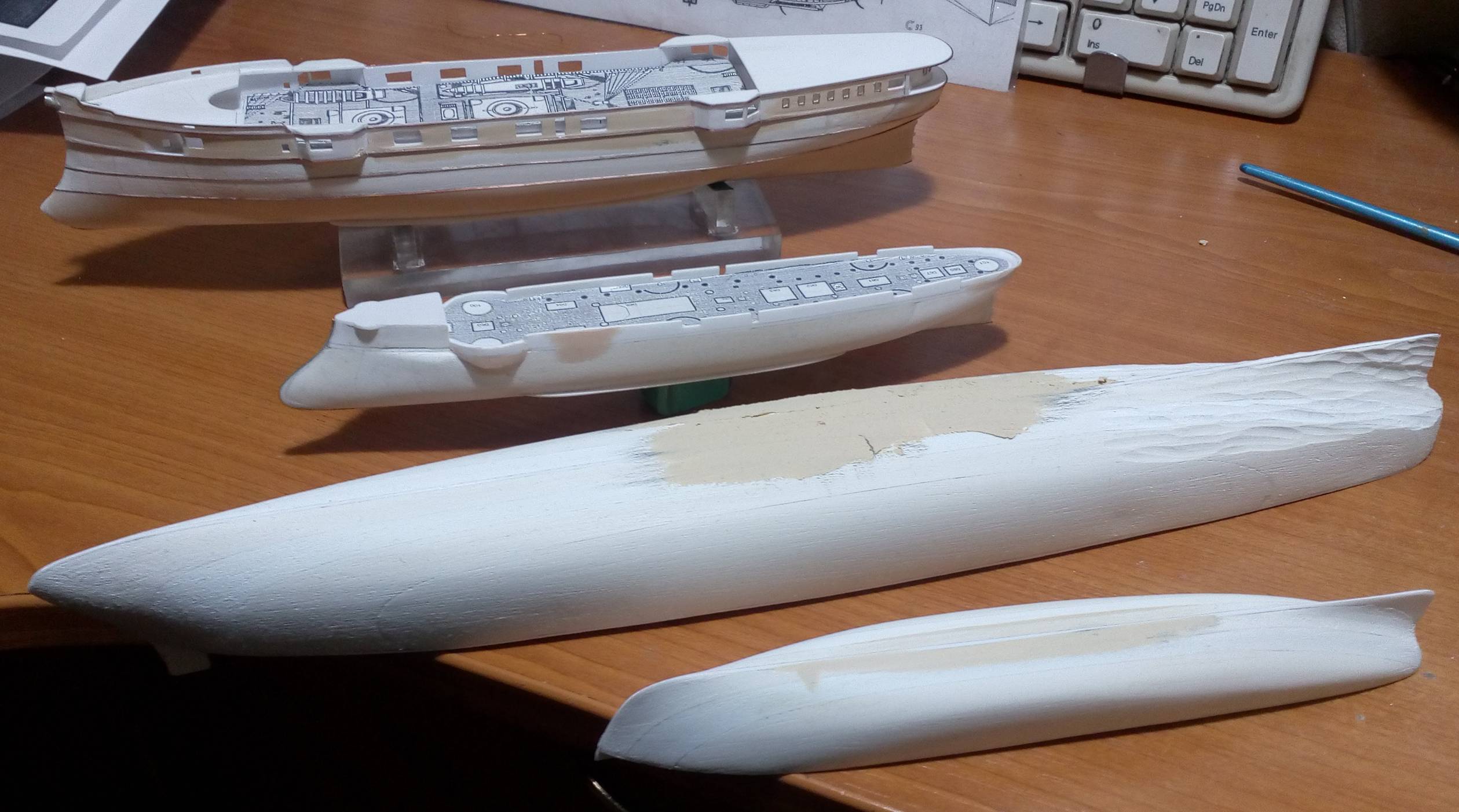 Технология проста. Берем чертеж , по нему делаем шаблон корпуса по ДП без фальшборта и батарейной палубы. Вырезаем их из 1мм пластика. Приклеиваем по центру палубы ДП клеем секунда. Далее оба борта набираем из полос пластика ПХВ как на фото. Между собой клеим на ту хе секунду. Далее обрабатываем корпус по батарейной палубе канцелярским ножом. По шаблонам при помощи ножа и наждачки обрабатываем корпус. После клеим из 1мм пластика фальшборт и палубы полубака и полуюта. Прорезаем порты, подшпаклевываем и т.д. На изготовление корпуса в 350 масштабе у меня уходит примерно 6 часов..