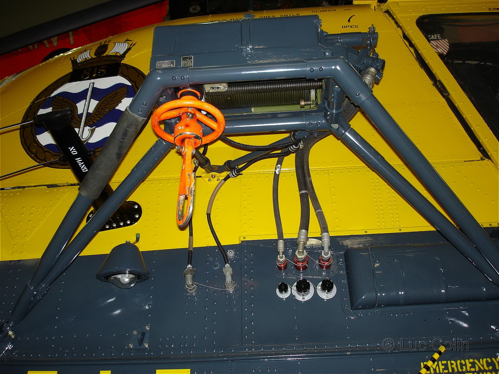 Уж не знаю как там было у них и в те времена, но должен быть механизм амортизации гасящий рывки при взлете когда груз поднимают. Вот он и вывешен на стропах, а уж от него идет основной трос. В полете без груза все это подтягивалось к фюзеляжу чтобы не болталось. скорей всего и замок и механизм были в одном флаконе.