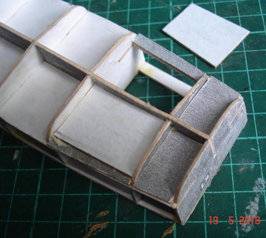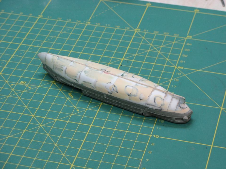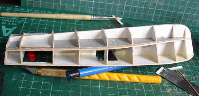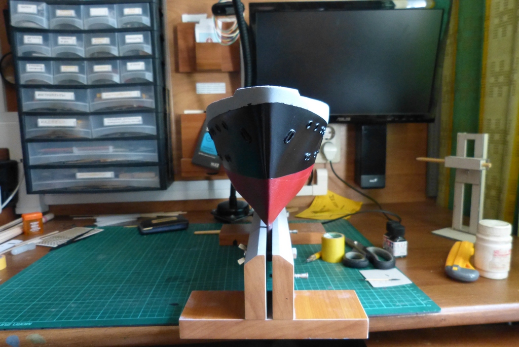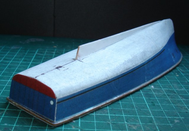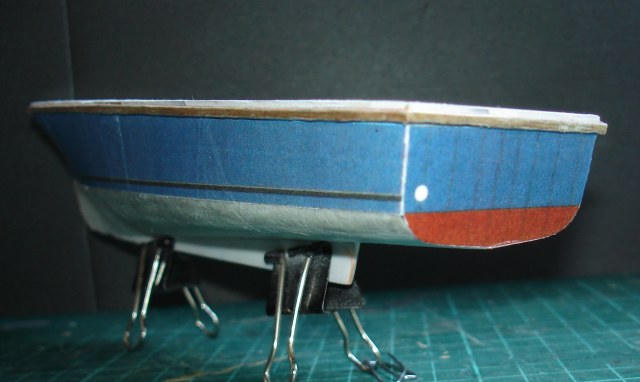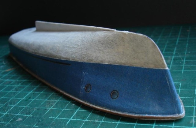 Добрый день! Я думаю вот как: надводный борт из того же картона, что и каркас, т.к нужно будет много отверстий вырезать, а подводную часть из пенополистирола, затем марля пропитанная акриловым лаком в 1-2 слоя. ПВА не хочу применять так как он даже при полной кристаллизации все равно остается как бы тягучим, да и шкурится он очень плохо.