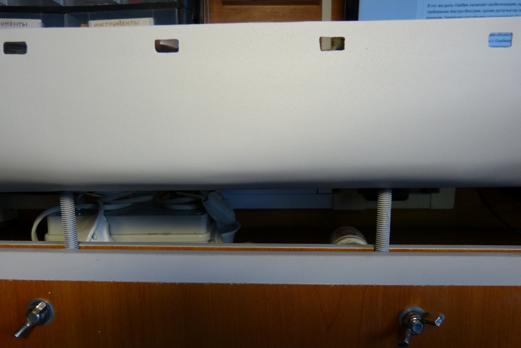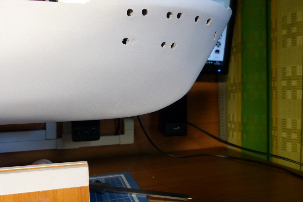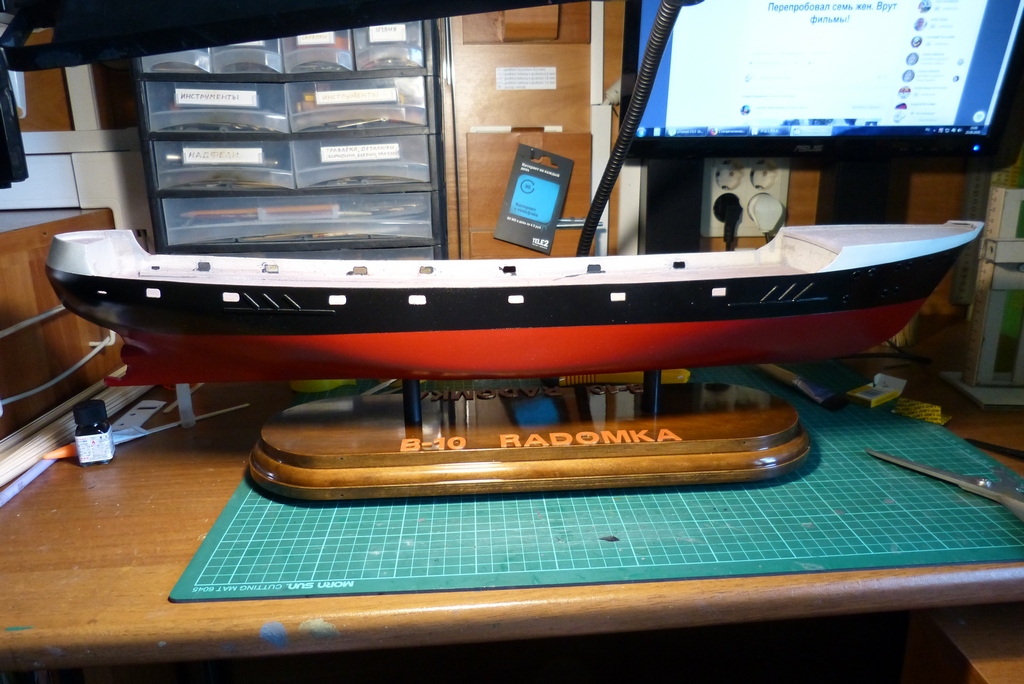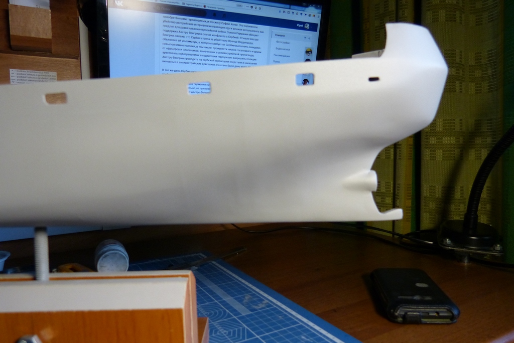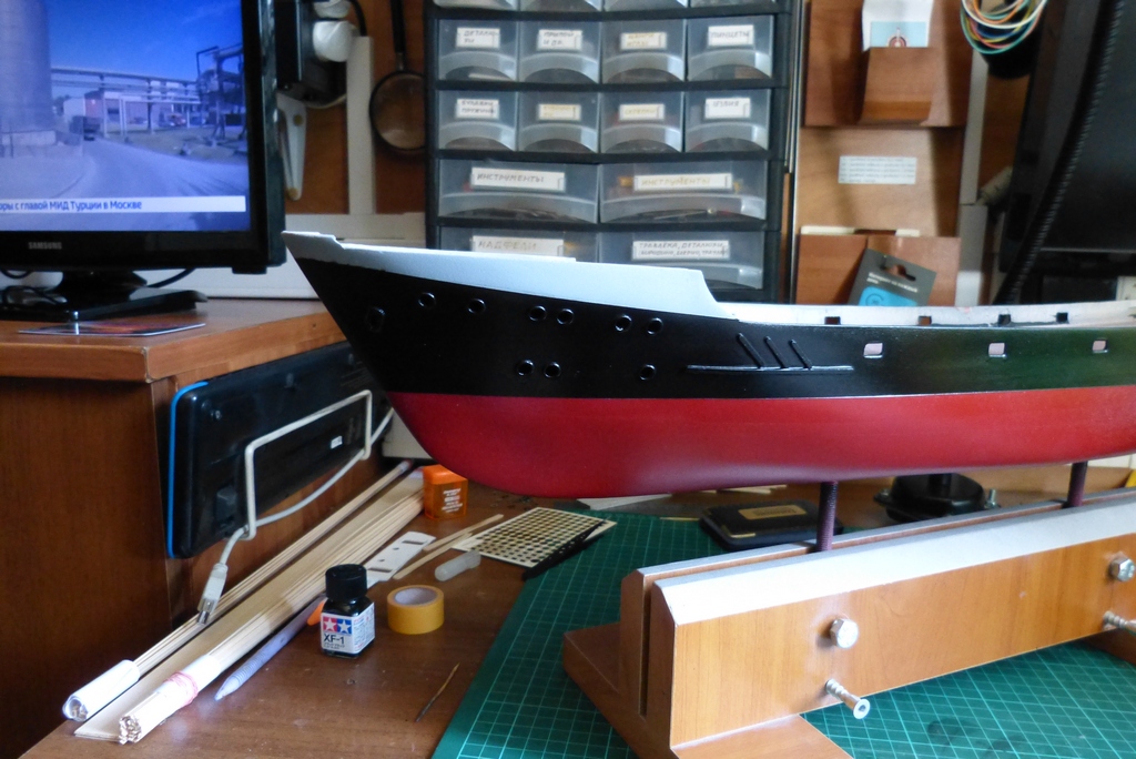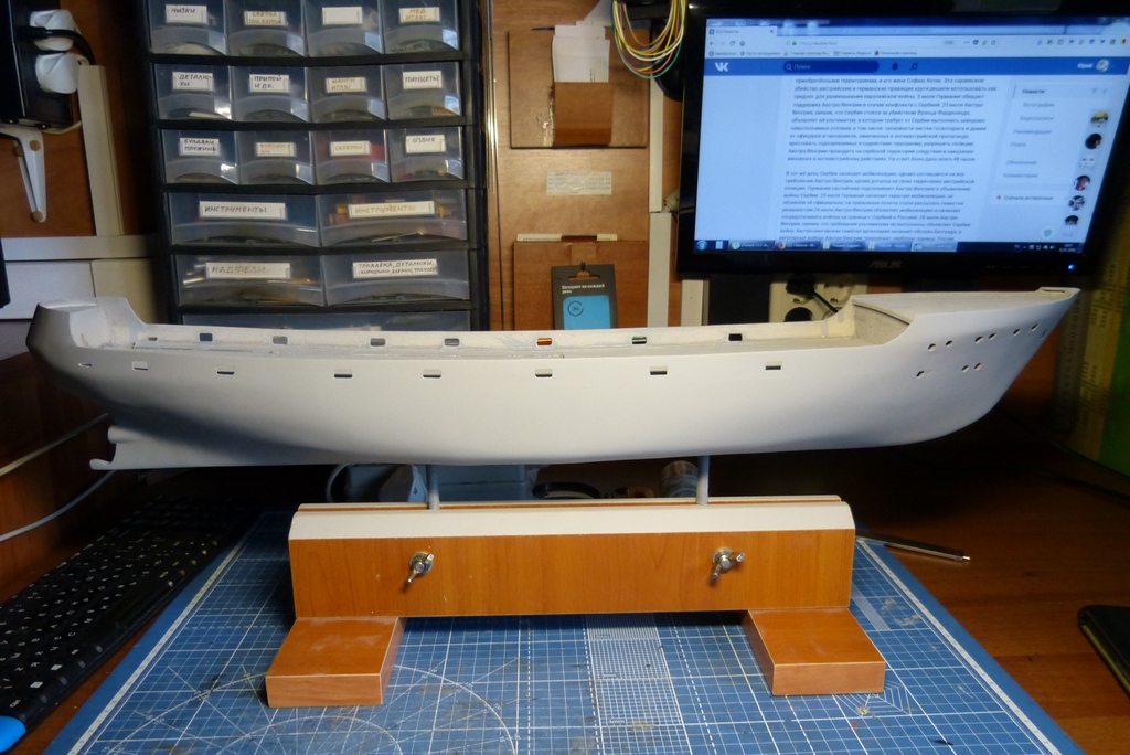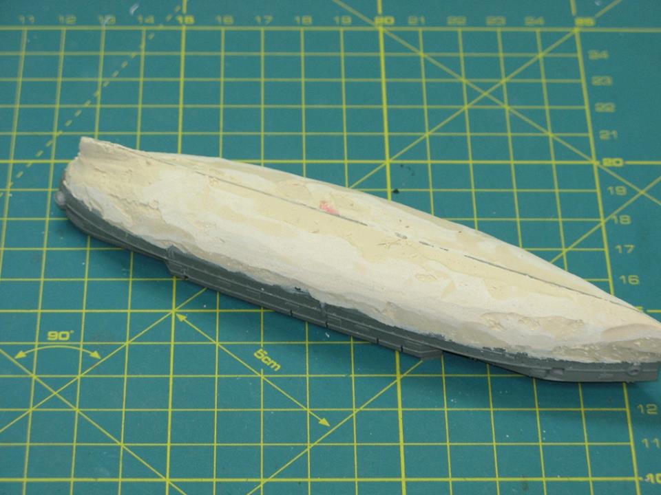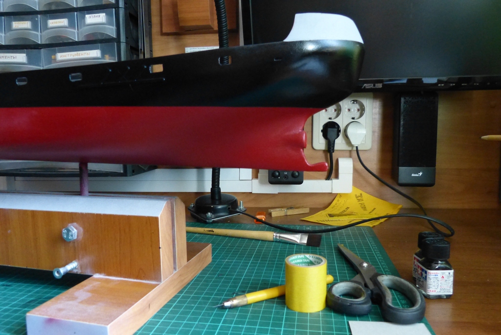 Эх, долго я не мог до модели добраться, а как добрался, то особо хвастаться и не чем было. А работа пусть и вяло (в том смысле, что очень медленно) но шла. Итак: корпус был обтянут в 4 слоя бумагой и в 2 слоя салфеткой, потом снова бумагой. Затем была наклеяна самоклеящаяся армирующая сетка и 2 слоя, как черновых, акриловой шпатлёвки с последующей шлифовкой. Впереди третий, и последний слой, чтобы выровнять корпус в двух плоскостях и подготовить его к обработке финишной двухкомпонентной шпатлёвкой и создать ступеньку борта на границе деревянно-медной подводной части с бортовой броней.