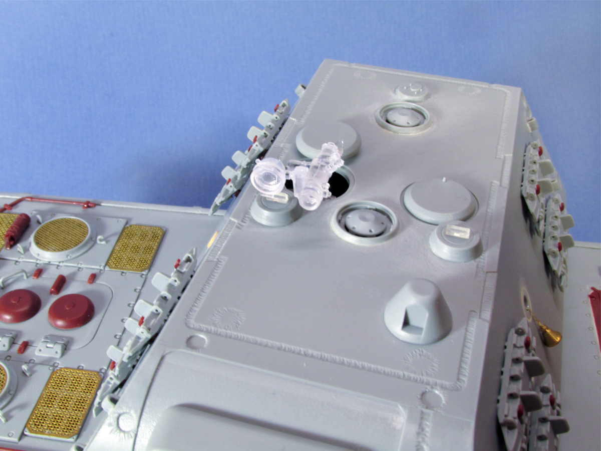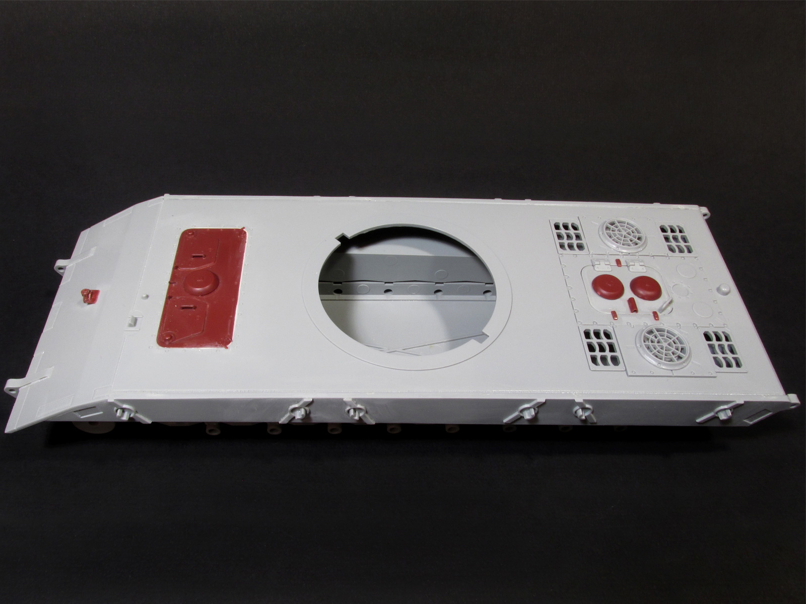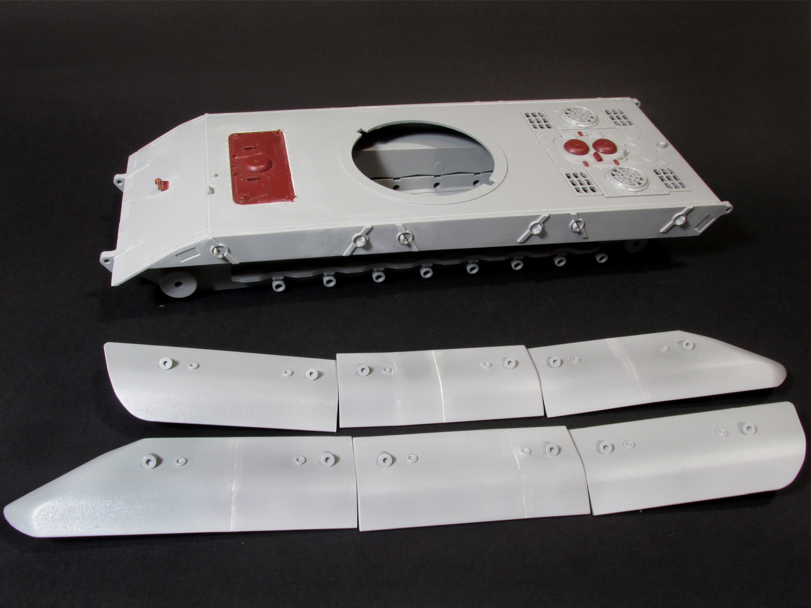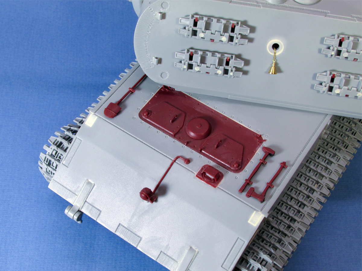 Всех с наступающим. Данный танк строю в ГБ в групп в ВК, решил продублировать строку и тут, может кто, что подскажет. Из того, что сделал: распилил экраны, удлинил первый и укоротил средний экран как должно быть. У Драгон они не правильной длинны. Крепления экранов на корпусе аккуратно срезал и перенёс на новые месте. За шпаклевал огромные щели образовавшиеся на корме при стыке. Срезал крышку мех.вода и радиста и поставил крышу со всеми деталями от КТ Менг. Поставил часть мелких деталей на корпус от КТ Менг. Т.к. у меня есть испорченная модель Менговского КТ то вся мелочёвка будет взята от туда. Вообще модель была куплена на барахолке достаточно давно за 2200р., когда Е-100 от Амусинг ещё не было. Сейчас бы конечно вряд ли бы стал покупать эту модель. Радость от обладанием Е-100 улетучилась как только начал собирать и сильнее углубился в данный танк. Мат. часть тут дно, стыковка так себе, присутствует заметное смещение прес. форм, деталировка печальная.