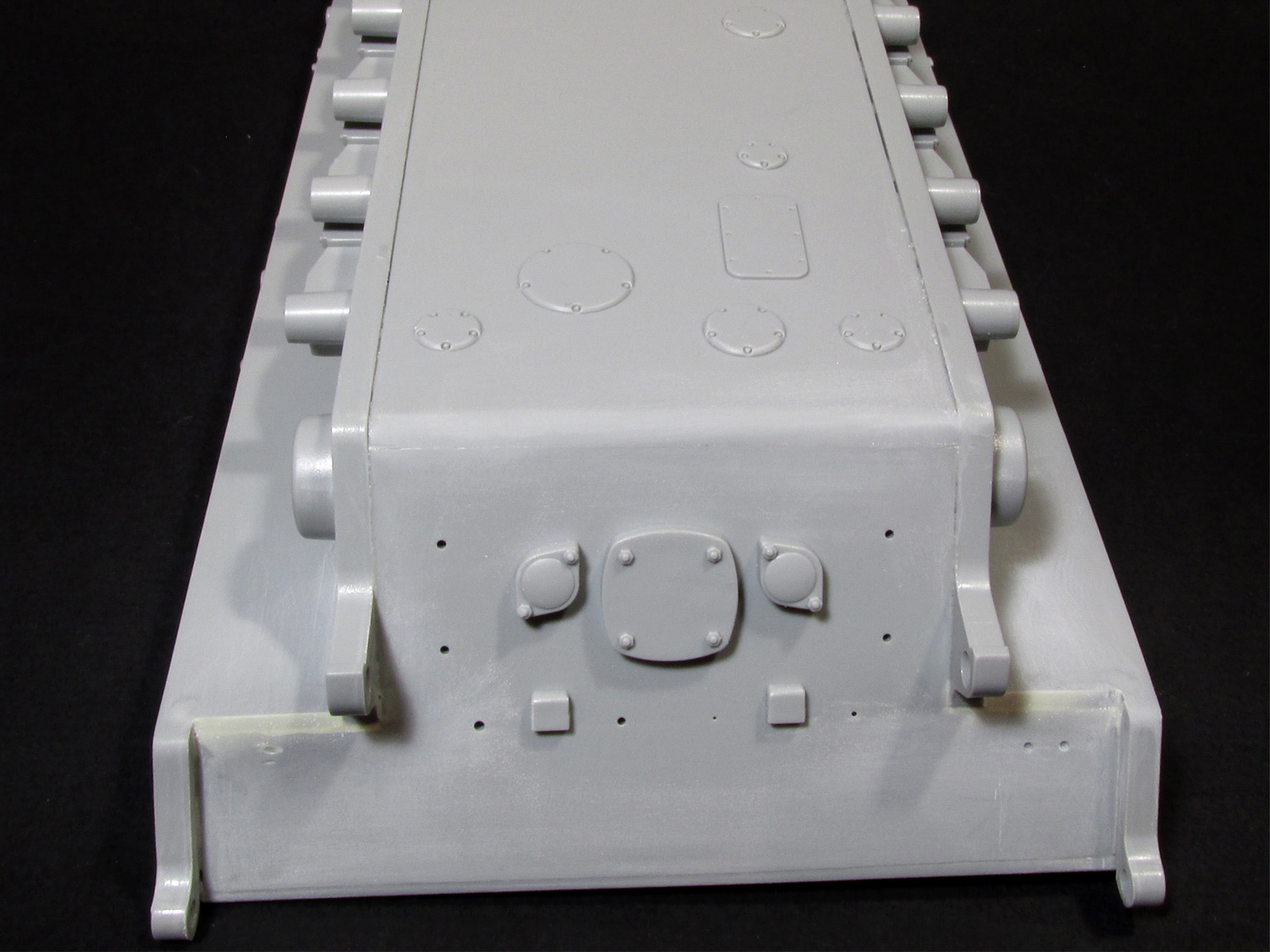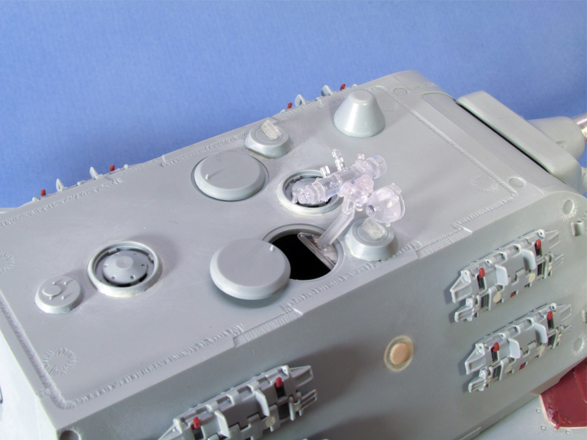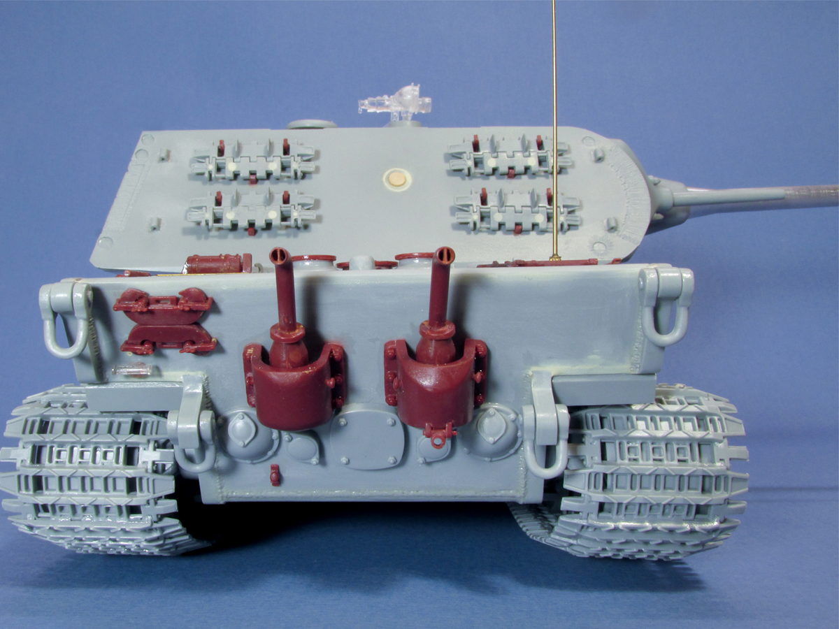 Закончил сборку Е-100 от Драгон. Из основных доработок по пластику: нарастил ВЛД с низу со всеми необходимыми элементами, добавил доп. бронировку на корме, переместил крепление экранов, перепилил экраны в правильный размер, добавил сварные швы. Заделал места для пулемётных яблок по бортам башни и добавил пистолетные порты. Из разбитого КТ от Менг взял всю мелочёвку и перенёс на Е-100 т.к. в наборе практически всё подобное отсутствовало или было плохо детализировано. Добавил точёную заглушку пистолетного порта, точённую антенну 35A02 RB Model и 35A15 RB Model, точённый ствол 35B16 RB Model, точённый пулемёт 35B38 RB Model. Дале грунтовка и нанесение камо.