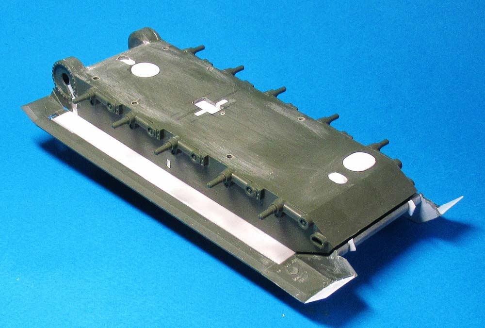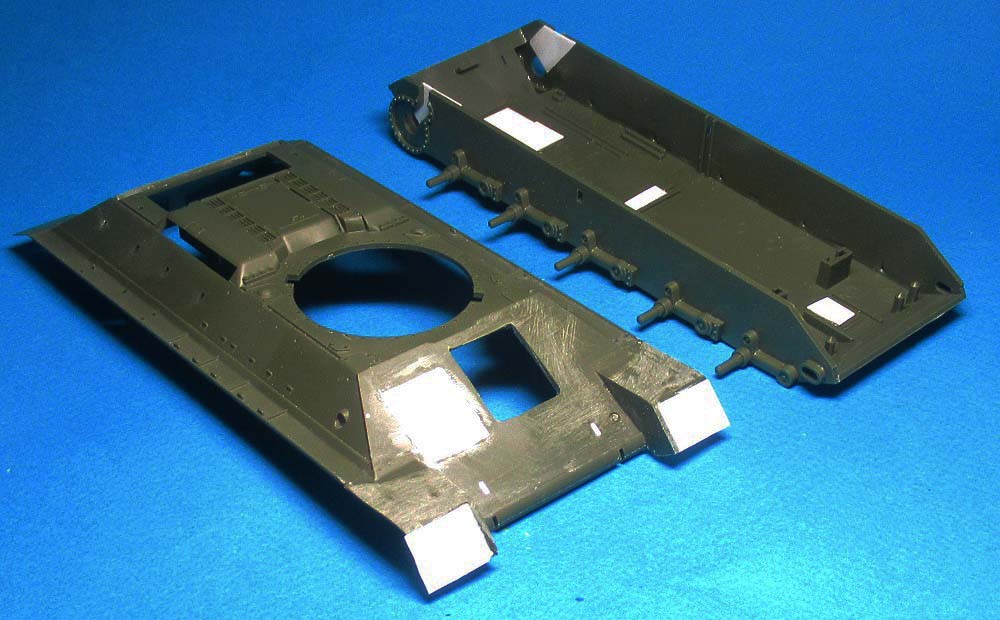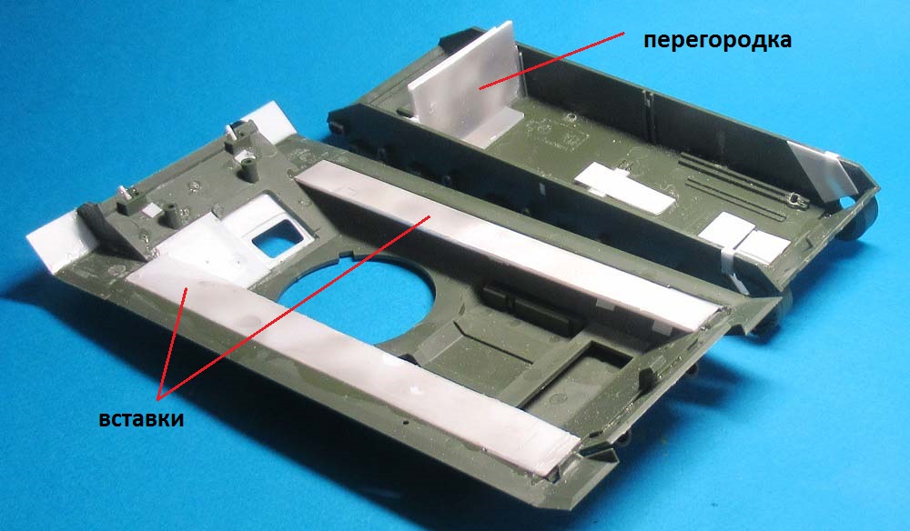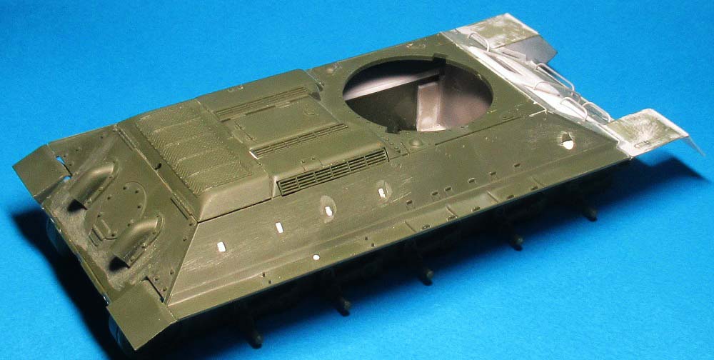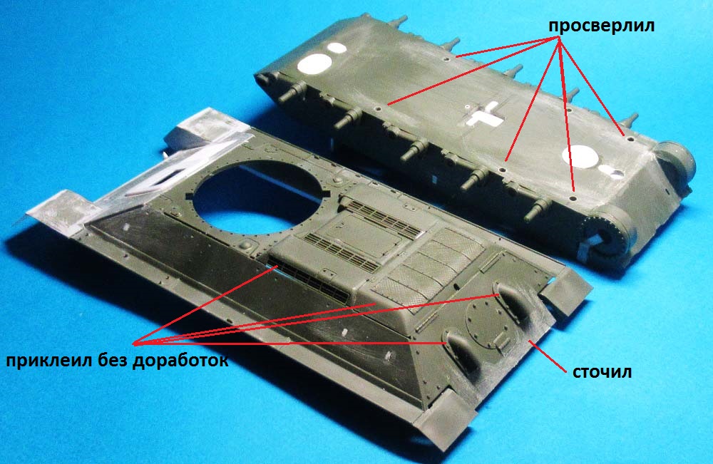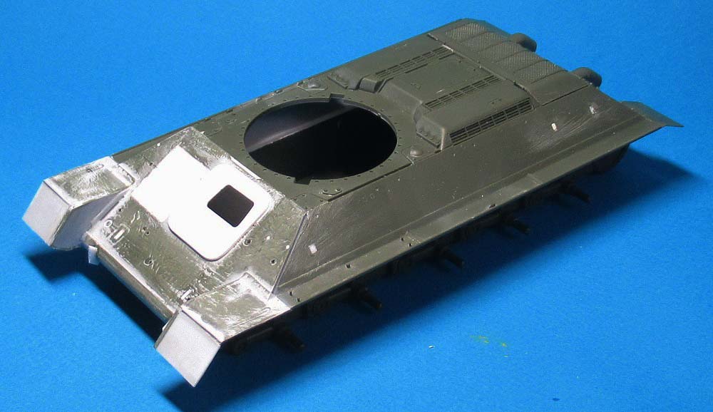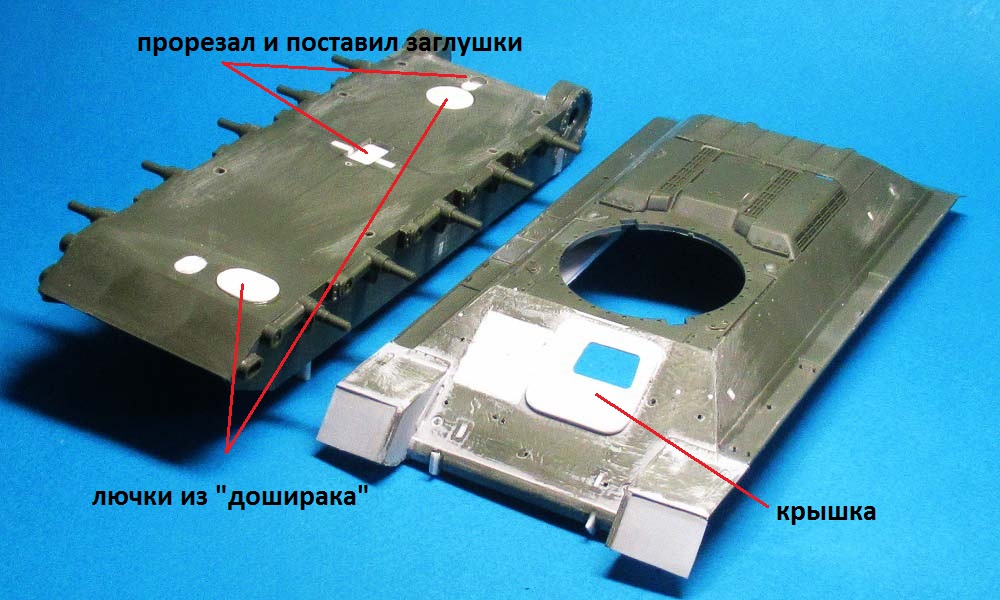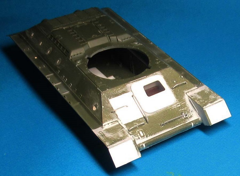 - на лобовом листе приклеил крышку (из двух частей) люка механика-водителя и просверлил отверстия под установку пяти поручней;