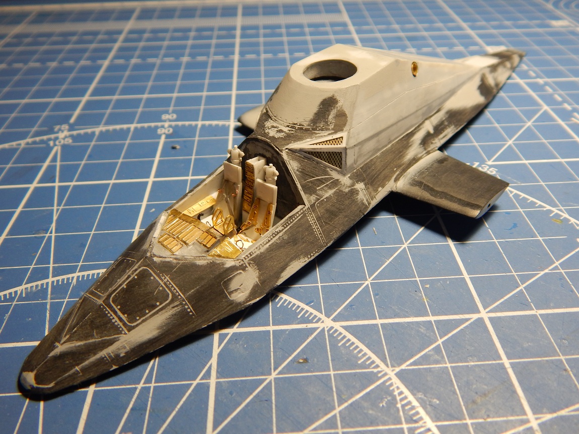 Заново изготовил нижнюю часть кабины, расширил и удлинил, т.к. в старую кабину не влазили по ширине - новые катапультные кресла пилотов, небольшая приборная панель между креслами и ручка "Шаг-Газ", плюс боковые поверхности управления были ну через чур огромными.