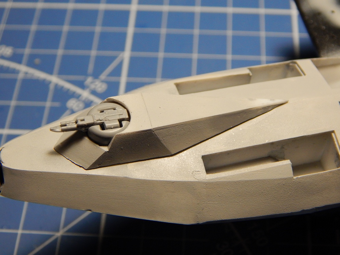Заодно попробовал изготовить новые воздухозаборники и гандолу под бортовые пушки, но это не окончательный вариант, буду делать лучше.