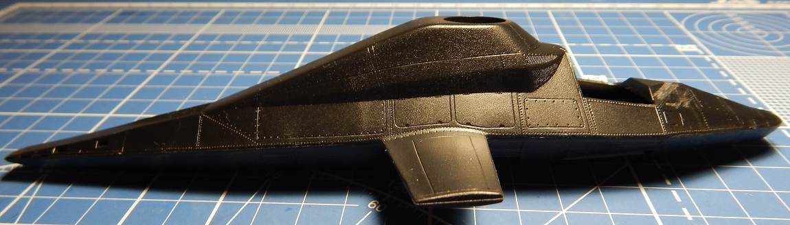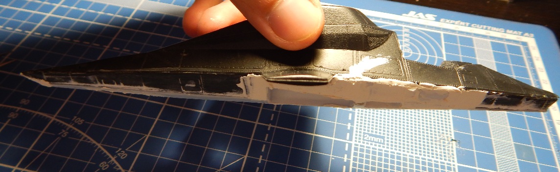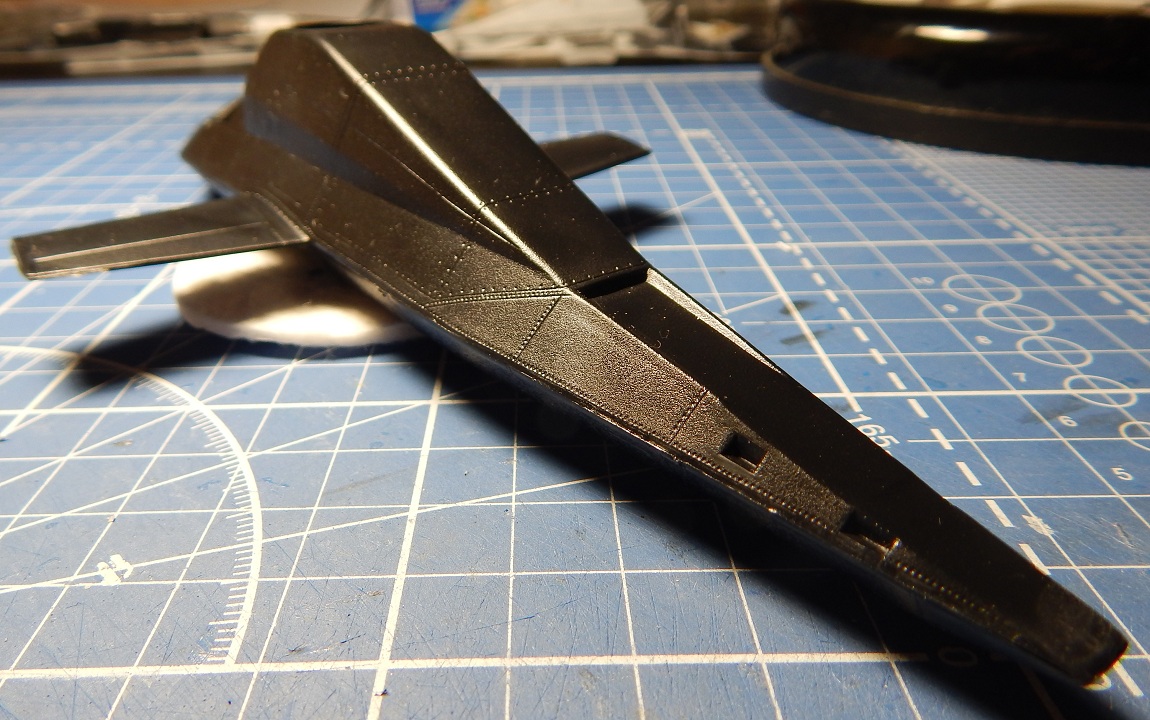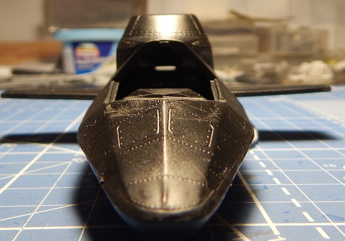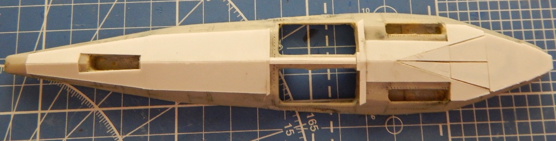 - Сточил, обклеил заготовками из листового пластика разной толщины, прошпаклевал и при помощи N-ного количества наждачной бумаги, доработал верхнюю часть фюзеляжа, спрямив её и вывел прямые "острые углы";